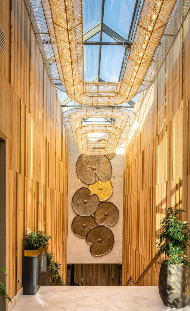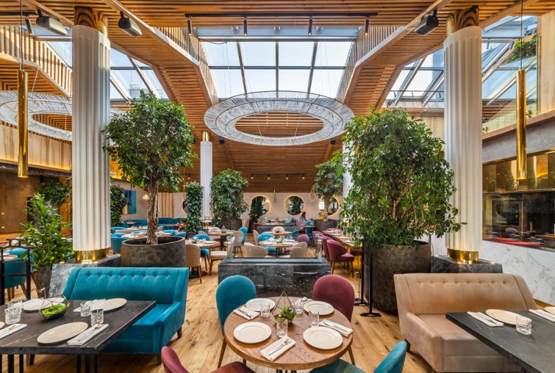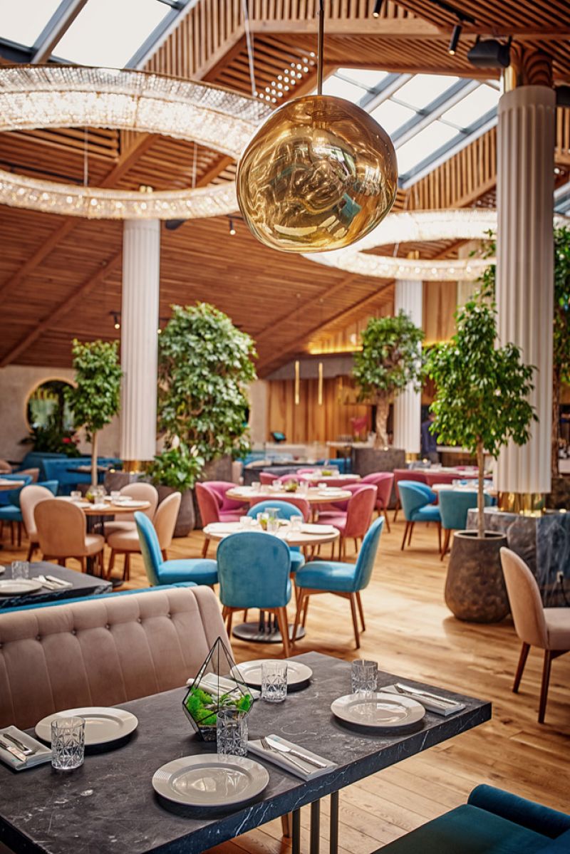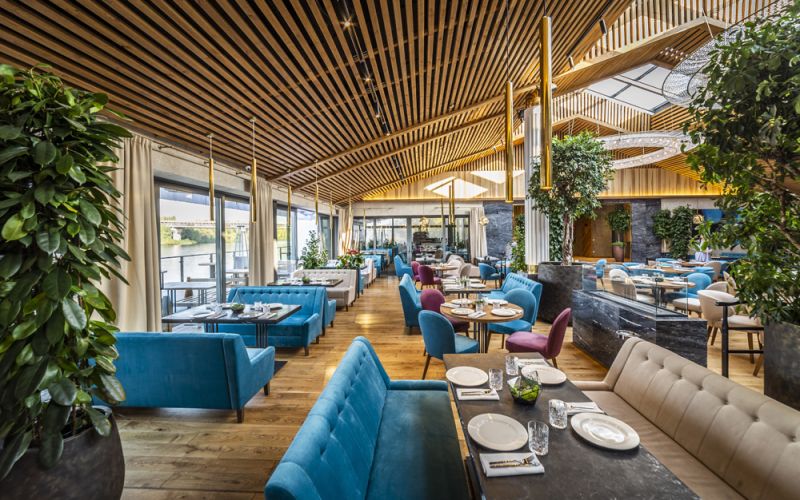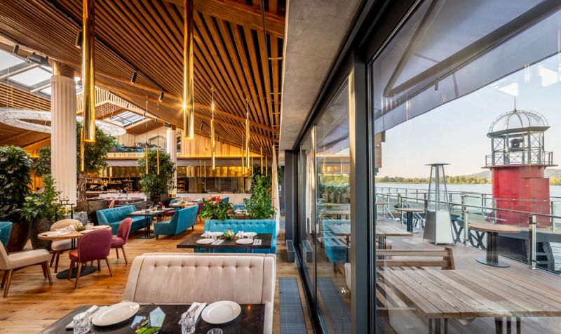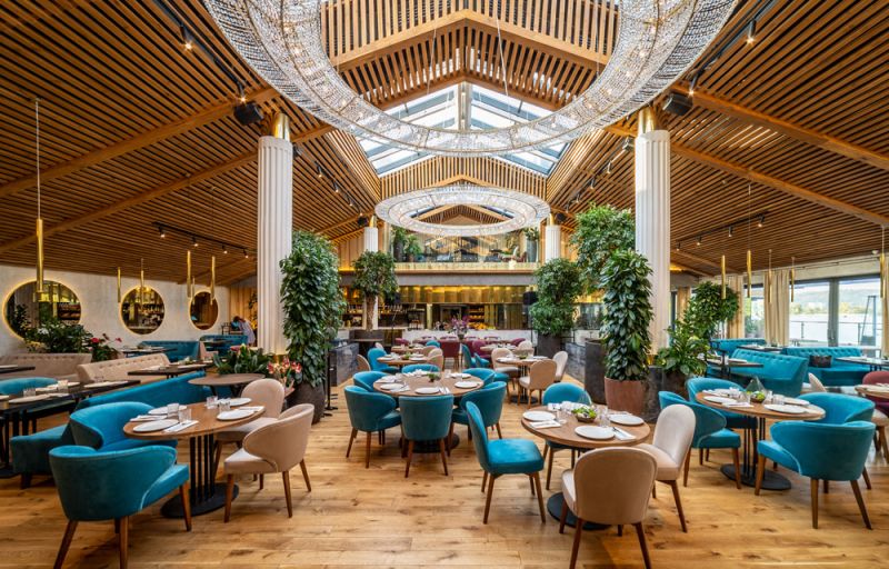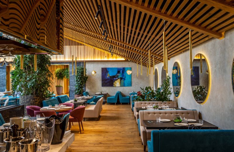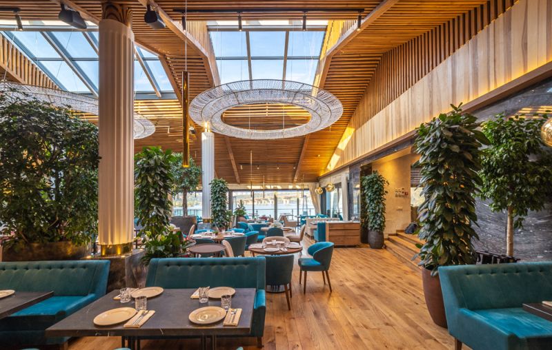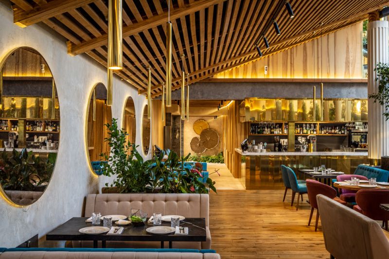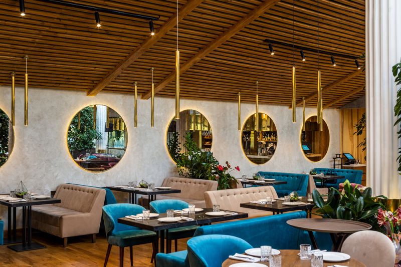 The restaurant's interior uses natural finishes, including brass and ash veneer. Brass adds shine and luxury to the interior, while ash veneer adds warmth and naturalness. Sofas in an azure shade create associations with water and give the interior a freshness and marine atmosphere.