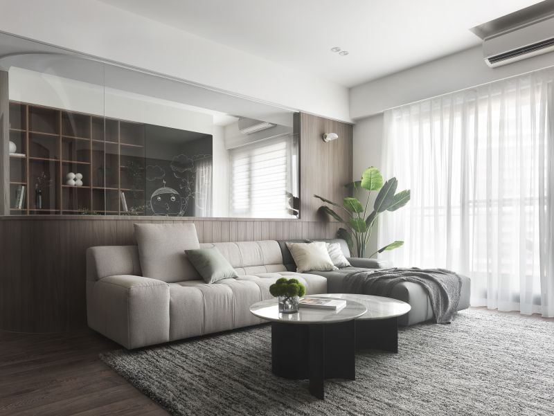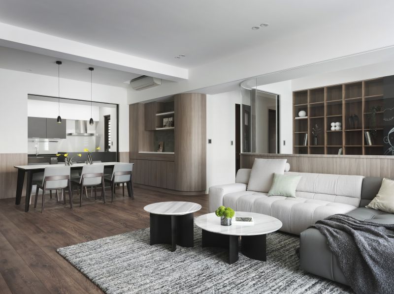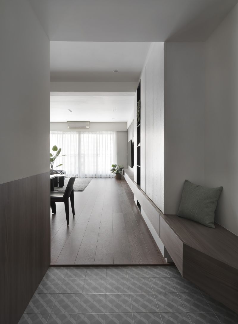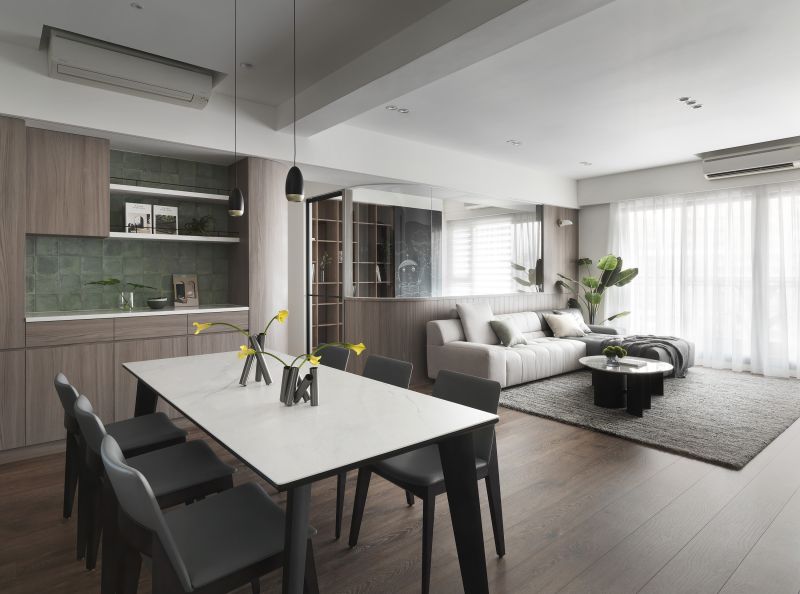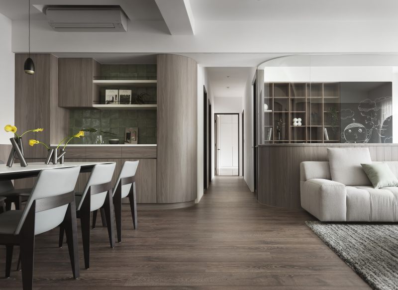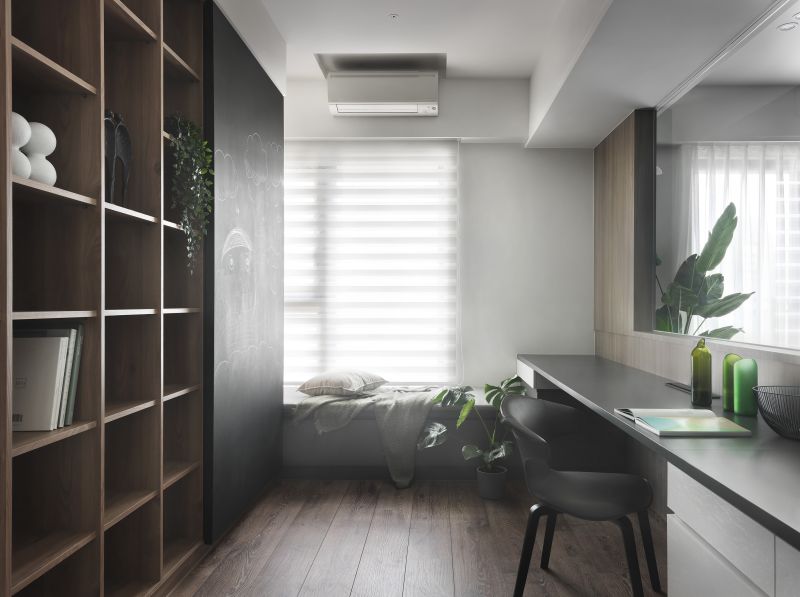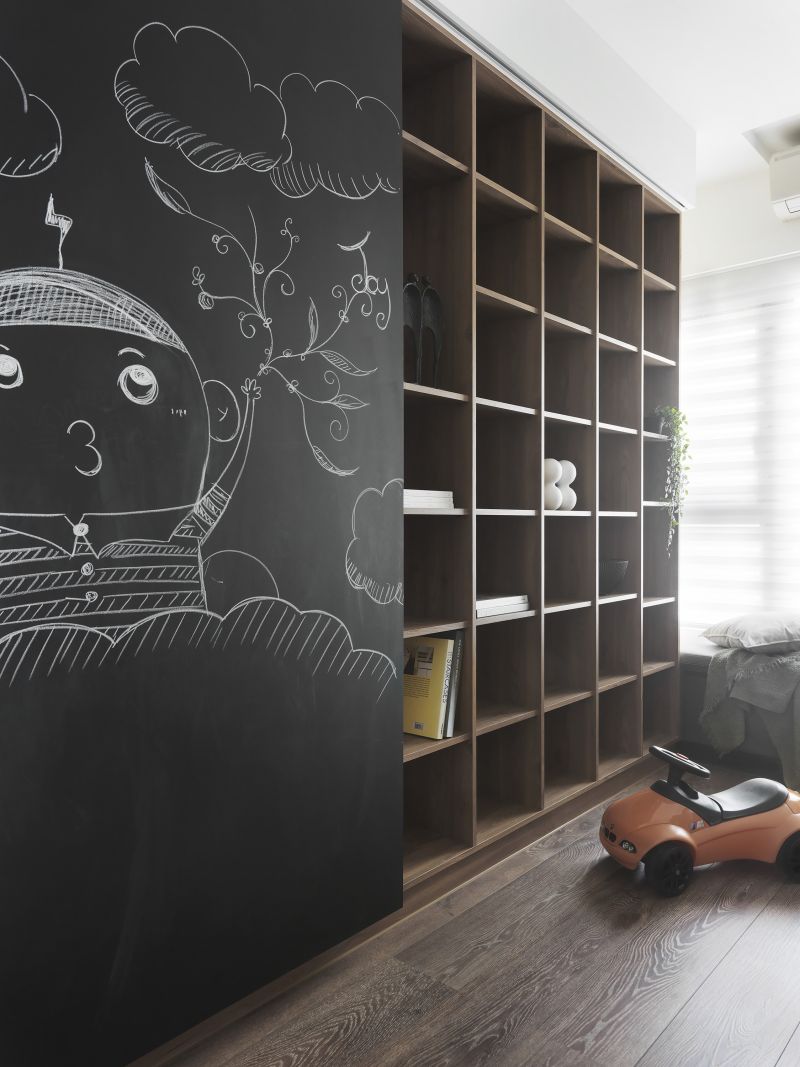 As the homeowners attach importance to their families, we set up transparent glass sliding doors to the kitchen and a half-glazed partition to the study to curate a semi-open patterned public space so that the parents can watch out for the young children while cooking or working and create excellent interaction flow simultaneously. Besides, the open built-in bookcase makes children pick books easily and cultivate good reading habits. Furthermore, the chalkboard door allows the kids to doodle as they like and express their creativity.