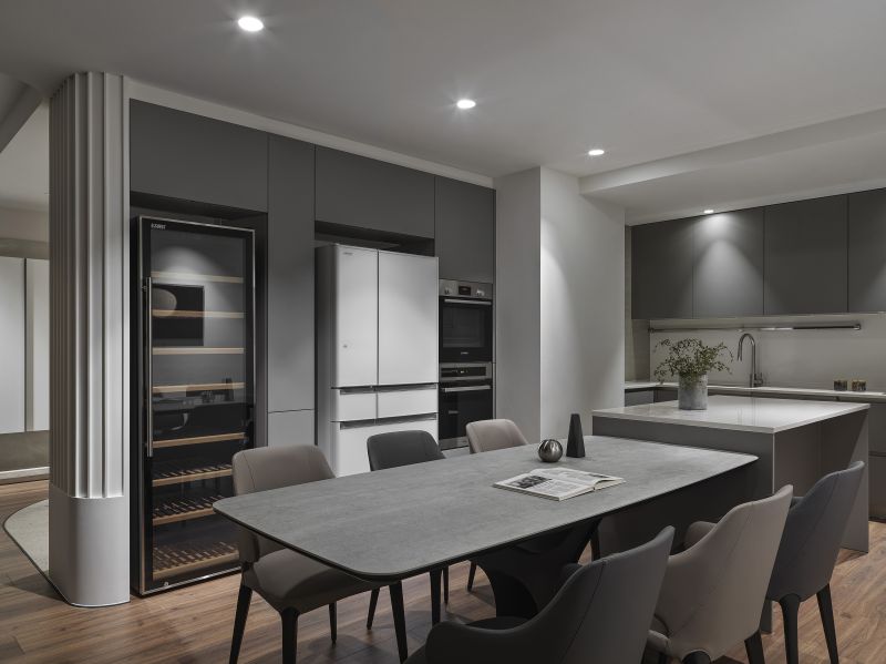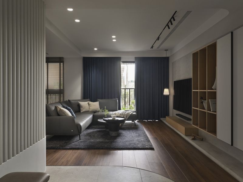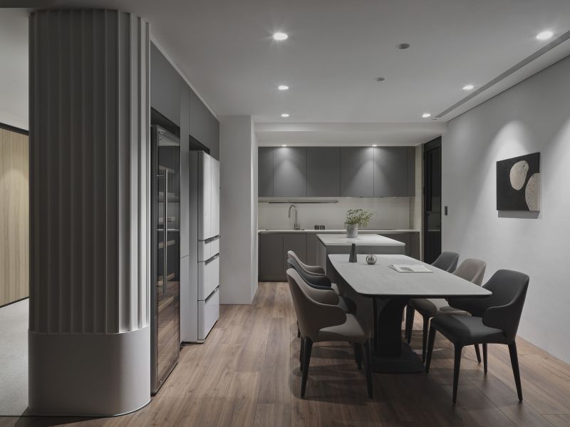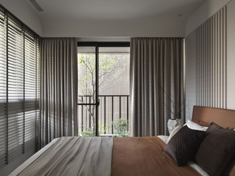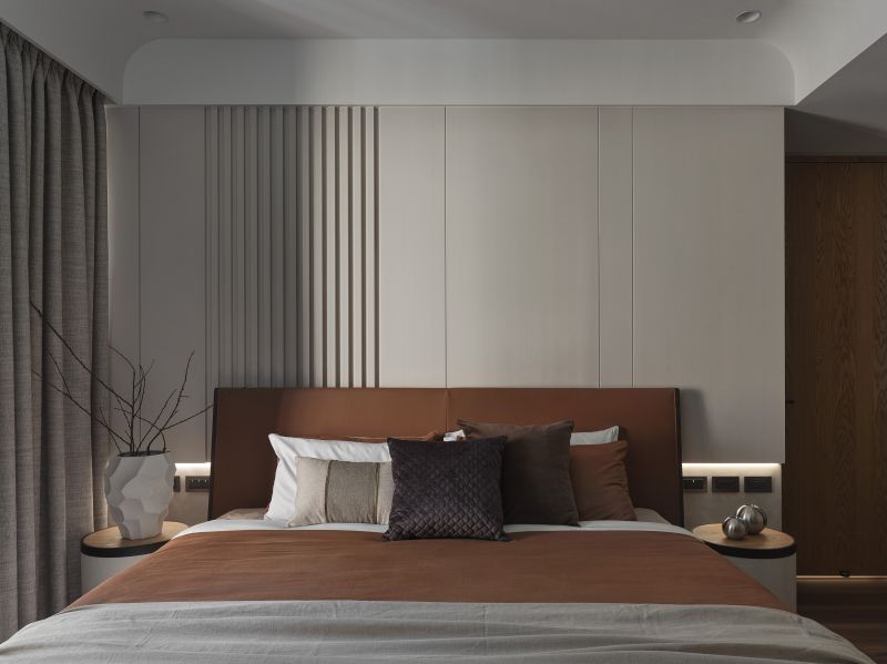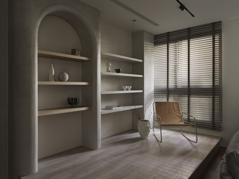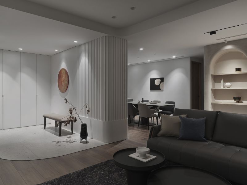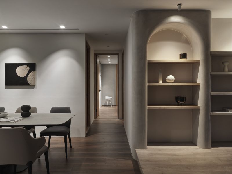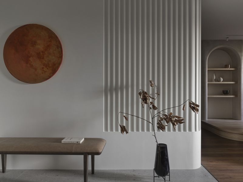 The overall design scheme showcases a variety of weathered textures in light-colored artistic wall coating, enhanced by the warm presence of wooden elements, offering a pure and unadorned beauty of Wabi-Sabi aesthetics. Harmoniously blending with the grounding hues of dark soft furnishings and the lush verdures of the courtyard. Addition, the linear and curved features found throughout the floors, surfaces, and ceilings introduce a gentle and mellow perception while creating a visually expansive effect, agreeably presenting a comfortable and spacious vacation retreat.