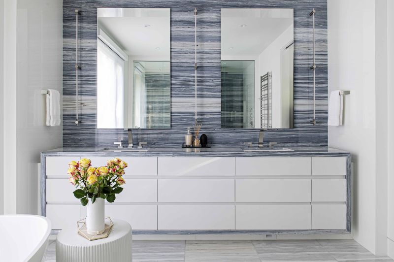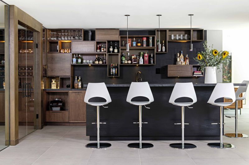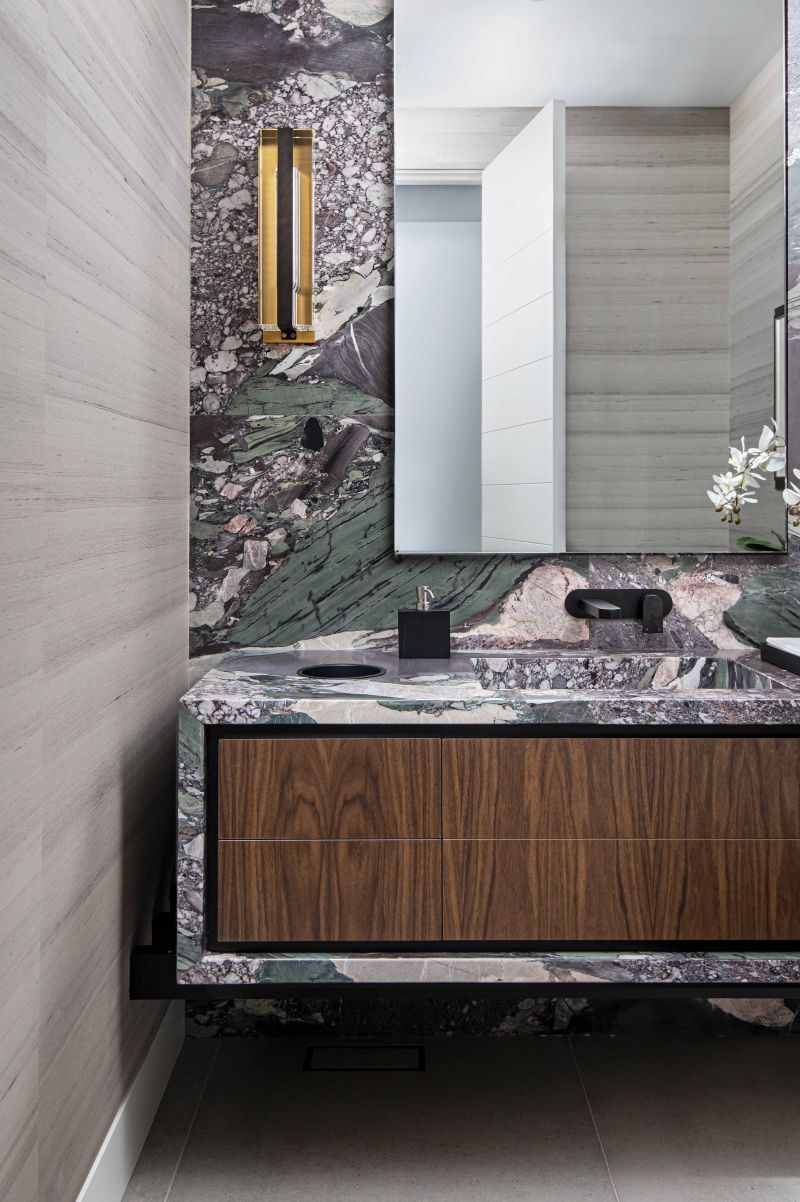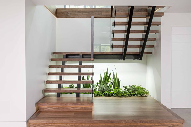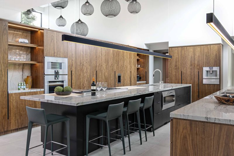 A choice palette of natural materials – wool, leather, engineered walnut – develops this connection between nature, architecture and interior. Each furnishing element directly contributes to the central theme, avoiding nonessential flourish in favor of clean, functional and uncluttered lines.