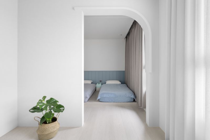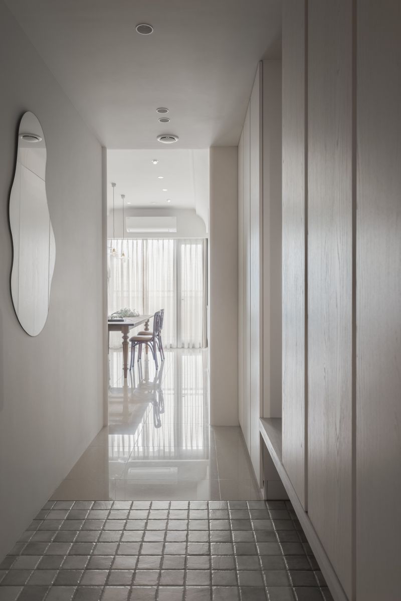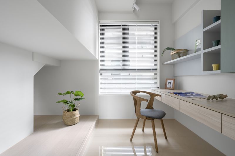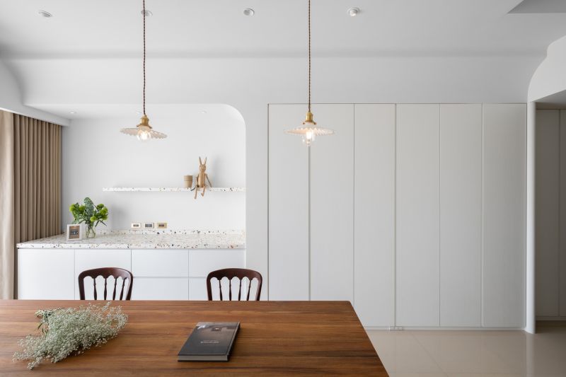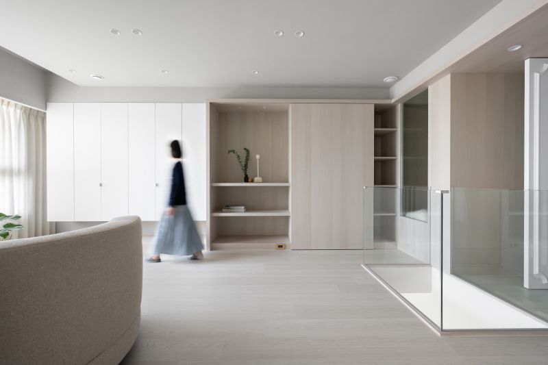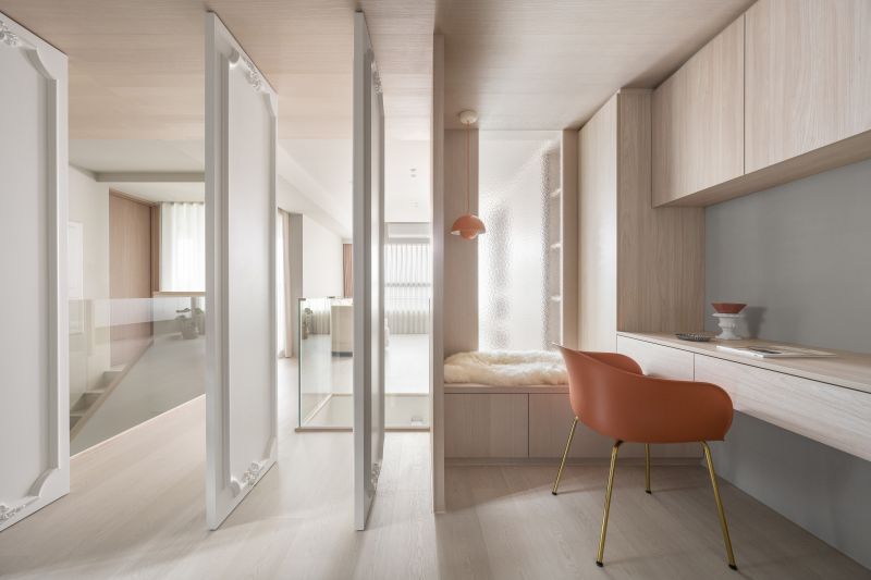 Pondering the homeowners' emphasis on daily family life and parent-child interaction, we strategically redesign the layout to make the dining room the hub of the home. Additionally, we expand the mezzanine to provide a full bedroom, bathroom, and study areas on both levels, giving each family member independent private space within the home. To further accommodate the multi-story and open layout, we thoughtfully integrate a lightwell above the entryway, enabling a passage for family members to communicate and pass objects, thereby enhancing the fun and interactive aspect of the space.