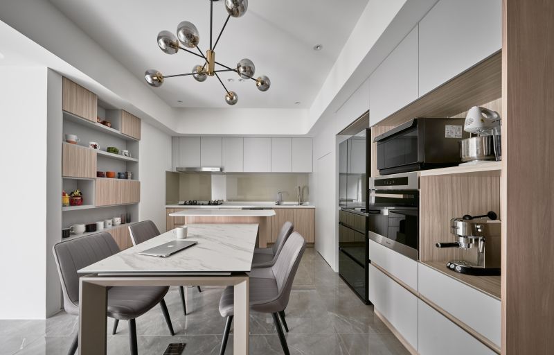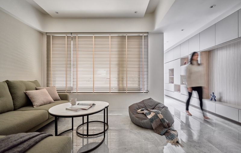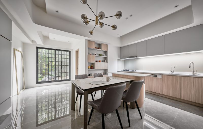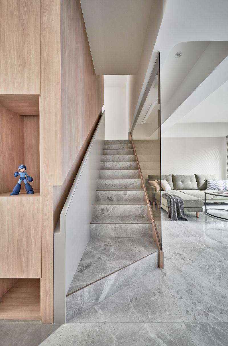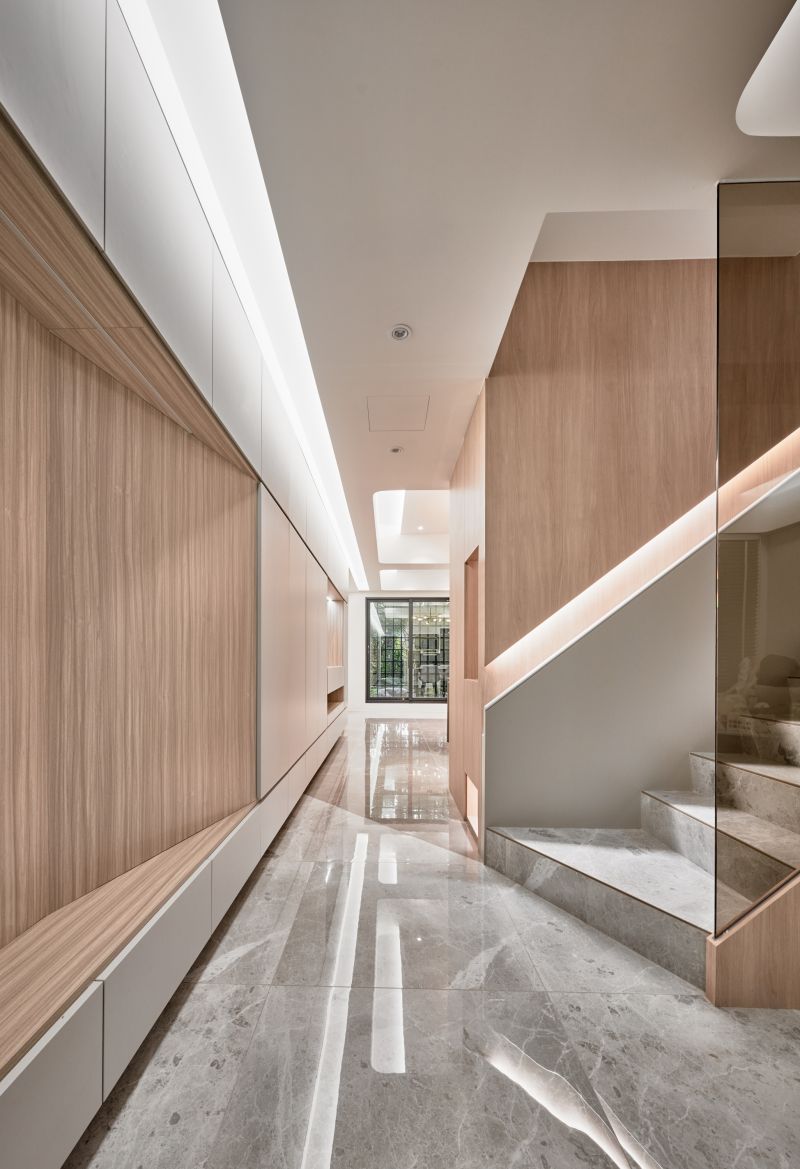 The warm sunshine falls from the skylight-roofing window at the entrance, rendering the gray glazed porcelain tile floor and reflecting gentle radiance marvelously brightening up the space. We attach importance to creating storage spaces and connected areas. Set up transparent staircases to bring a roomy and airy situation. And then, configure an open, adjoined, concordant entryway foyer, living room, and dining area through the same-colored cabinets and strip light fixtures. At the rear of the space, the outdoor greenery scenes leave the guests a beautiful and welcoming impression.