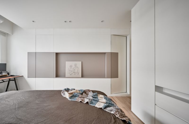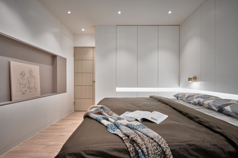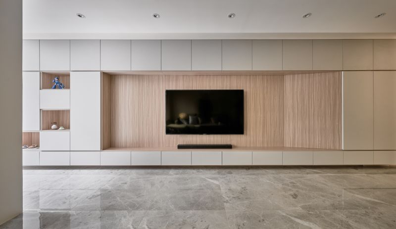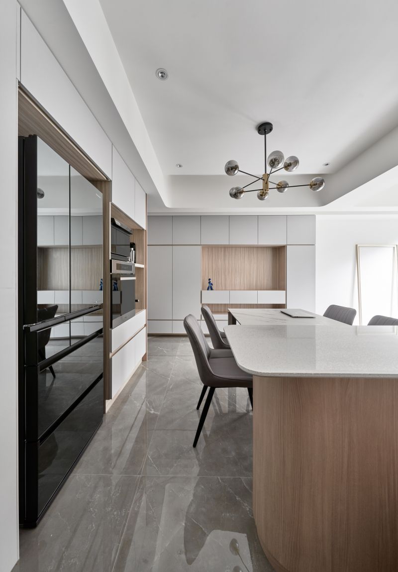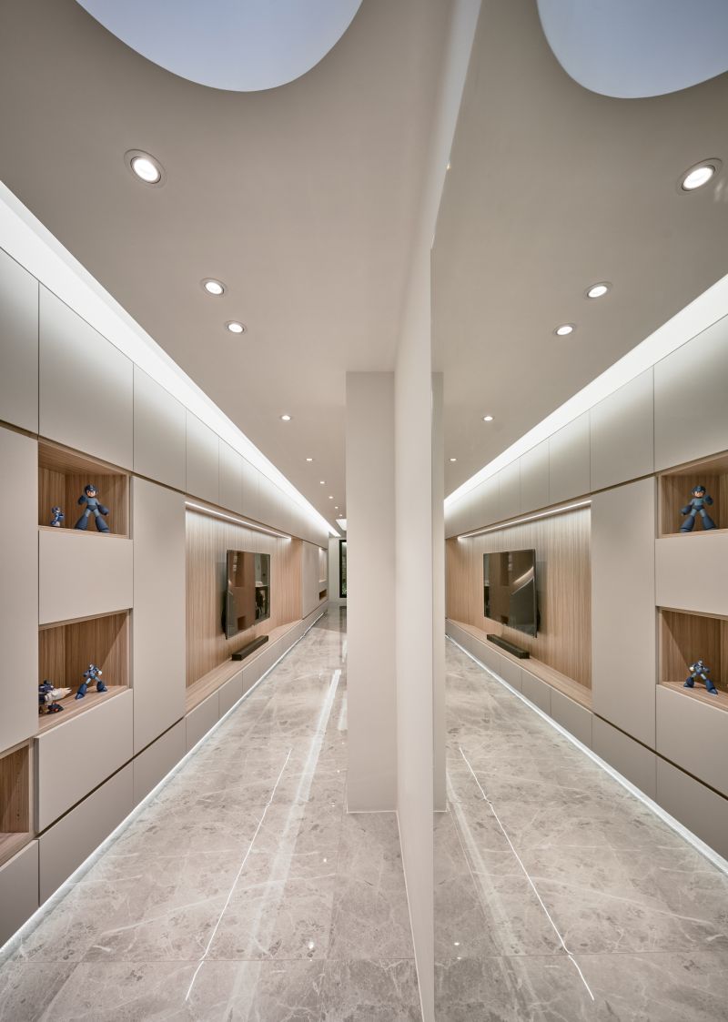 The warm sunshine falls from the skylight-roofing window at the entrance, rendering the gray glazed porcelain tile floor and reflecting gentle radiance marvelously brightening up the space. We attach importance to creating storage spaces and connected areas. Set up transparent staircases to bring a roomy and airy situation. And then, configure an open, adjoined, concordant entryway foyer, living room, and dining area through the same-colored cabinets and strip light fixtures. At the rear of the space, the outdoor greenery scenes leave the guests a beautiful and welcoming impression.
