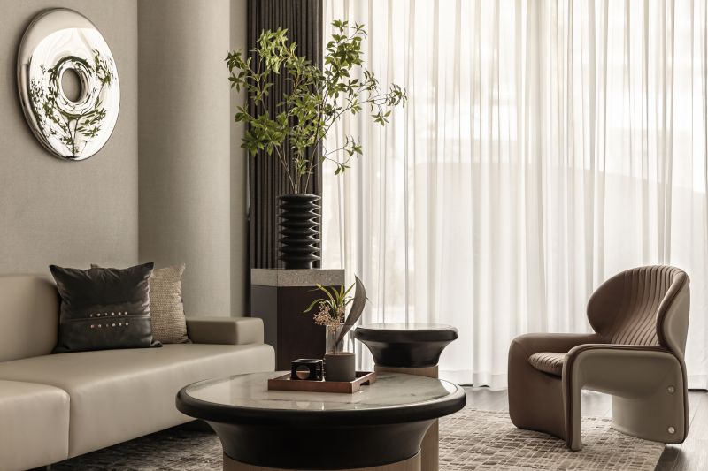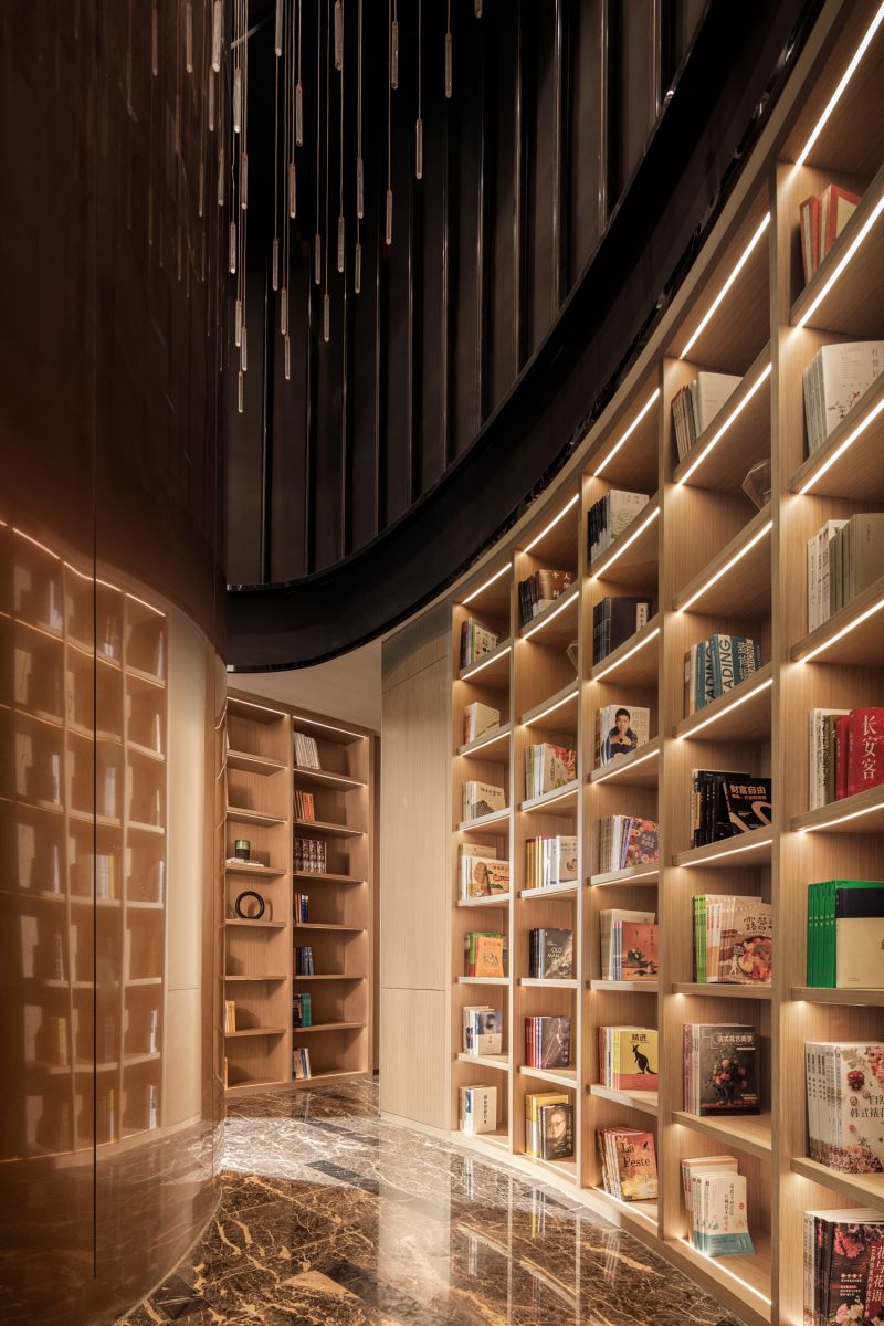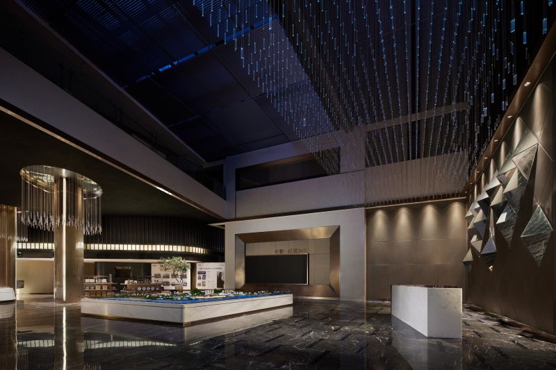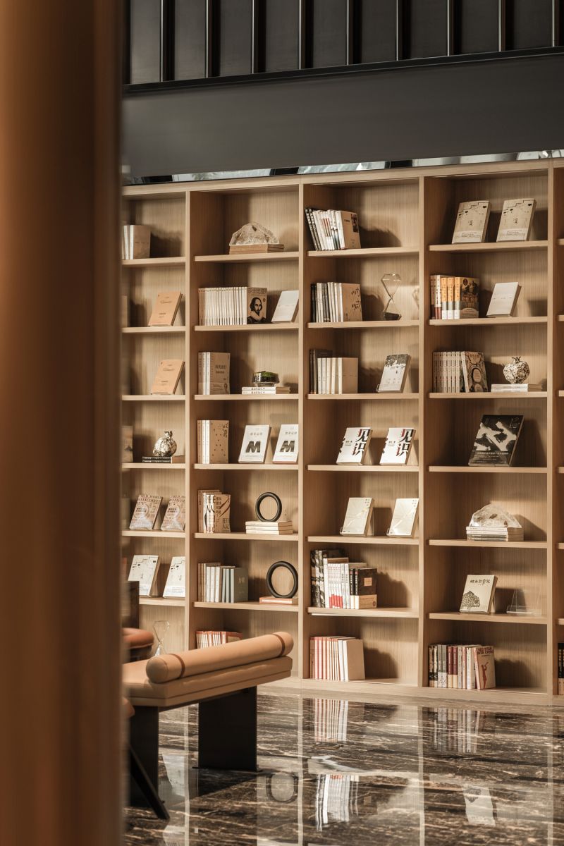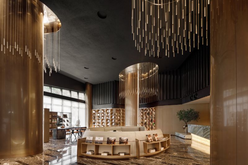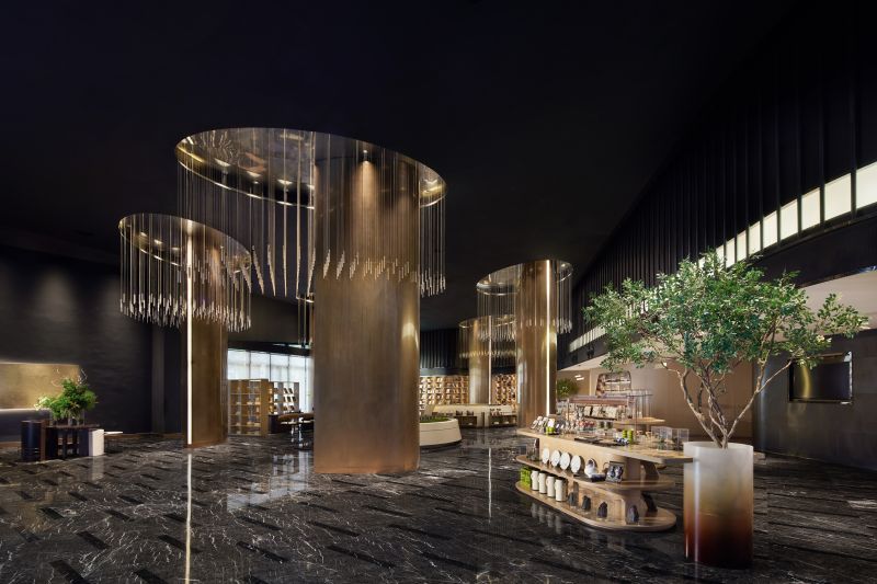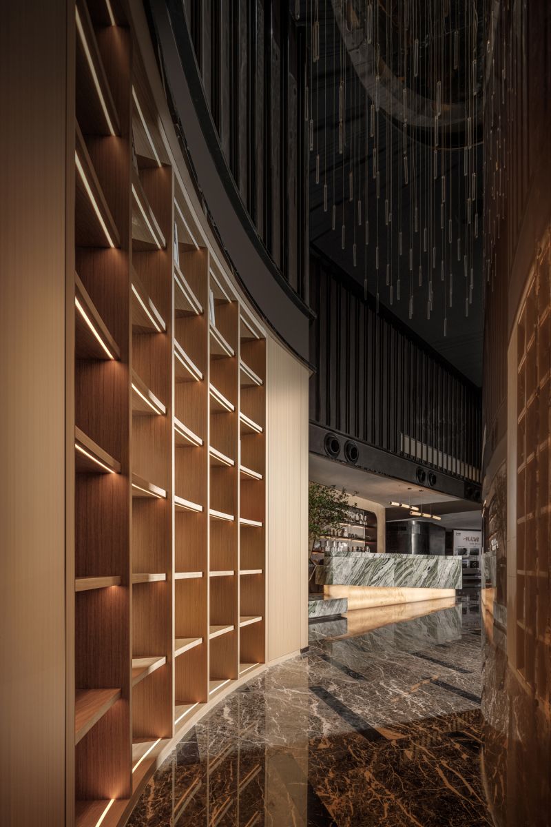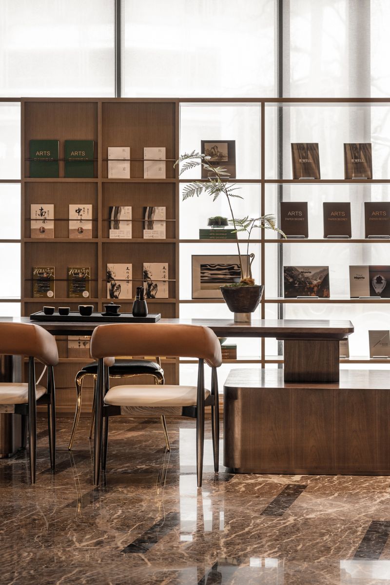 In the modern concise tea area, Chinese-style decorations are displayed in prominent positions, resulting in a strong visual impact and an integration of traditional Chinese decor and modern fashion. To enhance the visual effect, the bar counter is clad with emerald green marbles with neat lines, which looks dynamic under changing light and shadow, creating a warm and balanced ambiance against the wooden curtain wall.