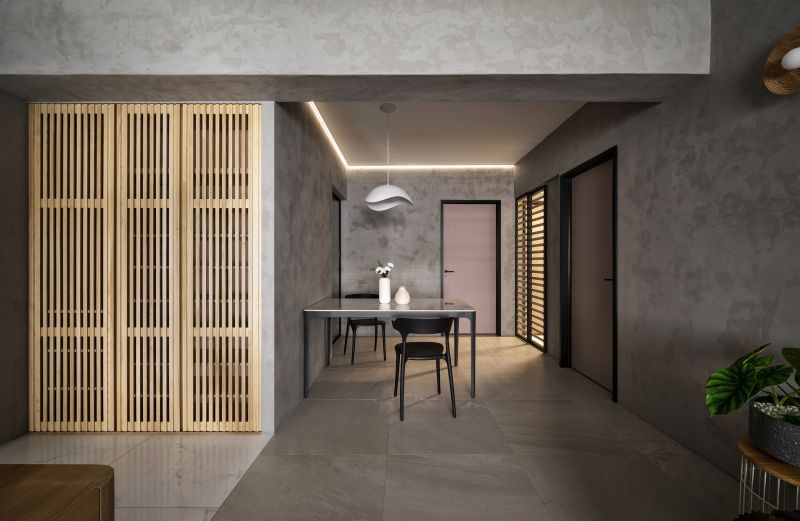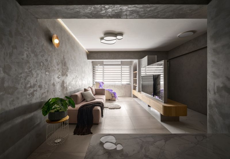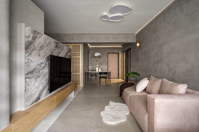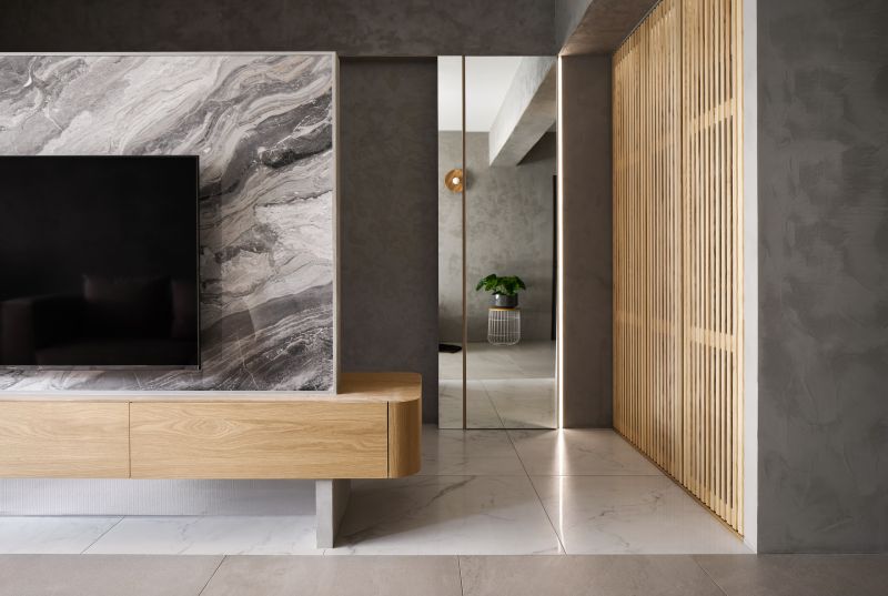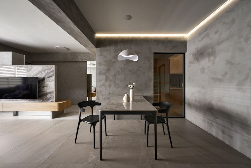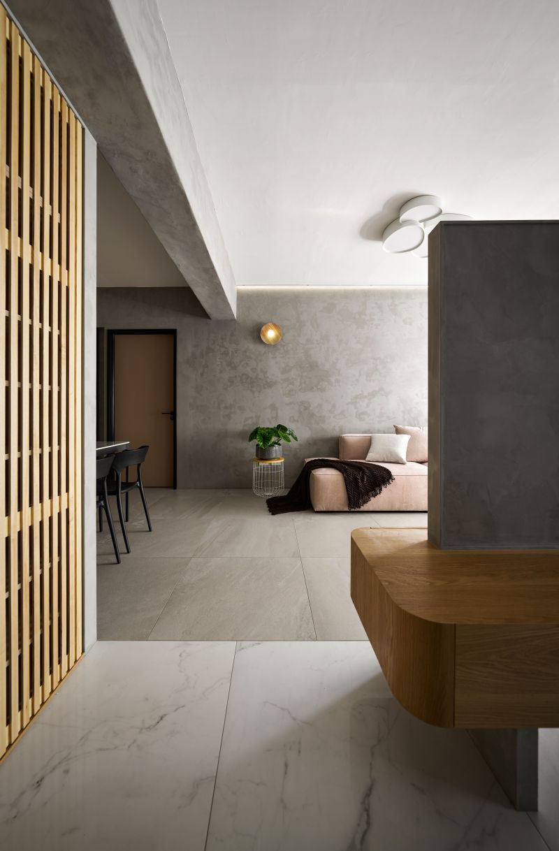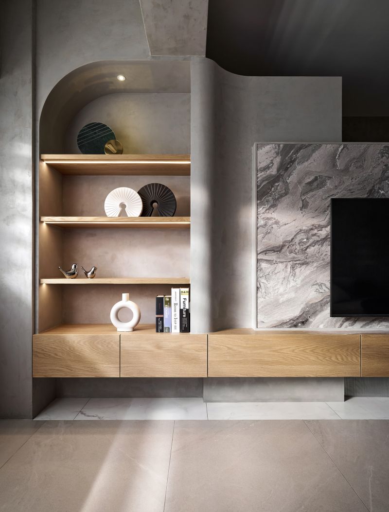First, the grayscale artistic coating creates patterns as splendid as fur patterns of Scottish Folds, offering cat a sense of belonging. In addition, to give the cat enough spaces to move around, the original layout has been redesigned to create a larger public area. Besides, the top of the TV wall is hollowed so the cat can jump through easily as it is not a full-height wall. In the main scene, the curved surface, the flowing cabinet, and the rounded platform add rich layers to the TV wall. Enveloped in a wabi-sabi atmosphere, the houseowners can get fully relaxed and unwind gradually.