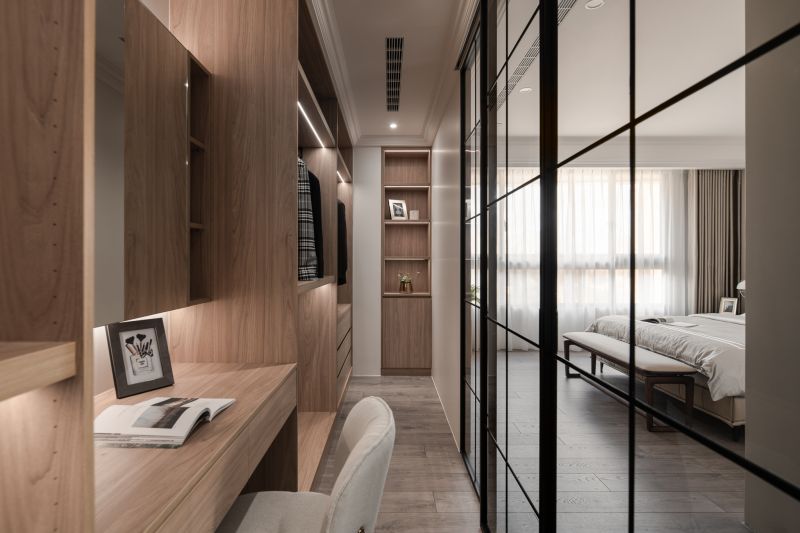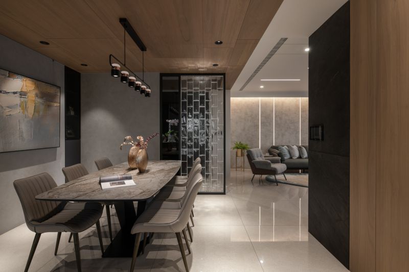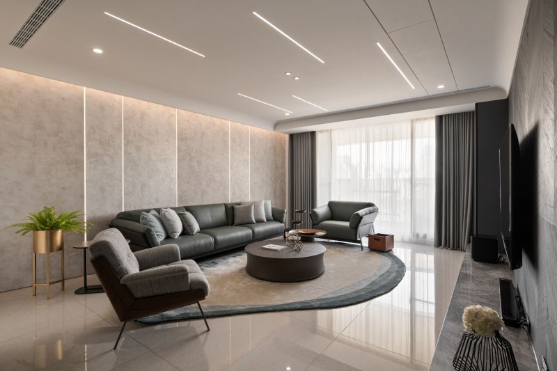 The charcoal gray slate tile spreads out the main scene, deliberately breaking the connection between the textures. The staggered splicing pieces retain the delicate gaps and offset the sense of spatial oppression. To echo the theme, the lower level stands a light gray TV cabinet that touches the floor, and the color gradients add details and a touch of sophistication. The natural pureness and lightness offered by the earthy color of the wall behind the sofa can help to evoke a delicate sense of clearness under the diffusion of light.