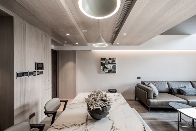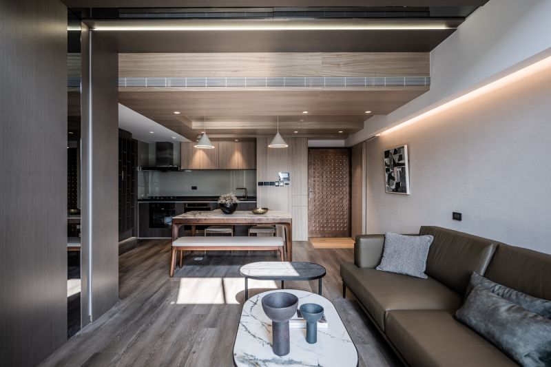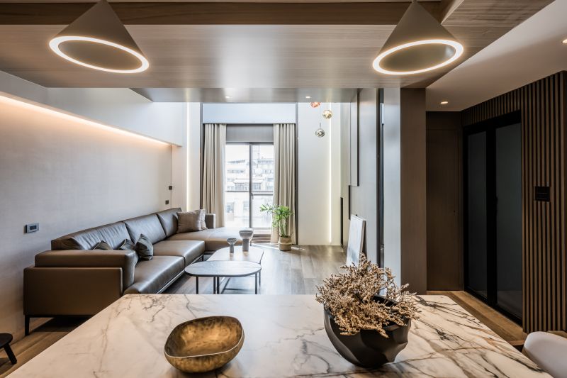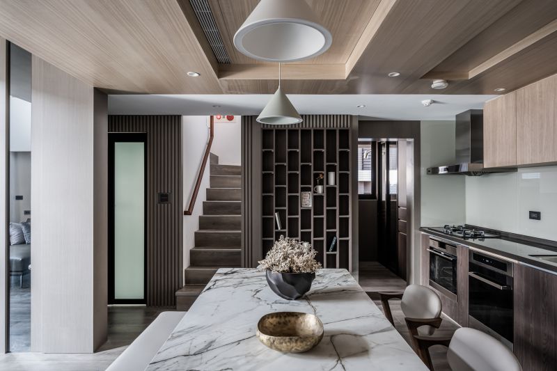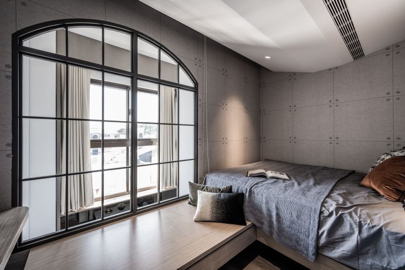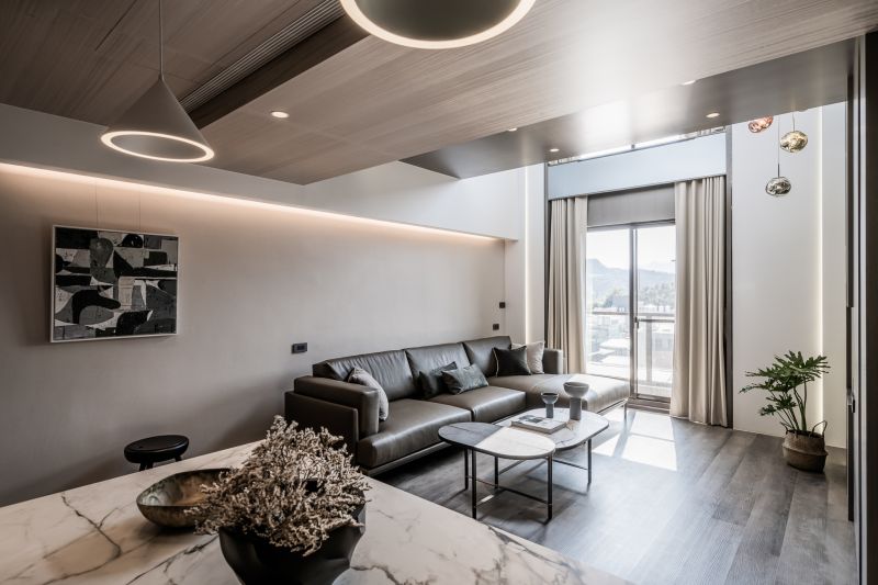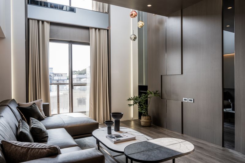 The project situated on the seaside hill slope faces the limitation of the site, 498 square-feet only. Thus an exceptional design of stacking floors comes up, becoming a building of 5, 6, and 7 floors. A spatial rejuvenation is born through verticality. The living room ceiling extends towards the TV wall, mirroring the mountains it looks over. The gradually ascending ceilings foster an atmosphere reminiscent of a valley amidst mountains, in perfect harmony with the view of Keelung through the windows.