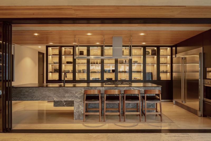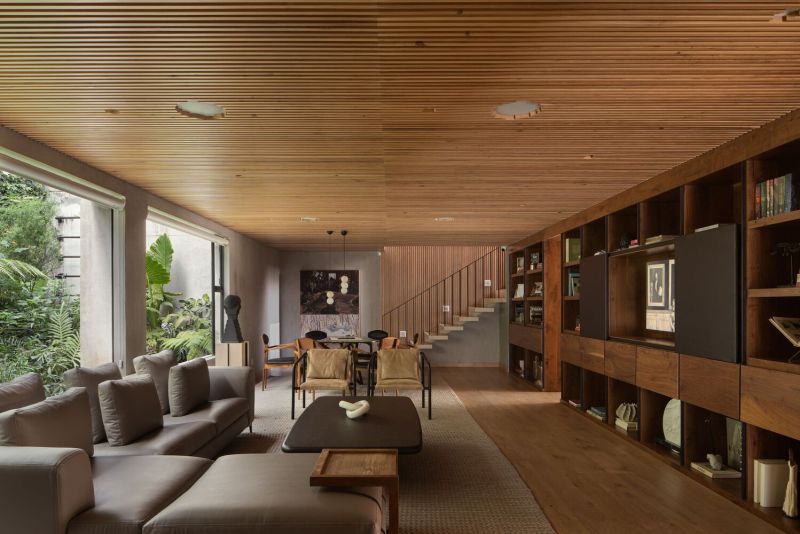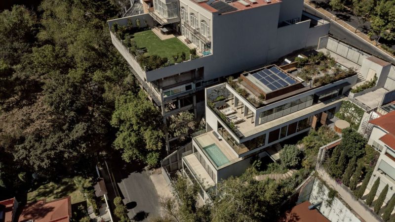 Located to the west of Mexico City, Casa Madre is a single-family residence that is perceived as a concrete sculpture sculpting the terrain. It is composed of five staggered volumes in response to its sloping topography. This arrangement allows each of its levels to create openings and direct its views toward the landscape and treetops.