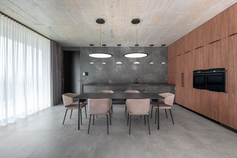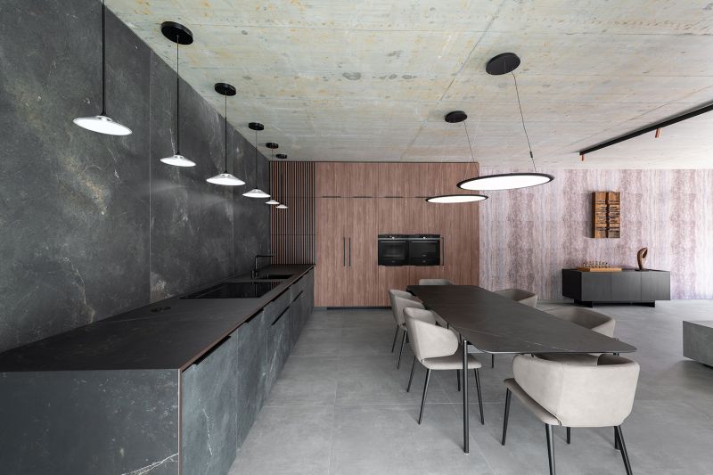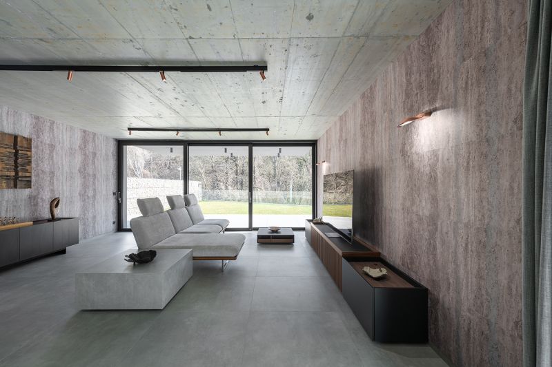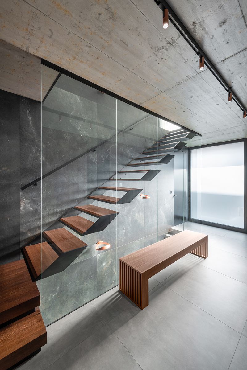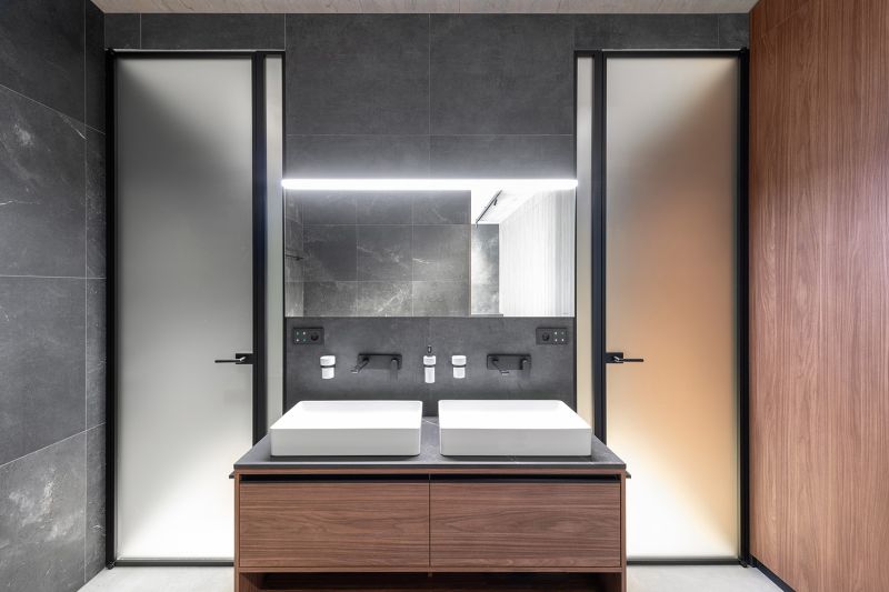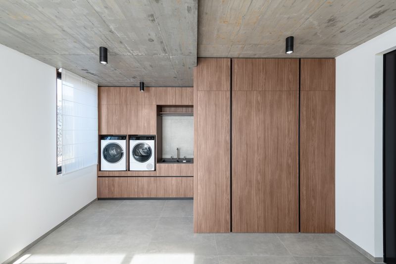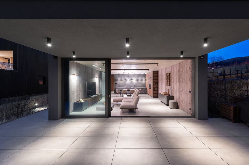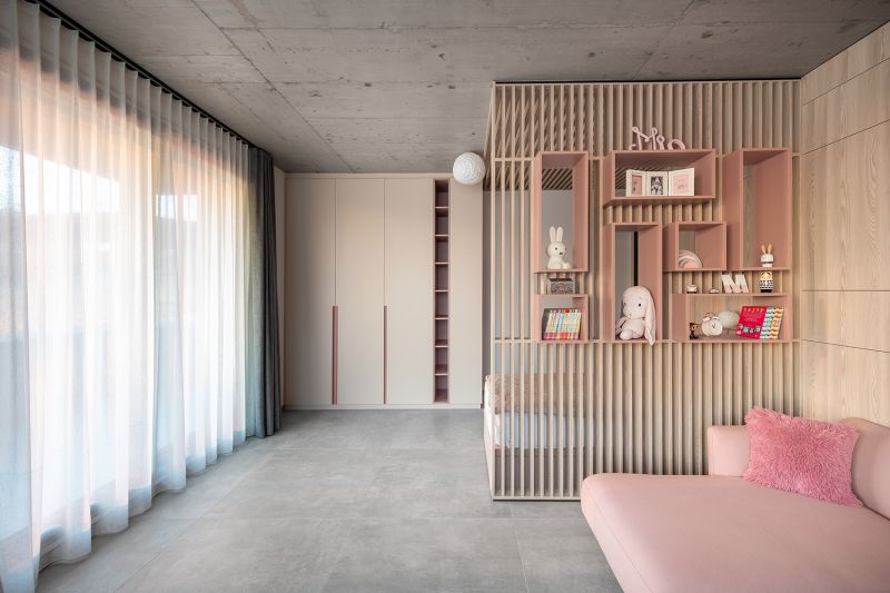 Two-storey family house was built with a minimalist and modern design that emphasises a connection with the surrounding nature. It features natural looking materials combined with high-end technology. Partially cladded with stone-look tiles open kitchen and taller wood decor cabinets dining are linked directly to the living area with free-standing furniture maintaining so a comfortable and large quality of space. The en suite bathroom's complete open concept with no division from the bedroom area creates a more fluid-like spatial feeling and kid's room lighter colour palette softens the image.