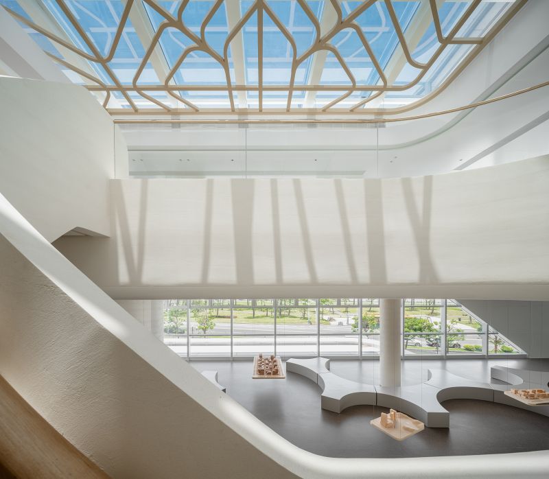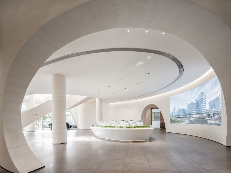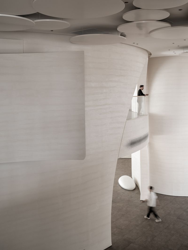 The first and second floors form a 10-meter-high open building space. We have creatively abstracted the dynamic movements and angles of fish leaping and applied elliptical curves based on the proportions of a fish's body curves. These curves are thoughtfully distributed on the facade, bridging the gap between the open void and functional areas. This creates a series of arched doorways with varying curvatures and angles, resembling fish-like shapes, which are interspersed within the interior of the building.