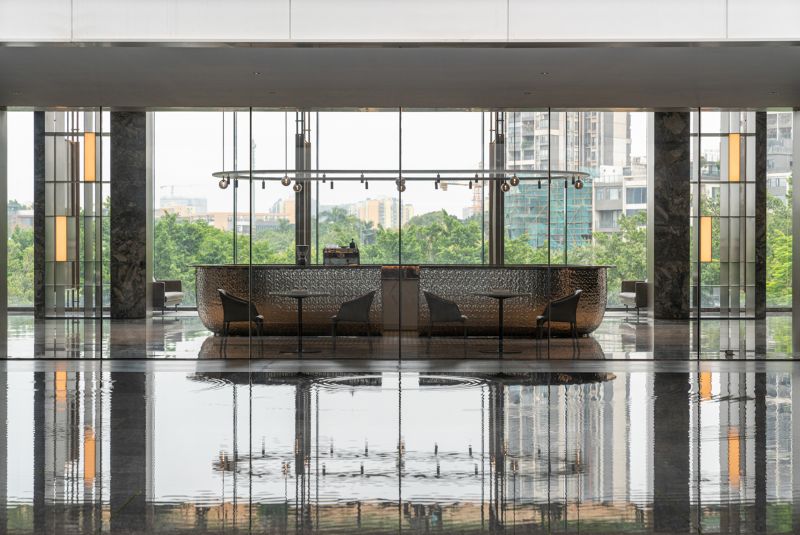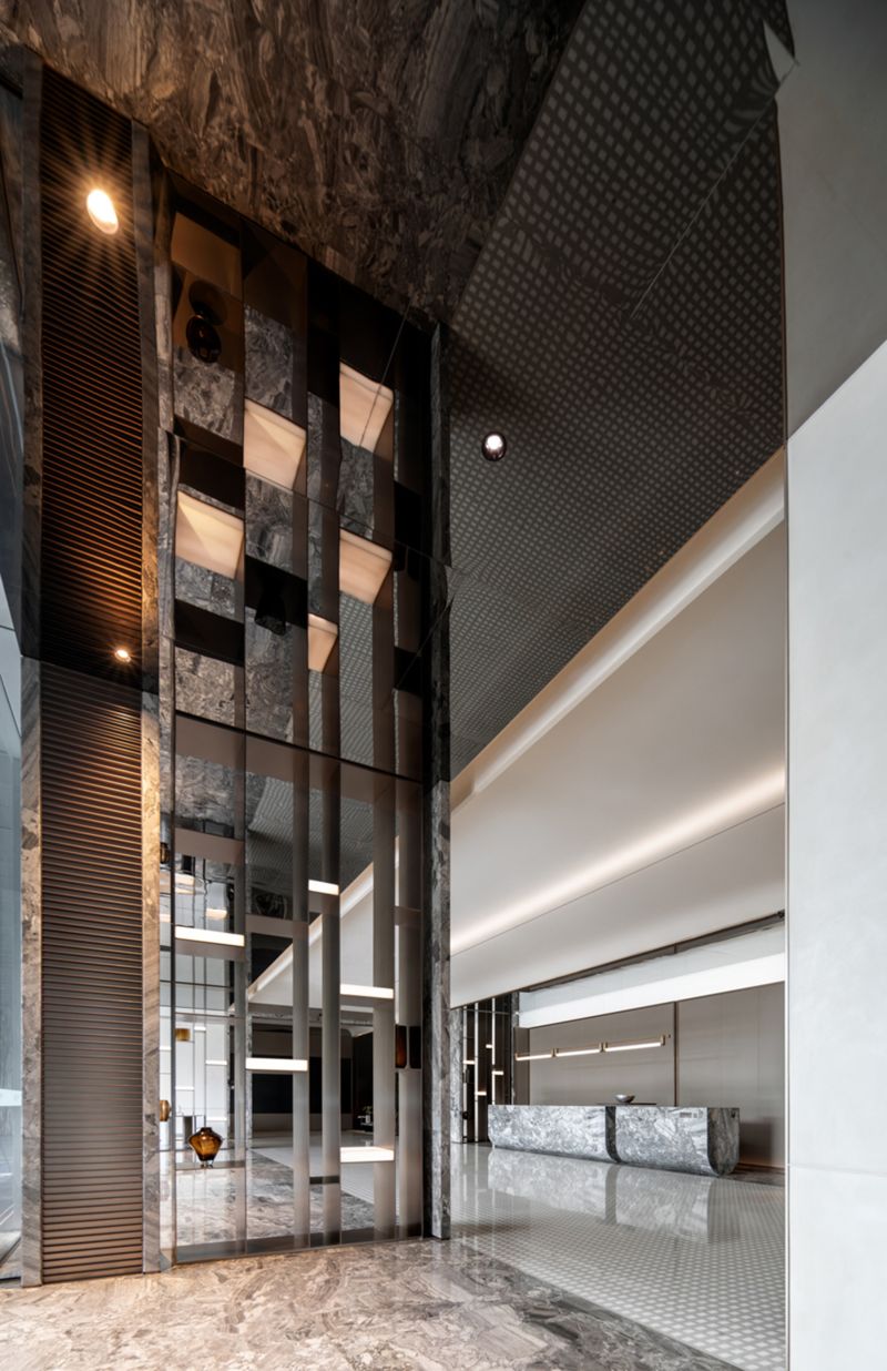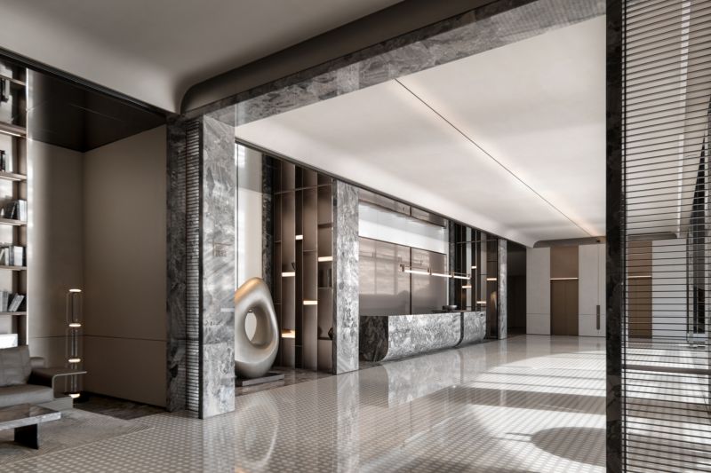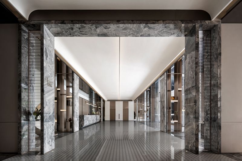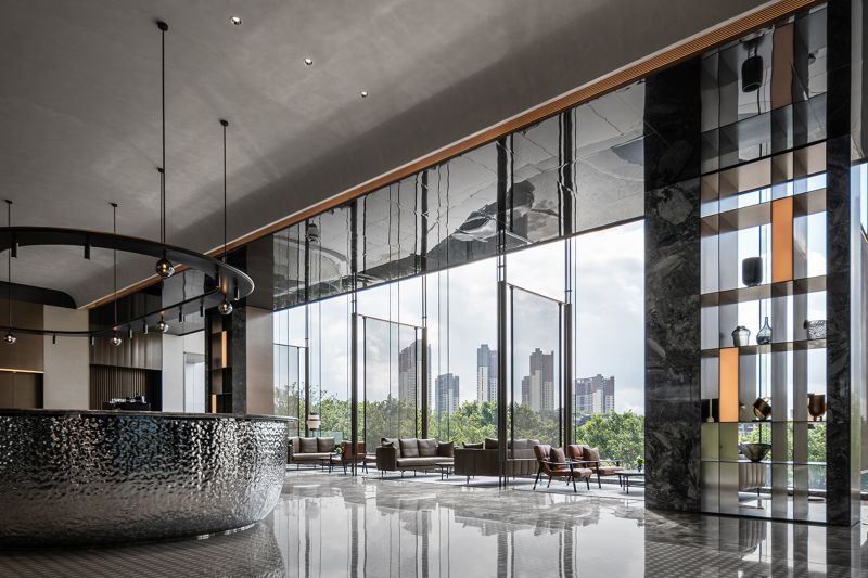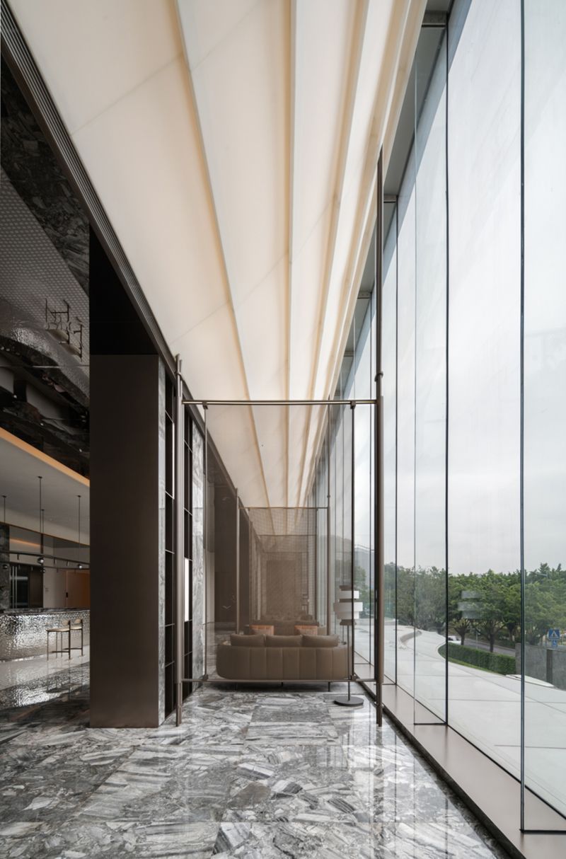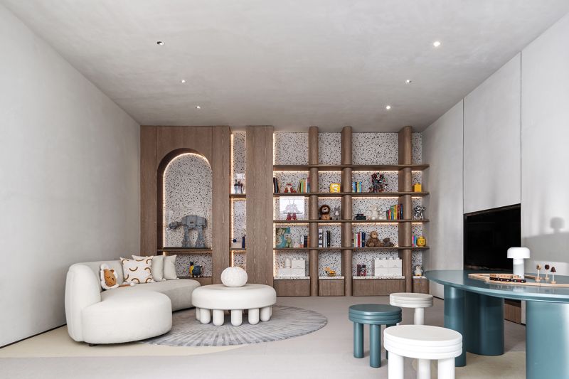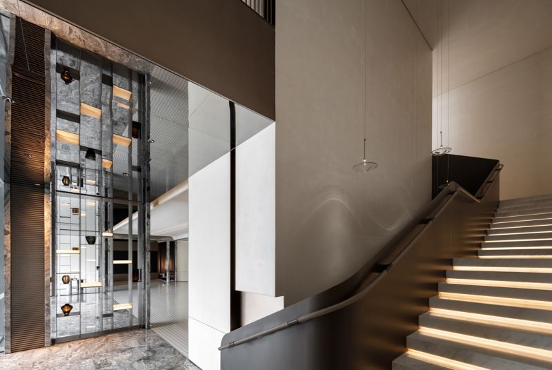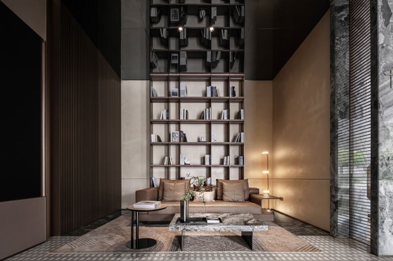 Large doors and windows in the space, progressively sized from inside to outside, bring in natural landscape elements, framing the environment and creating a harmonious spatial experience with nature. Different combinations of natural materials such as stone and wood are used to differentiate various spatial zones, forming hidden functional areas along the axes. By incorporating natural stone, wood, metal, and leather materials, the space establishes a tranquil and natural atmosphere with earthy color tones.