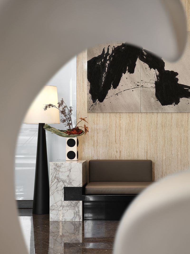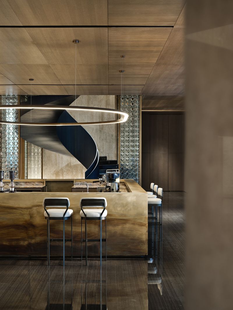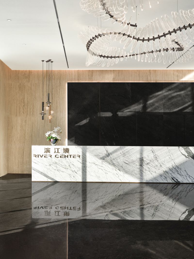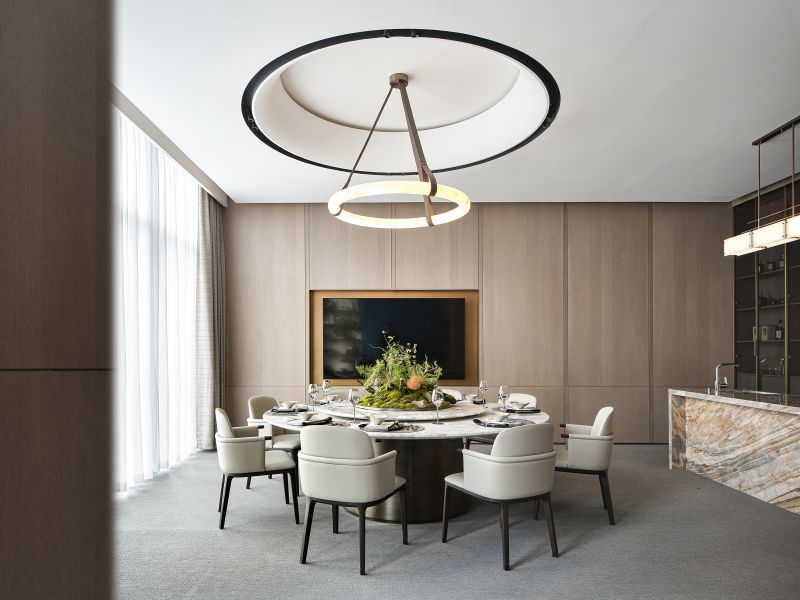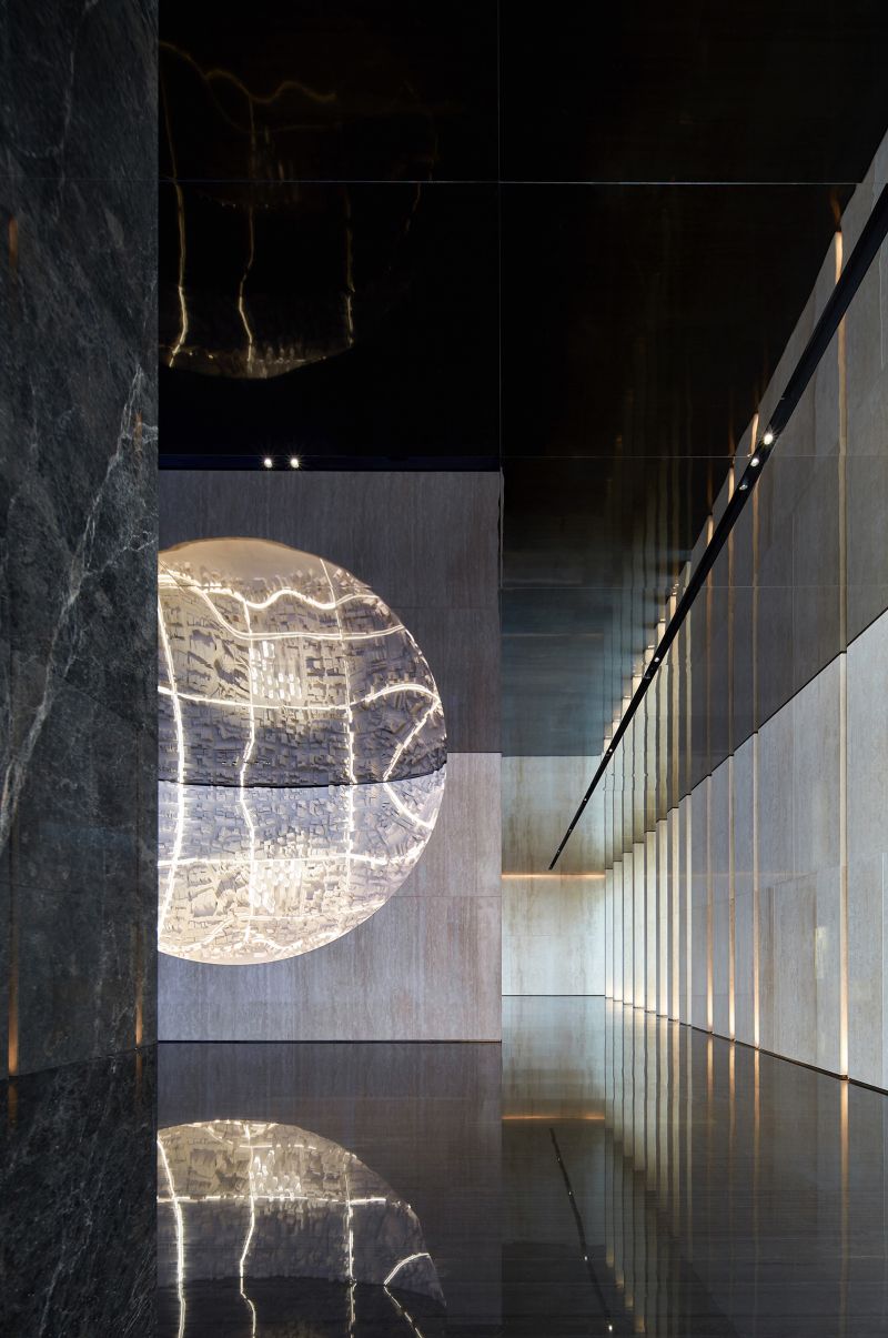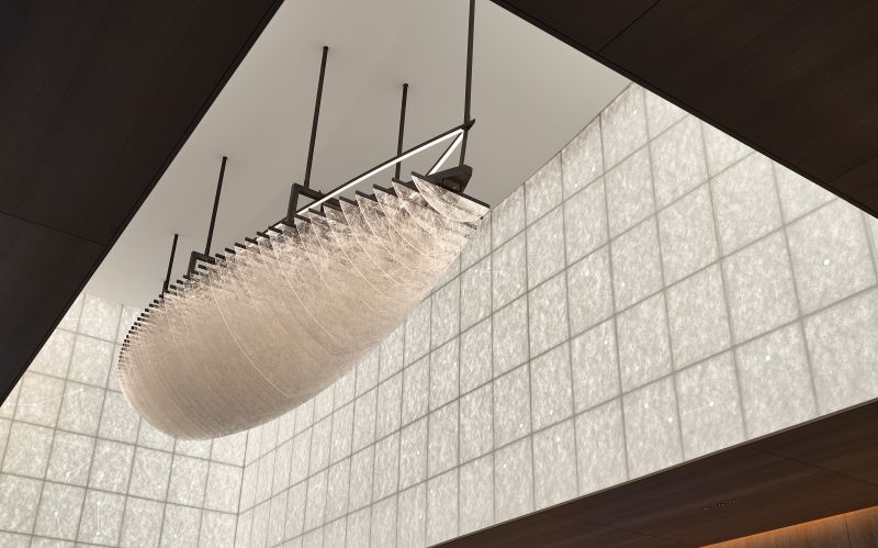 The dynamic devices create visual highlights while enhancing interactivity and a sense of technology. The ceiling of the negotiation area is treated as hollow, and the exterior is covered with DuPont paper to reproduce the pattern of the 28 constellations on DuPont paper. The light source is filtered and emitted through the paper, full of beauty.