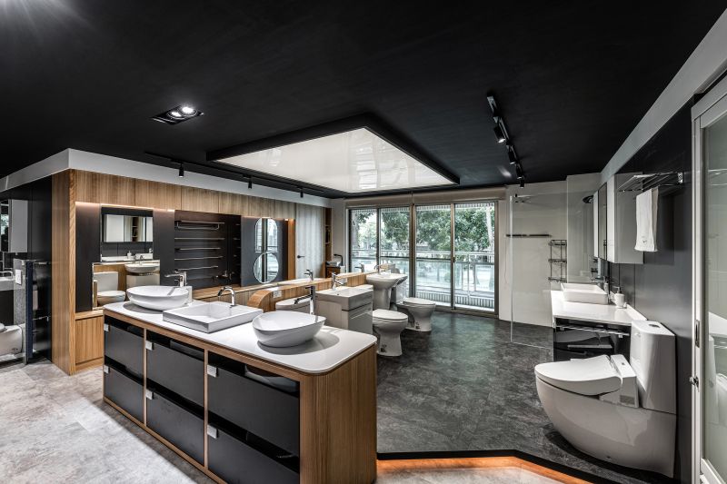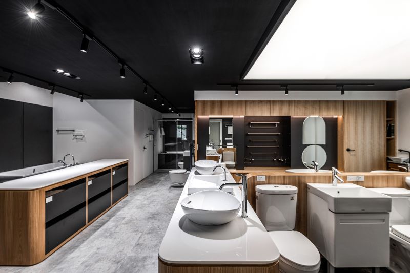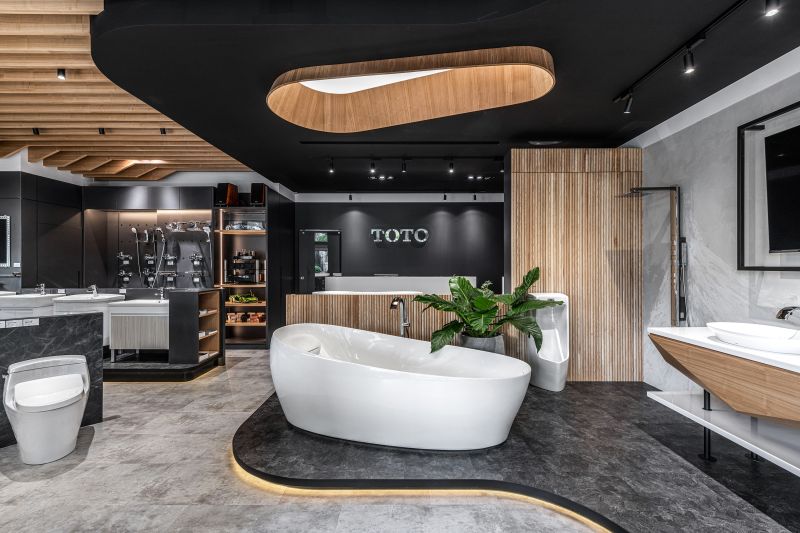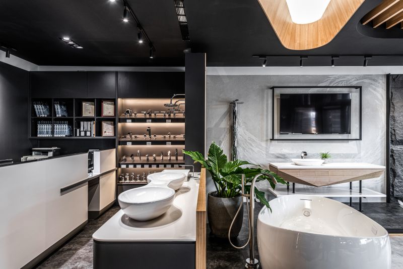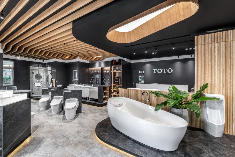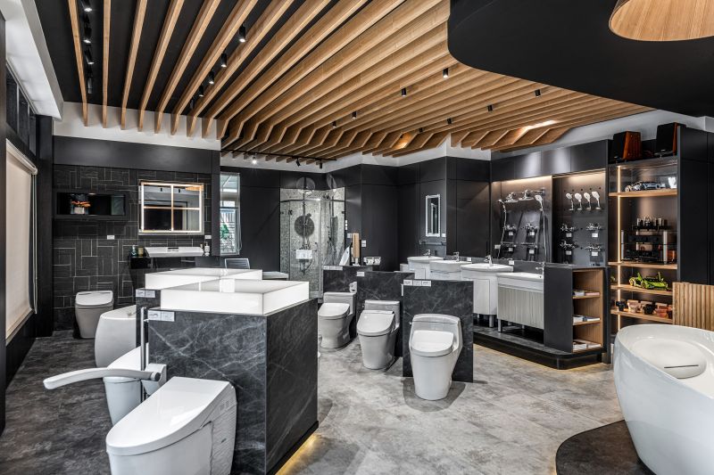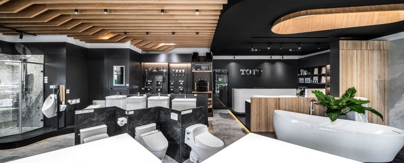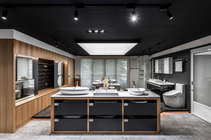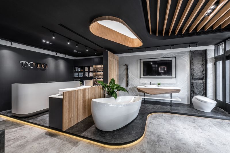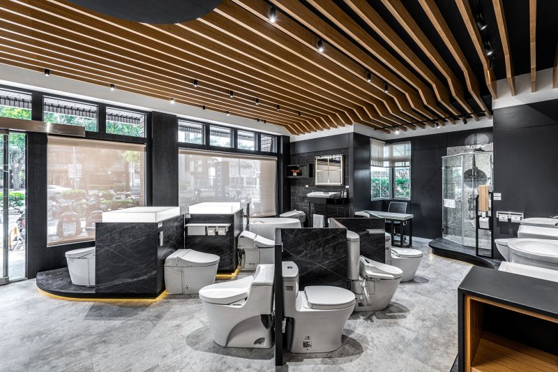 We successfully challenge the consistent brand image of simplicity and strikingly set off the lustrous white sanitary wares via a dark color scheme. Additionally, meticulously decorate an artificial lightwell that provides a balanced illumination and integrates it into natural elements such as wood, greenery, and gravel. Perfectly finish the biophilic design in a modern forest style. At the sanitary ware showroom, we install a wall-mounted showerhead with a hand-painted decoration, which excellently complements the linear features and texture of the bubbling water flow.