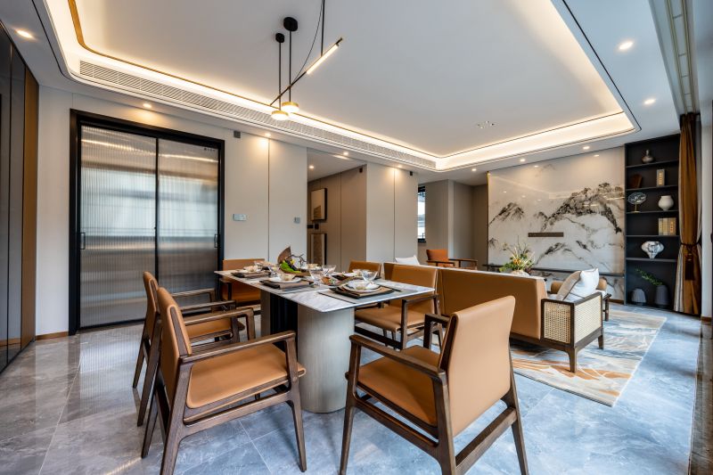 The main concept of the sales office layout is to ensure that traditional Chinese architectural and cultural elements are integrated, but in a modern and subtle way. The design reflects the integration of local culture and the aging design of the sales office. The area has traditional Chinese architectural elements such as stone carvings, wooden paneling, patterned ceilings and traditional Chinese paintings hanging on the walls to provide an atmosphere that exudes Chinese culture.