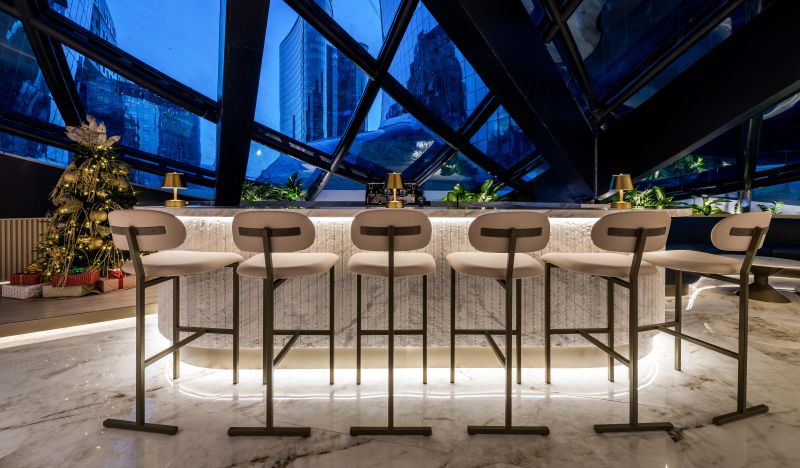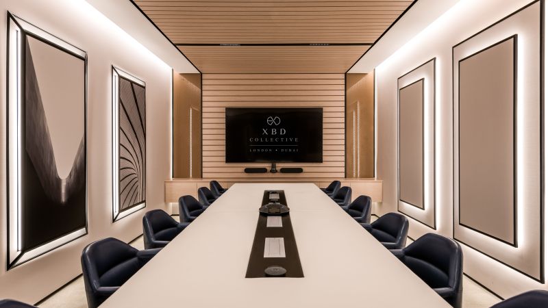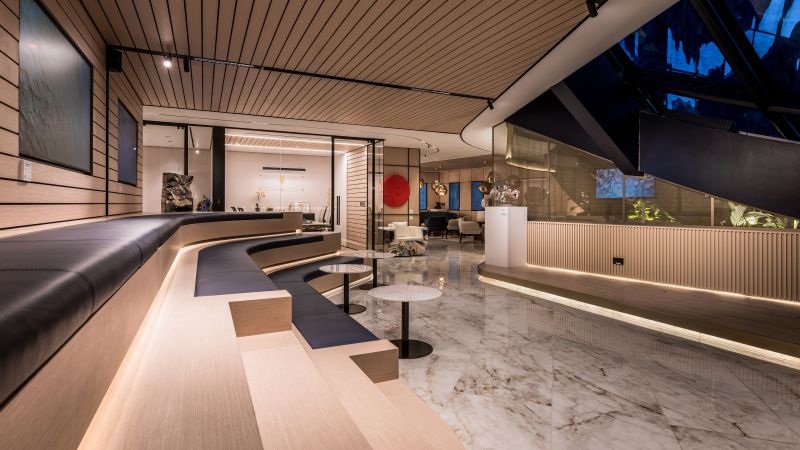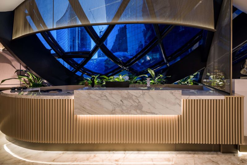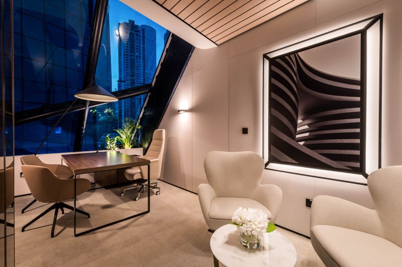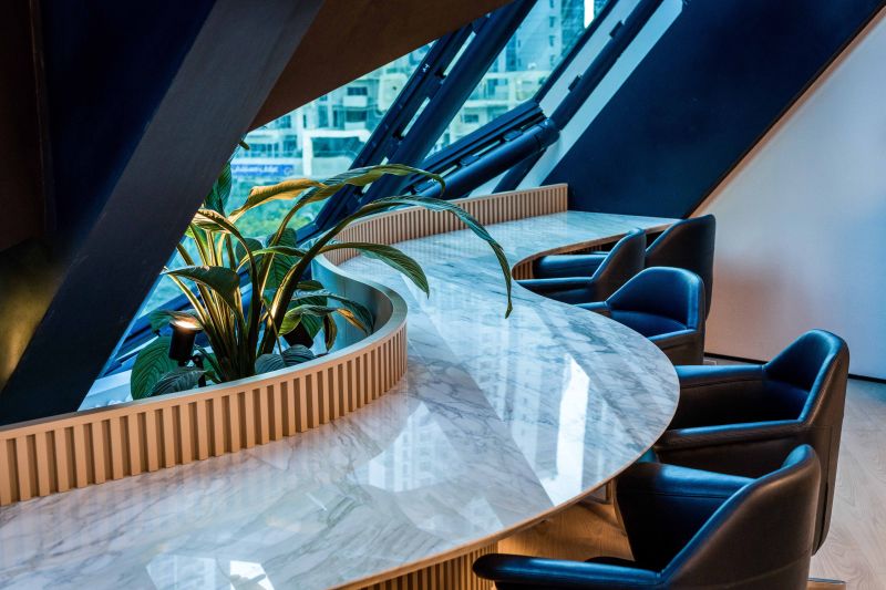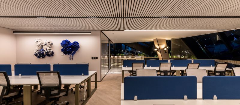 For Modern Working, located in Zaha Hadid’s Opus Tower in Business Bay, the client’s brief outlined coworking spaces combined with private offices, an art gallery and a coffee bar in the public area, and an amphitheater-style seating area for small events and meetings. Thus, one-third of the offices would be occupied by Modern Working’s HQ while the remaining space would serve as business center rentals with common areas to be accessible for all occupants. Overall, the office needed to be an open and visual space making use of fluid shapes contrasted by strong geometrical lines.