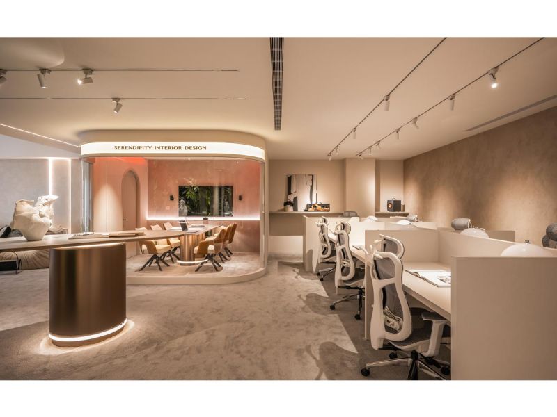 This design firm's space features a horizontal, semi-open layout with five sections: reception, meeting, green belt, office, and rest areas. Natural light, half walls, and dynamic furnishings create a spacious and comfortable environment. The meeting room, rotating table, and plant wall enhance the sensory experience. The space is designed to foster collaboration and trust, with a calming color palette and understated luxury in a modern wabi-sabi style.