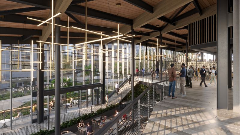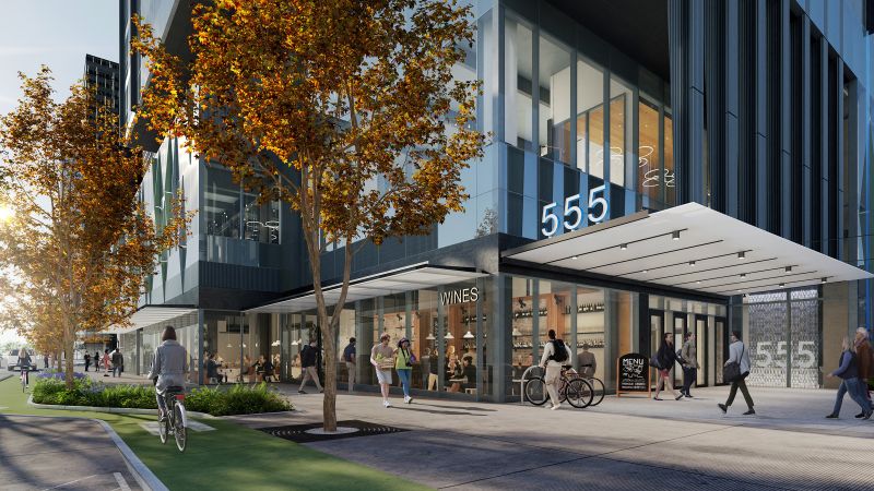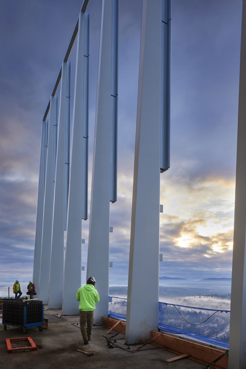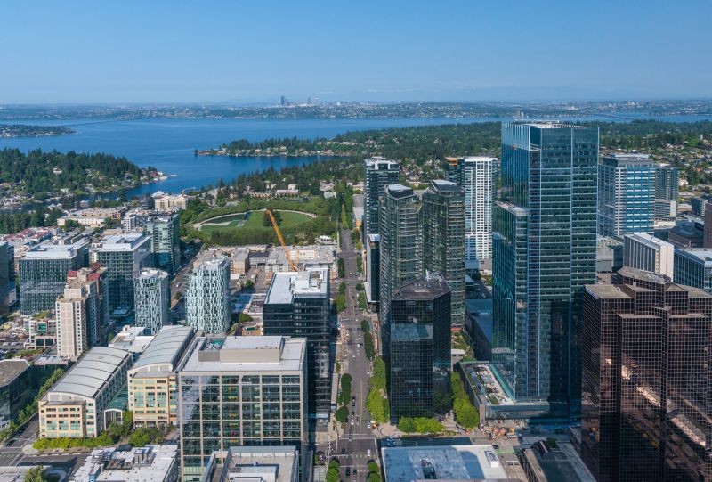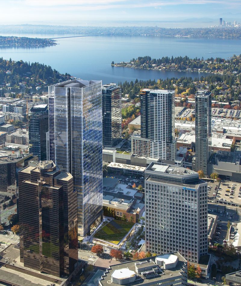 Sited adjacent to a bustling transit center and future light rail station, 555 Tower stands as Bellevue’s tallest skyscraper. Rising to 600 feet, the soaring office tower is conceptually driven by a connection of city and sky and features iconic rooftop spires that dramatically reshape the downtown skyline. A ground-level retail pavilion and public plaza elevate the streetscape and create an inviting and engaging open space that ties into the Grand Connection, a series of projects and initiatives designed to improve the pedestrian experience through downtown Bellevue.