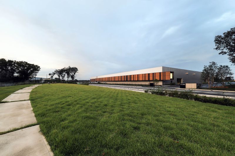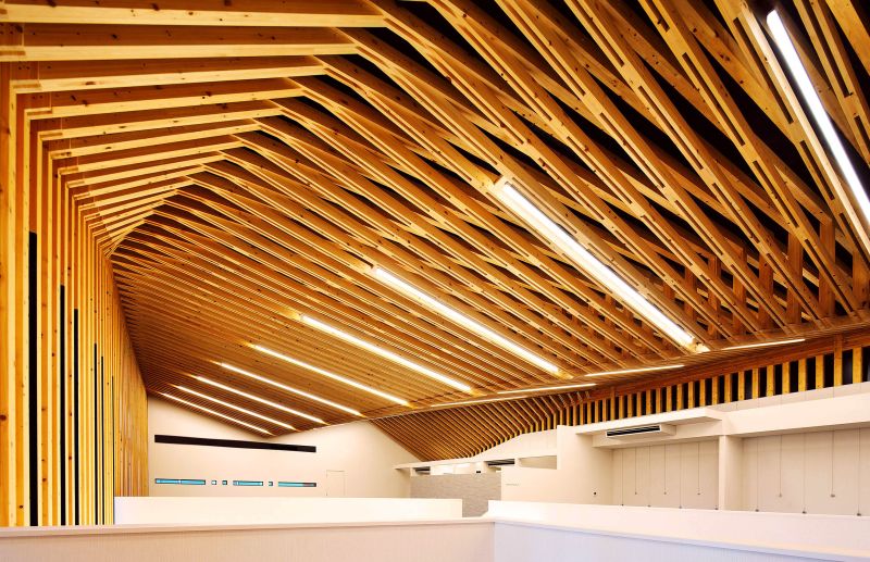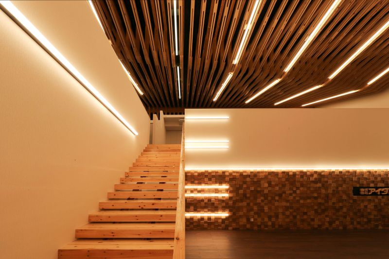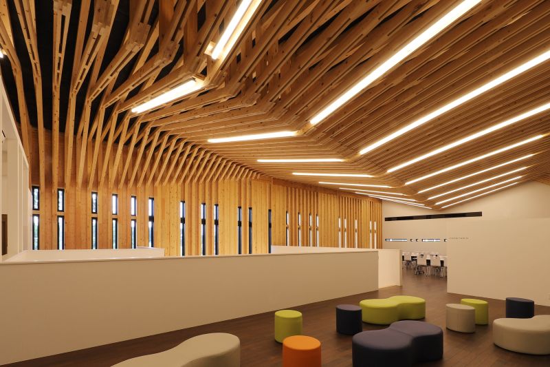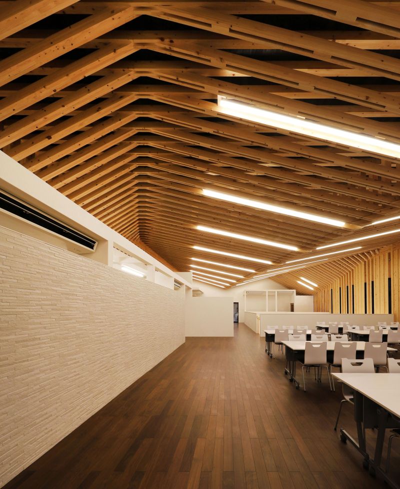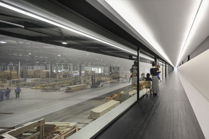 This new precut timber factory, designed by Aida Sekkei, features an innovative design with every step of the precut process visible to visitors. The plan includes a floating glass-enclosed viewing corridor approximately 100 meters long, allowing visitors to closely observe the production. The office building is designed with a truss structure using timbers typical for residential homes, creating a vast space that showcases the "factory as a display." The dynamic facade design, exuding a sense of acceleration and speed, aims to symbolize Aida Sekkei's ongoing evolution towards the future.