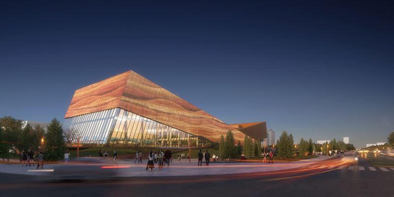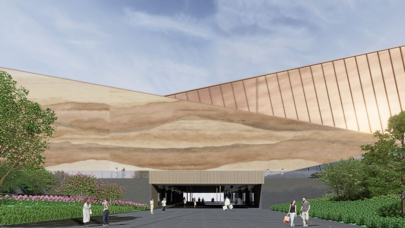 The facade design, themed "Gobi Gem," emphasizes the beauty of local culture, color, and nature. The building's volume and form are inspired by gemstones buried in the Gobi Desert, radiating a sense of raw, natural power.