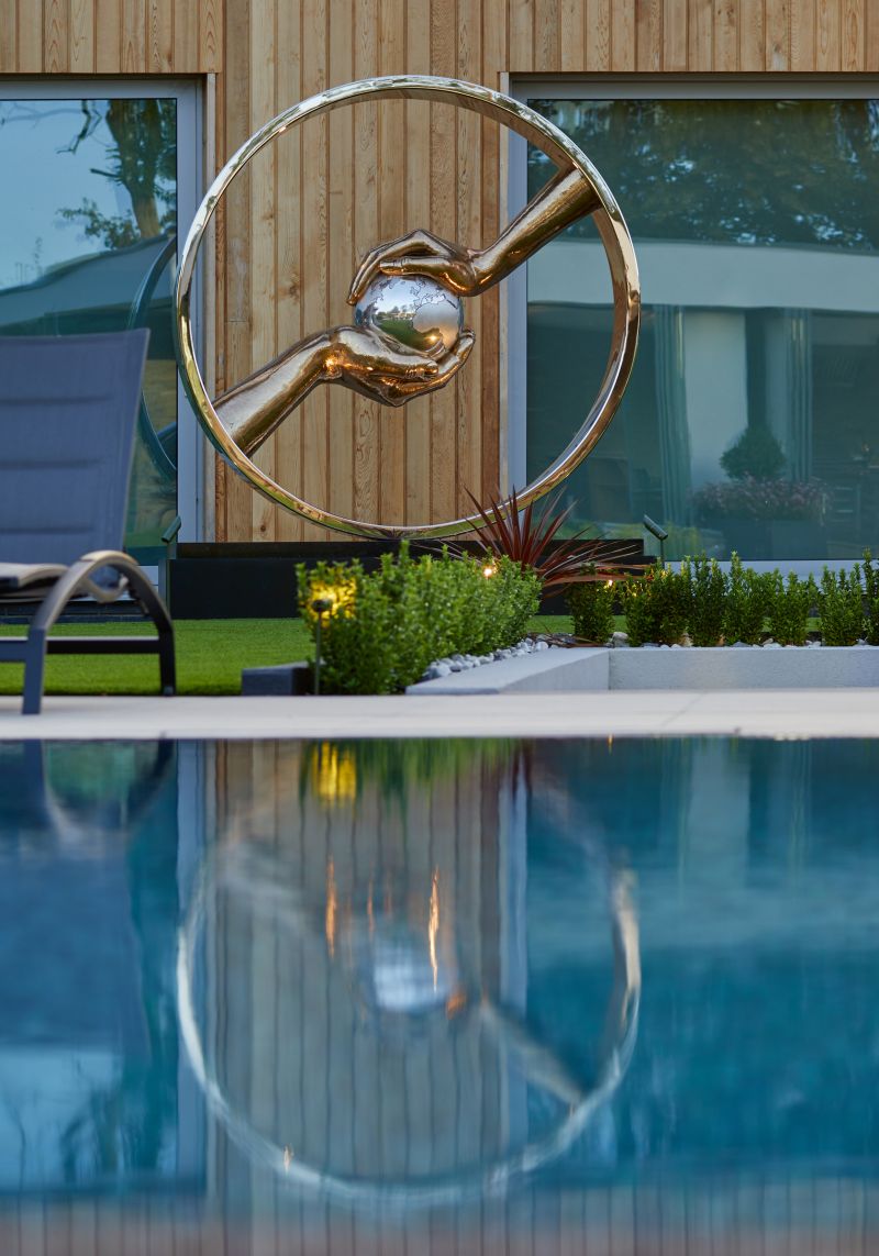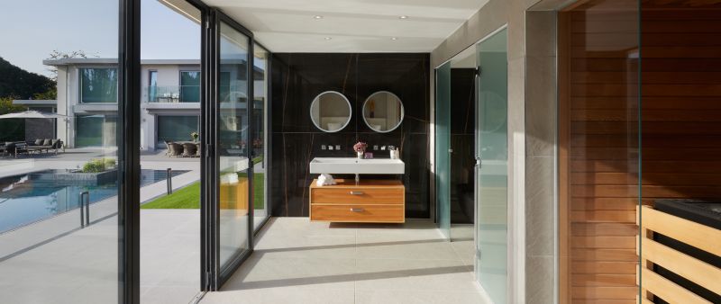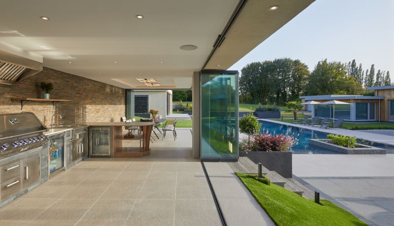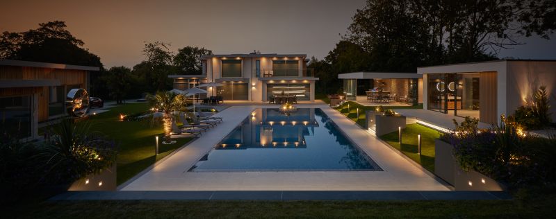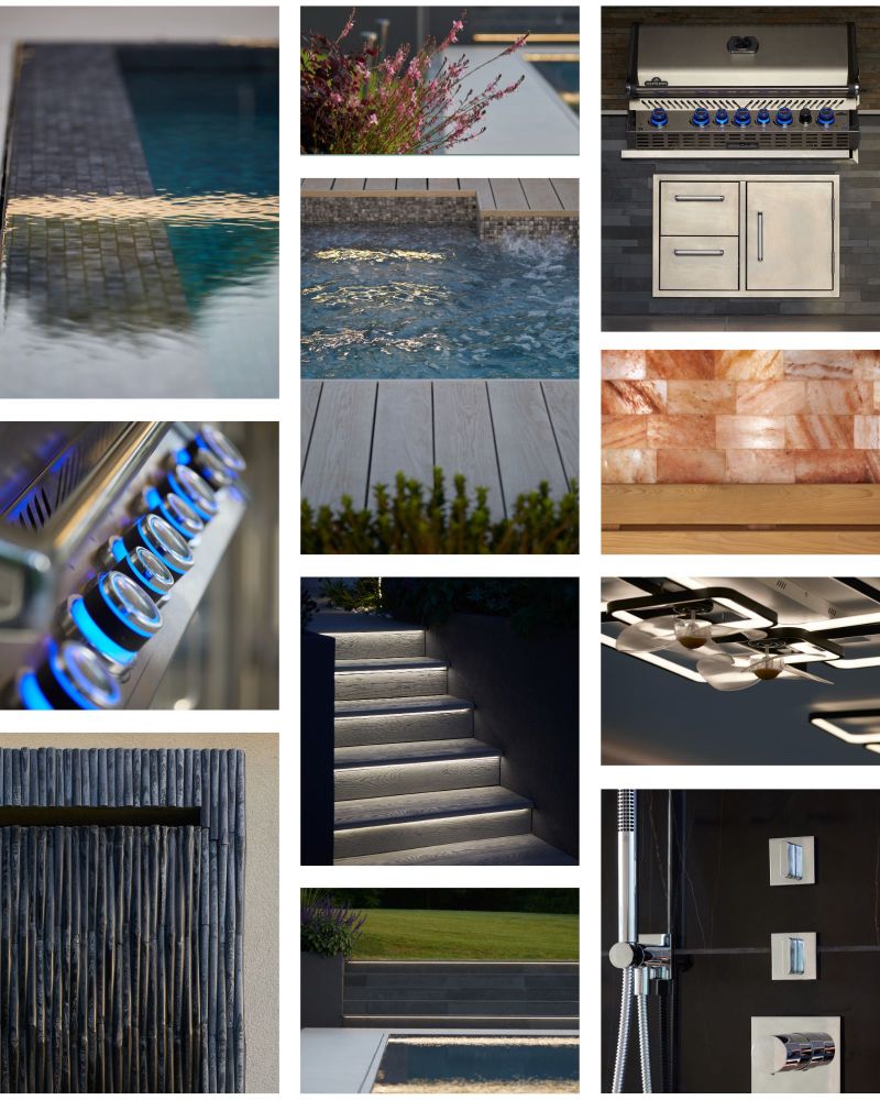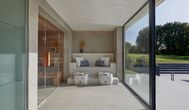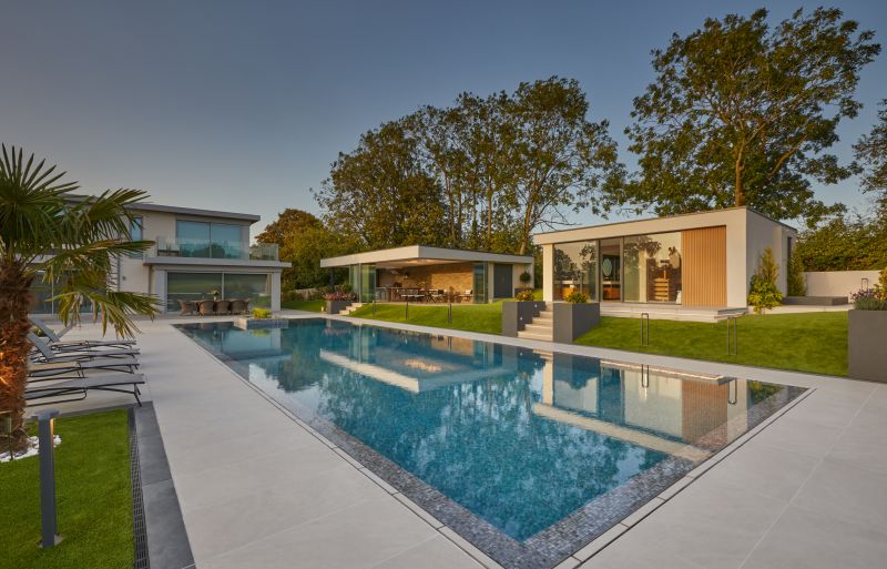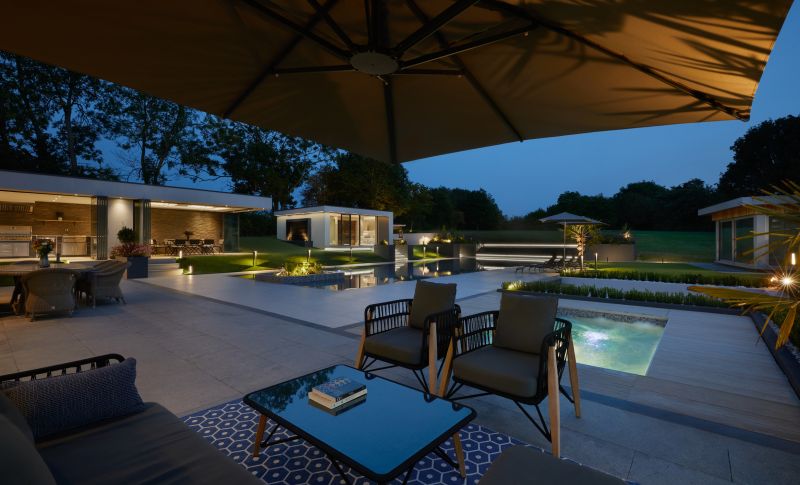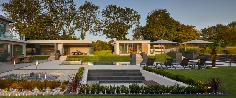 Our design philosophy, inspired by ancient Greek elements, creates harmonious spaces. Earth is represented by stones and plants; water by hydrotherapy; air by open layouts; and fire by lighting and salt walls. Wellbeing and mindfulness drive our design, focusing on physical, mental, and social health. Key features include a pool, BBQ areas, hot tub, and sauna. The design seamlessly integrates with the landscape using mirrored glazing and strategic plantings. Timber & stone materials enhance tactile experiences, while varied plants provide year-round interest.