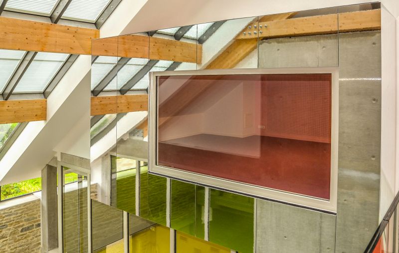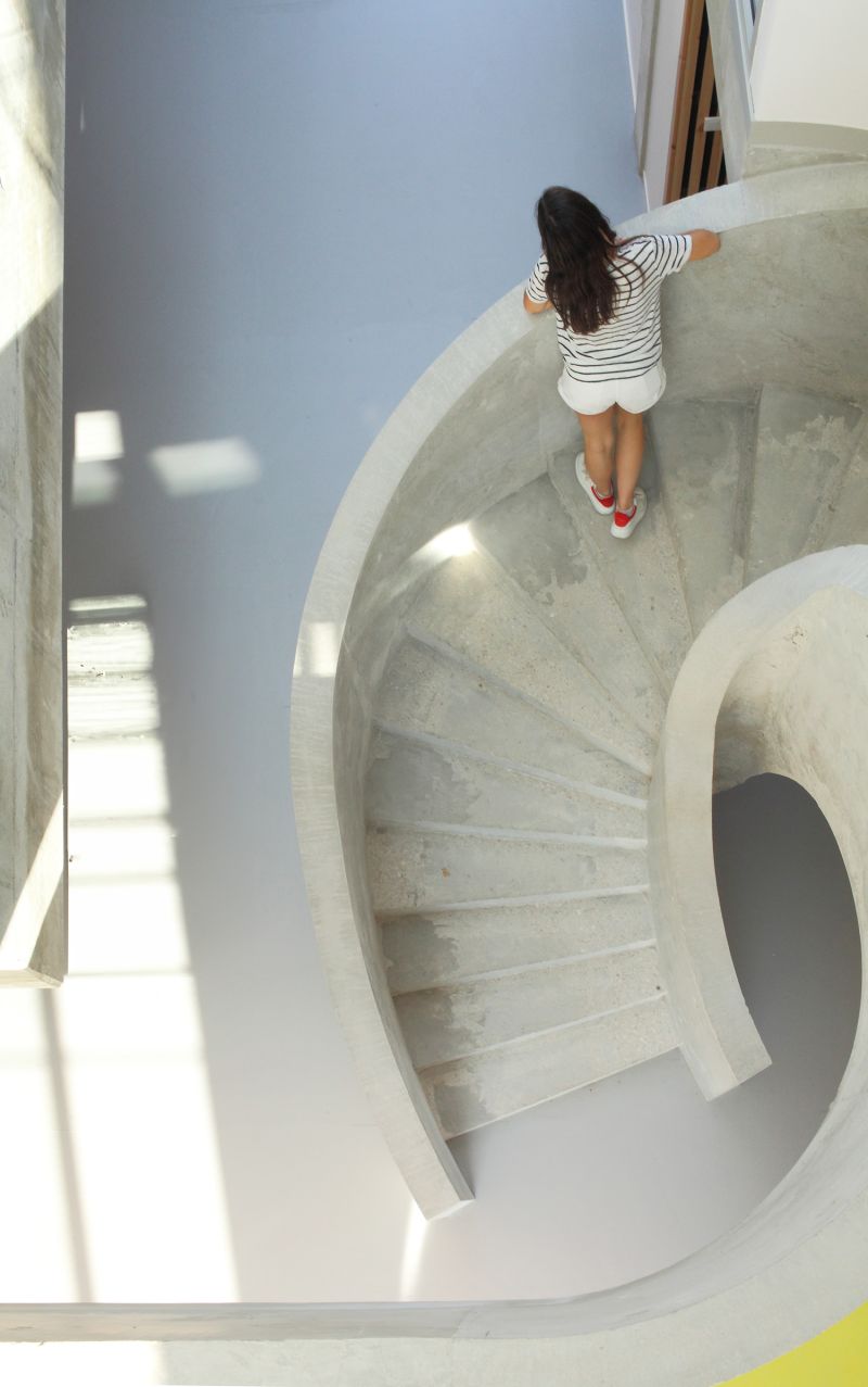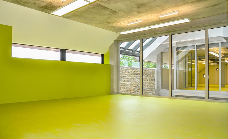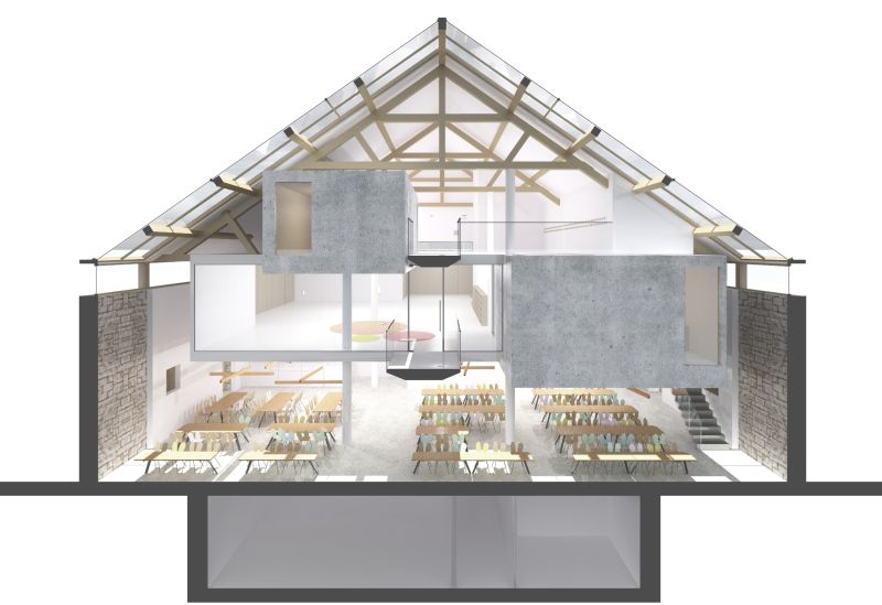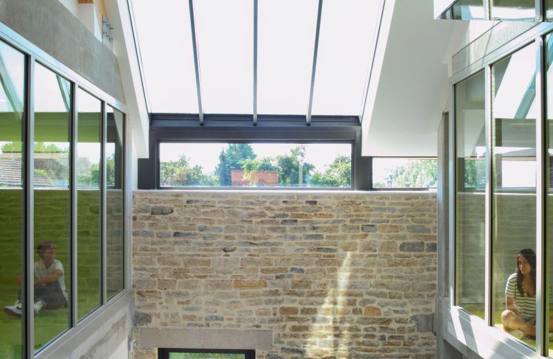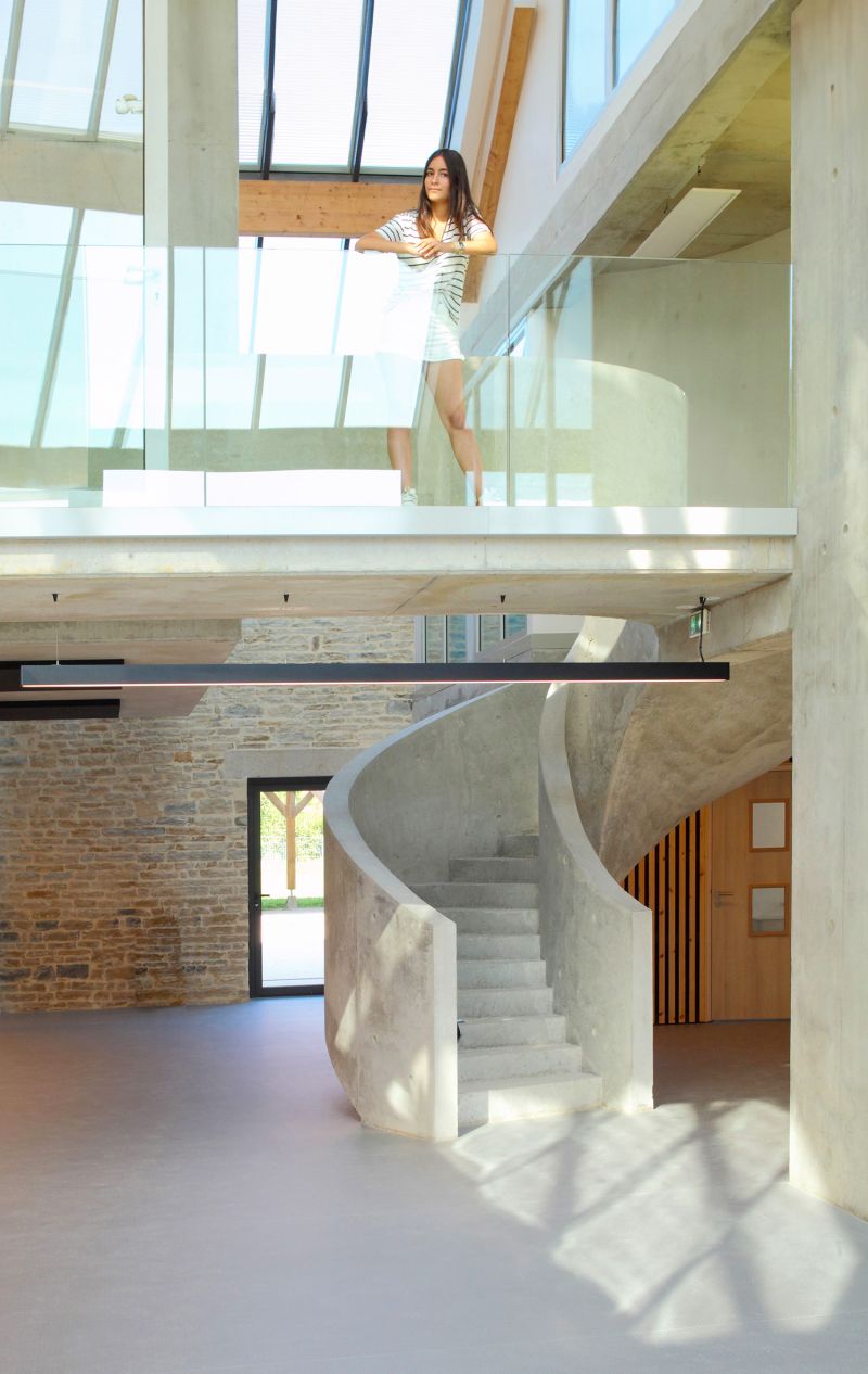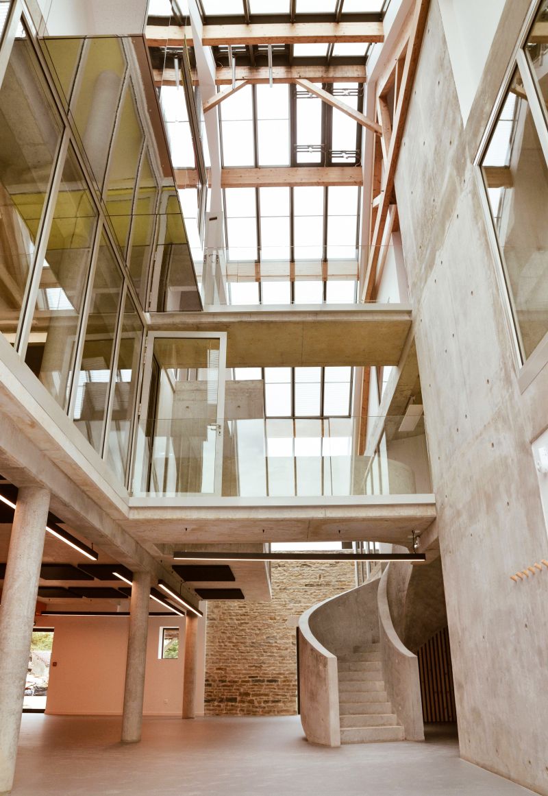 The existing stone façade was restored and a whole new independent structure was introduced within. The new roof constructed, is a solarium glass roof where light enters and floods the central atrium. It is also in this atrium one sees the exposed wooden framework of the roof and the concrete staircase that connects the new suspended activities floating in this void.