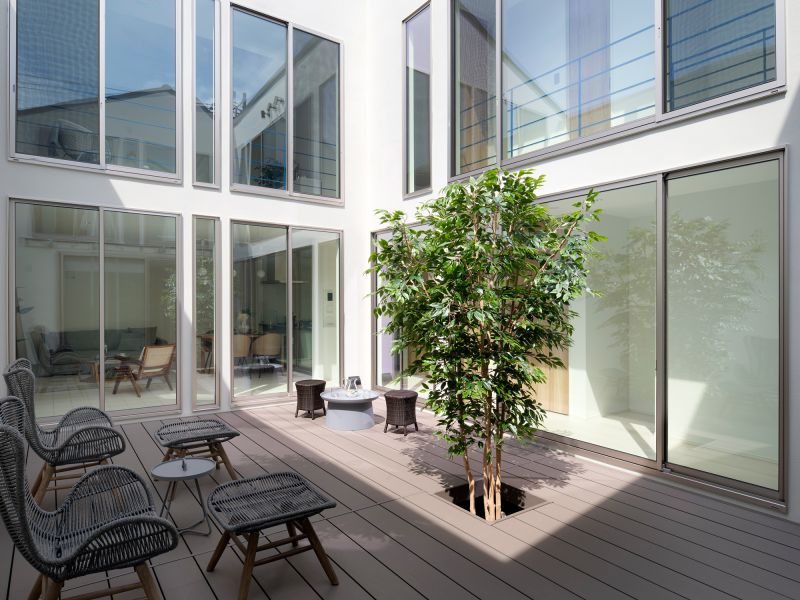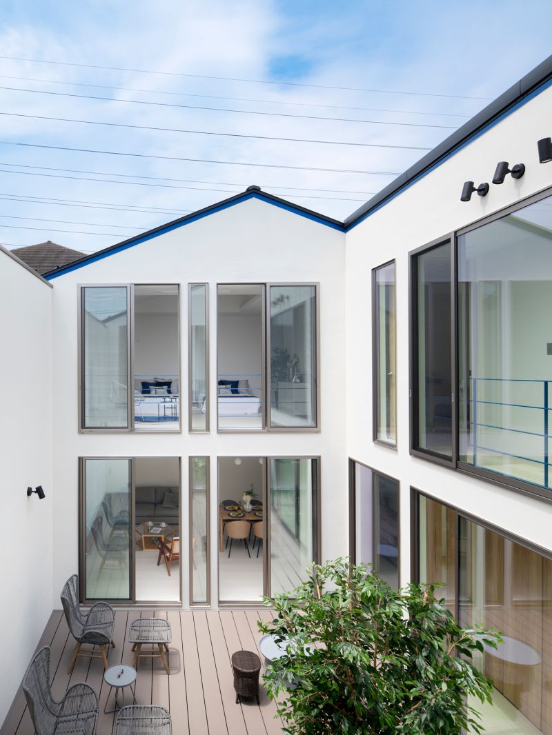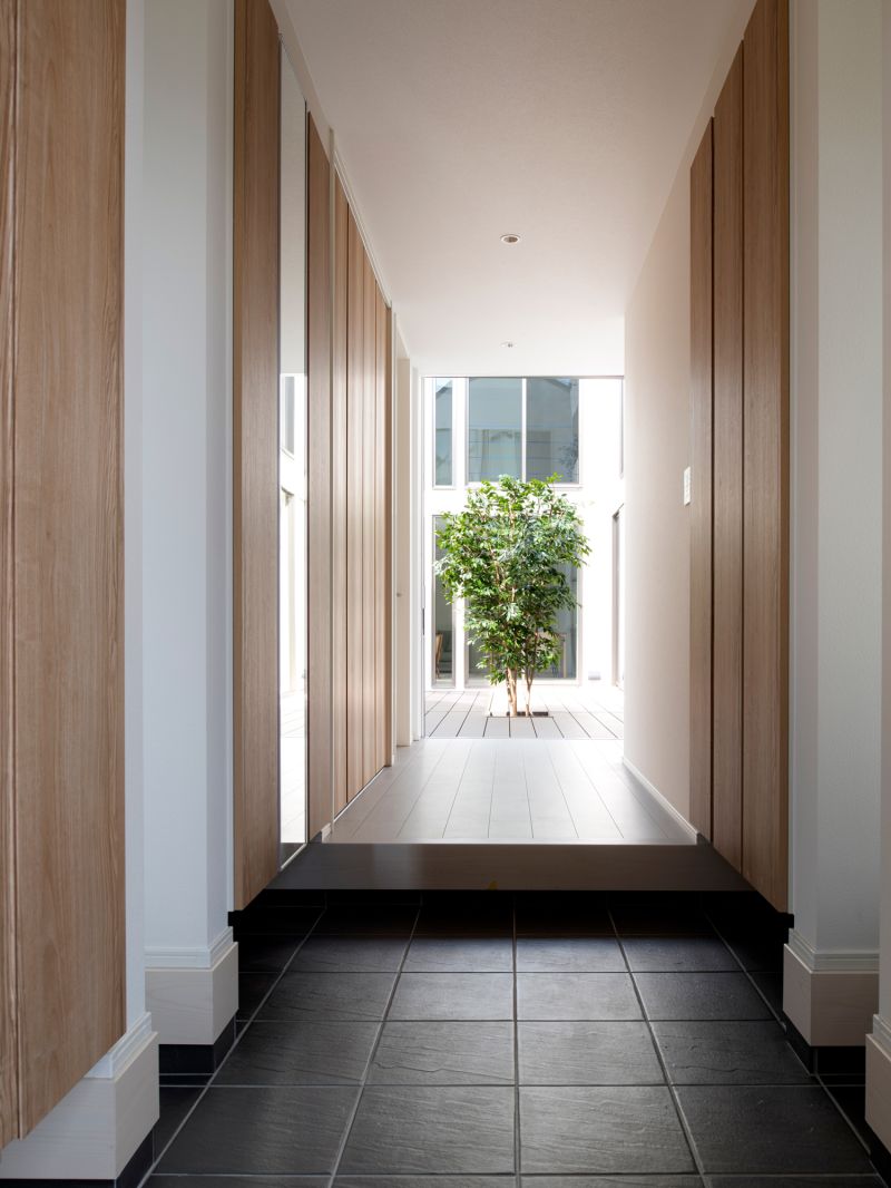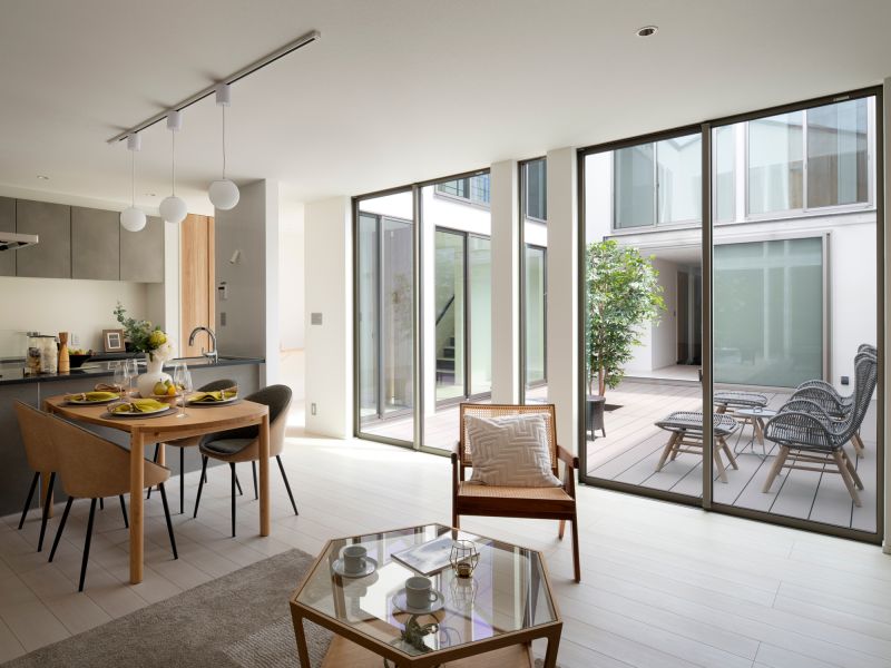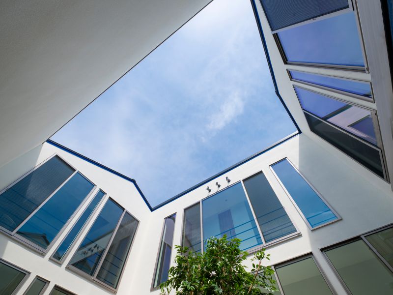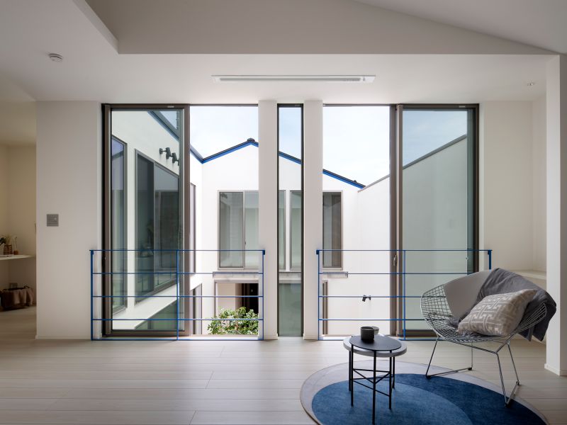 Traditional Japanese townhouses (machiya) integrate nature by placing a garden at the center, fostering a unique aesthetic and respect for nature. A house cannot exist without a physical, abstract, and poetic connection to the sky. This design focuses on living with the sky. A central courtyard is surrounded by rooms, and as visitors enter through a narrow hallway, they are led to the bright, open courtyard. The sky greets them, with light and wind gently filling the interior. The courtyard serves as both a room and passageway, creating a rich living experience beyond its actual size.
