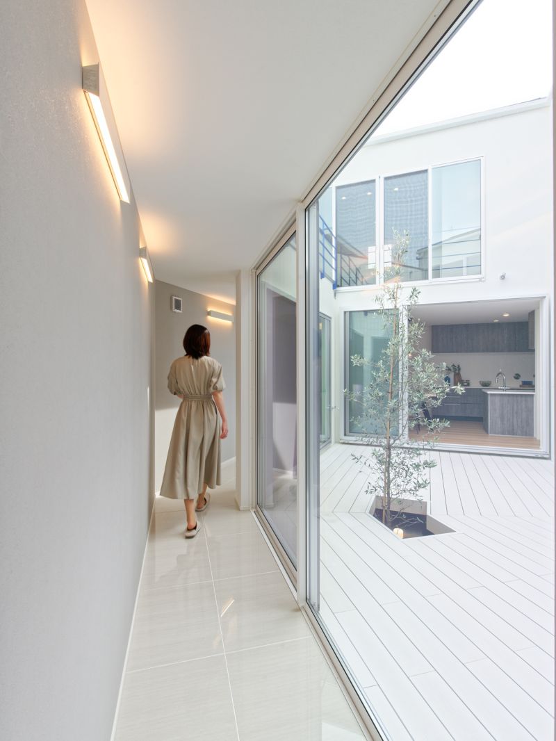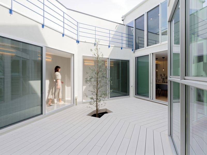 A house cannot exist without a connection to the sky. This home is designed with that mission, drawing inspiration from traditional Japanese townhouses (machiya) that use central gardens to integrate nature. Built on a pentagonal plot, the house features a courtyard with rooms on both sides, connected by a passage. All rooms face the courtyard, allowing light and wind to flow inside. The space expands horizontally and vertically, creating a living environment that feels close to the sky. The circulation, like a Möbius strip, supports diverse lifestyles and ensures health during pandemics.