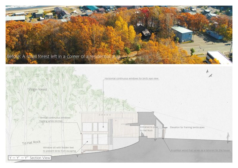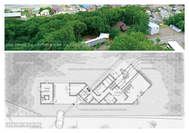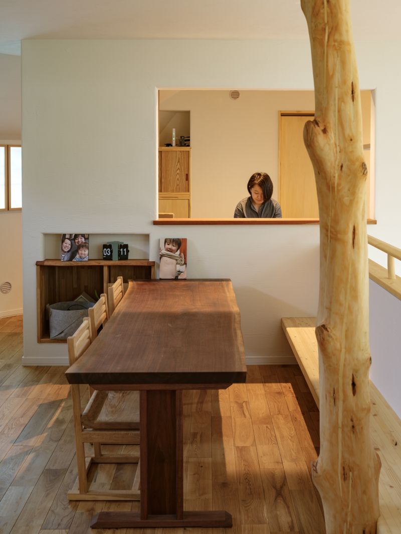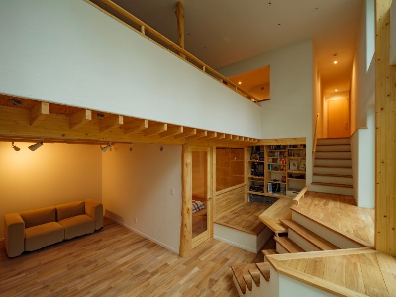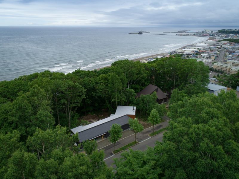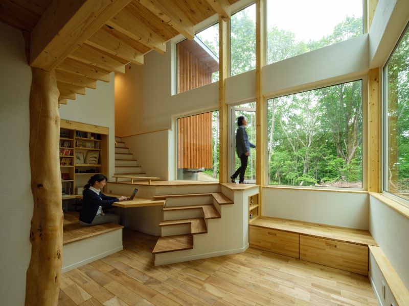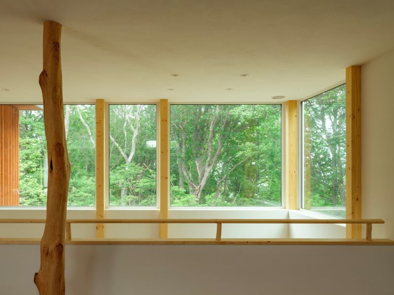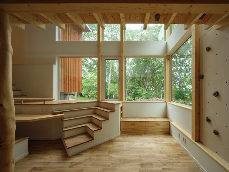 The "Ki no iE" is a small Home overlooking the Hat Rock in Abashiri given to a boy with Prader-Willi Syndrome. We planned life in this home to become a natural diet and exercise regimen. For example, we designed a "hallway-integrated kitchen" that is always organized for others to see and a "variety of steps" and "bouldering wall" to encourage natural exercise in daily life. Also, the sight of the Ainu people praying on Hat Rock synchronizes with everyone's wish for a peaceful life. We realized that scene at the entrance of this home.