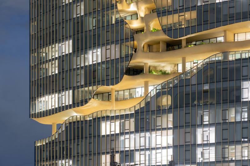 A crack of natural terrain carves through the 16-story glass facade of One River North, (ORN), a new mixed-use development near the center of Denver, Colorado's River North Art District (RiNo). More than just an apartment building, One River North is a vertical landscape for its residents to wander as if hiking in the mountains. "Imagine living in a building yet feeling as though you're immersed in a natural landscape—like living within a canyon itself," says MAD Principal Architect, Ma Yansong.