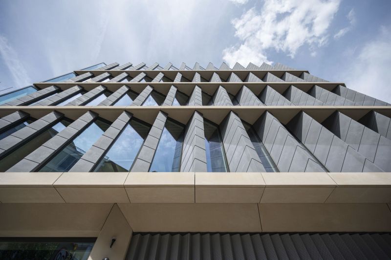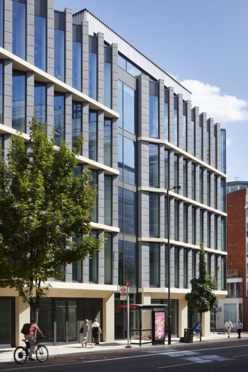 68-86 Farringdon Road’s complex and constrained site – previously a multi-story car park – informed a bold design language for a new hotel and office building that celebrates the area’s eclecticism. Situated between Bowling Green Lane and Vineyard Walk along Farringdon Road, the mixed-use development is formed of a new 180-key hotel for Whitbread’s hub by Premier Inn brand that neighbors a speculative office building for CLI Dartriver. Animating the streetscape of this bustling London thoroughfare are retail spaces, the hotel's café, and the office’s reception at ground floor level.