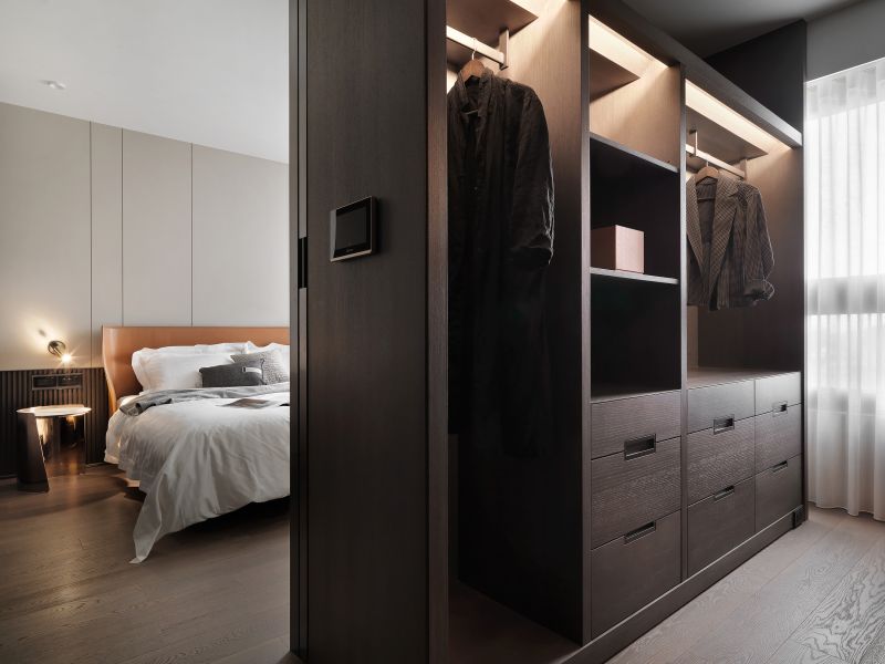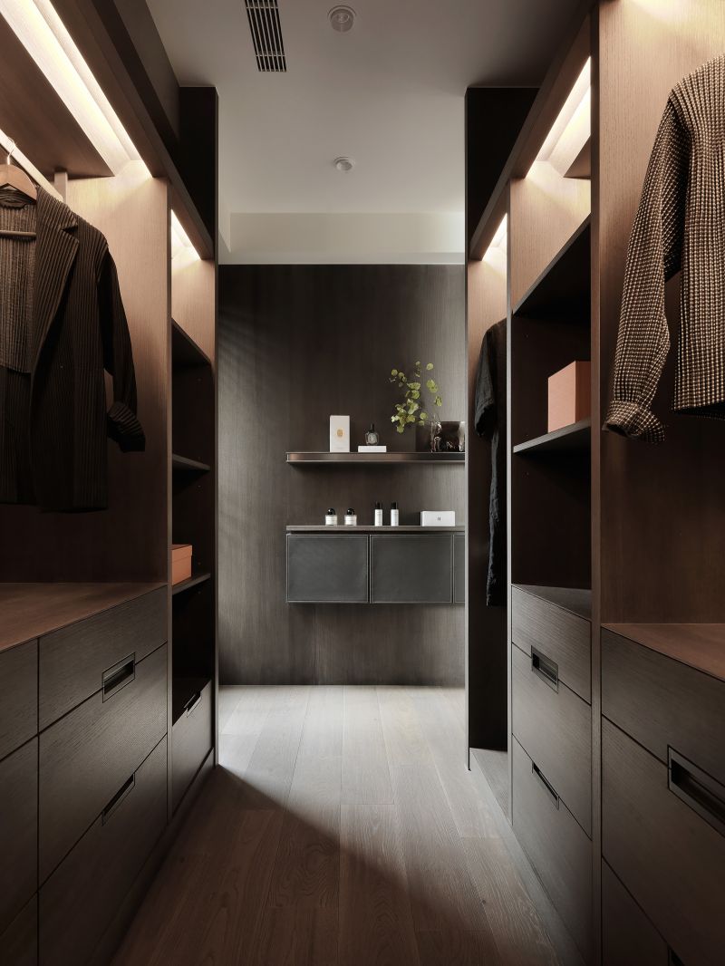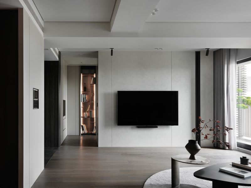 A spacious and transparent space with furnishings in diverse shades composes a minimalist and rich layering accent.