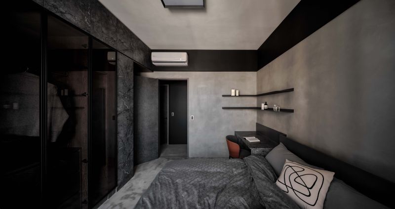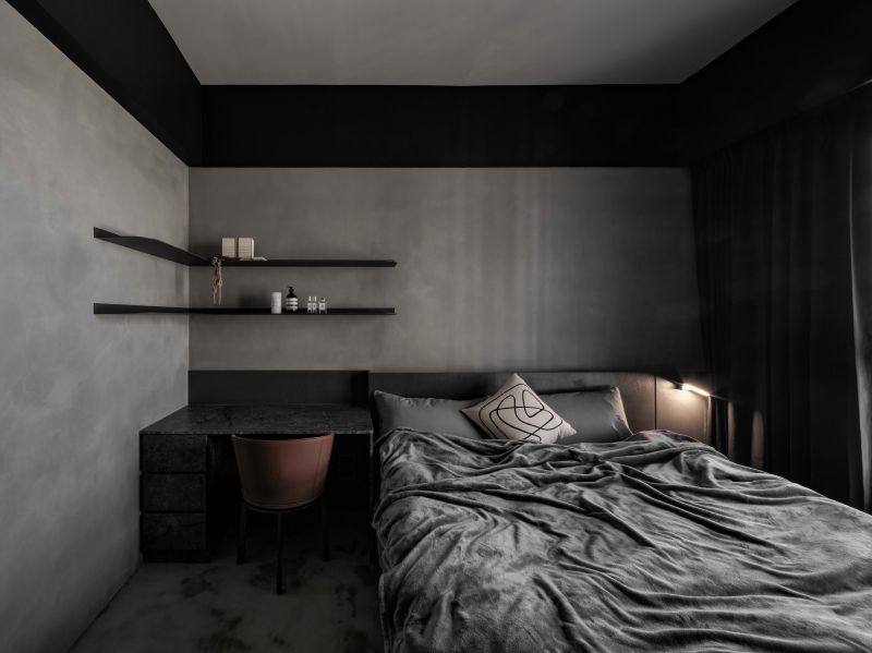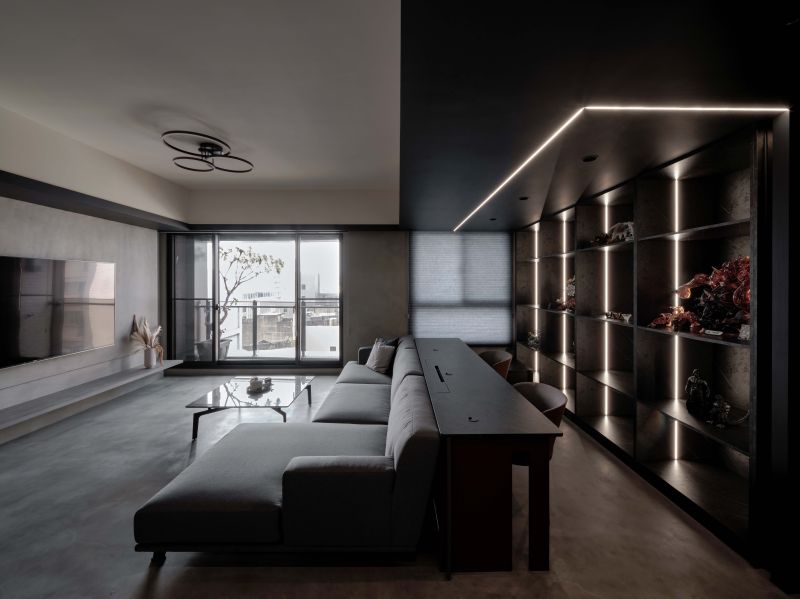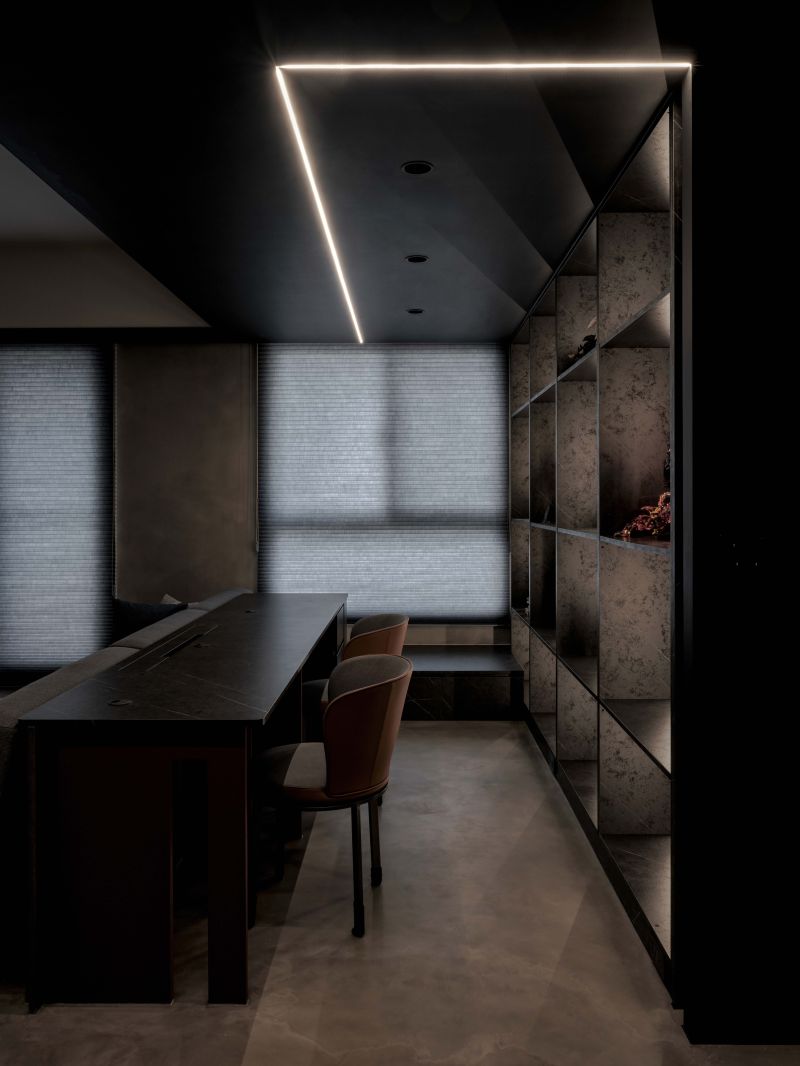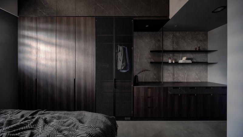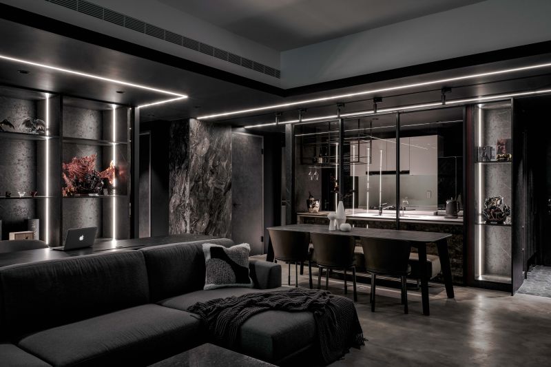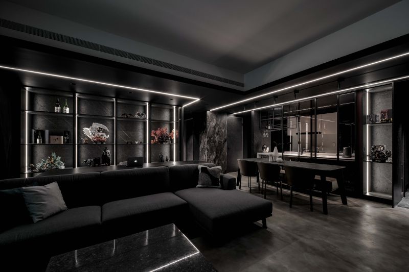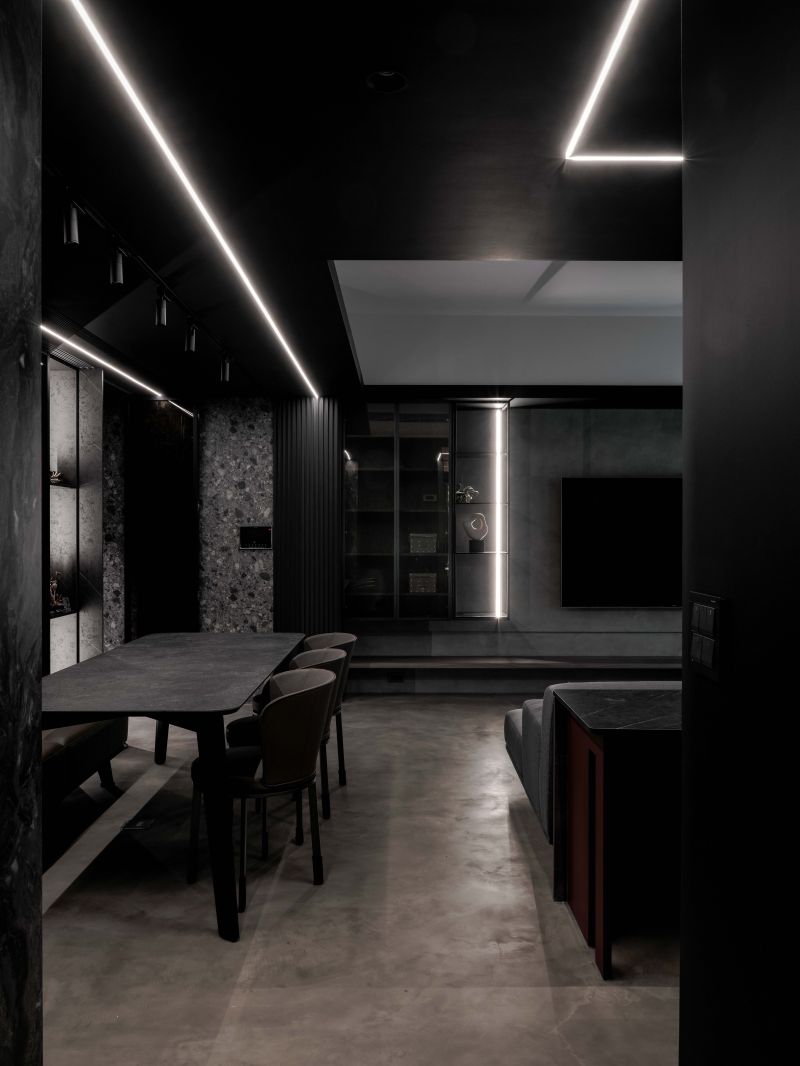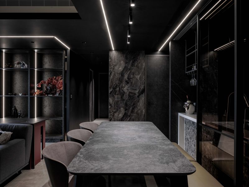 Attentively reflecting the homeowner’s preferences, the designer employs black as the foundation color, complemented by stone patterns and refined artistic wall coatings. Under varied lighting, this combination creates dynamic layers that subtly evoke a sense of understated elegance
