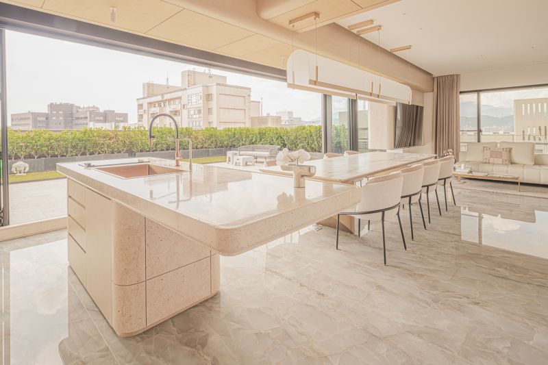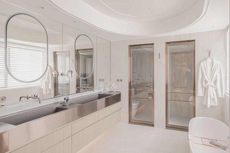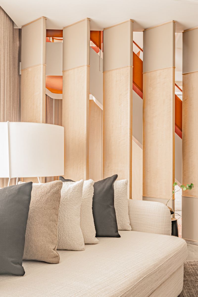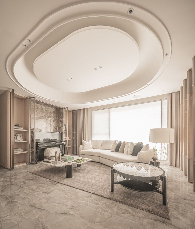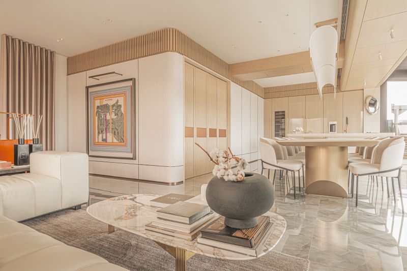 Arcadian Cruise blends the owners’ love for nautical aesthetics and ingenious usage of textures and materials. The design reminds of a yacht, as the layout was inspired by the upper and lower deck structure. Keeping the view of the common space on the upper deck not only creates an uplifting atmosphere but also preserves the family's need for privacy on the lower deck. The upper deck benefits from an abundance of natural light, minimizing the need for artificial lighting. By its creative use of fabric and leather, Arcadian Cruise is the impeccable balance between organic and exquisite.
