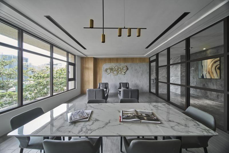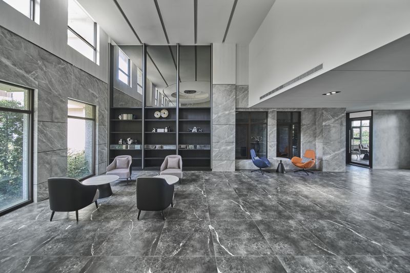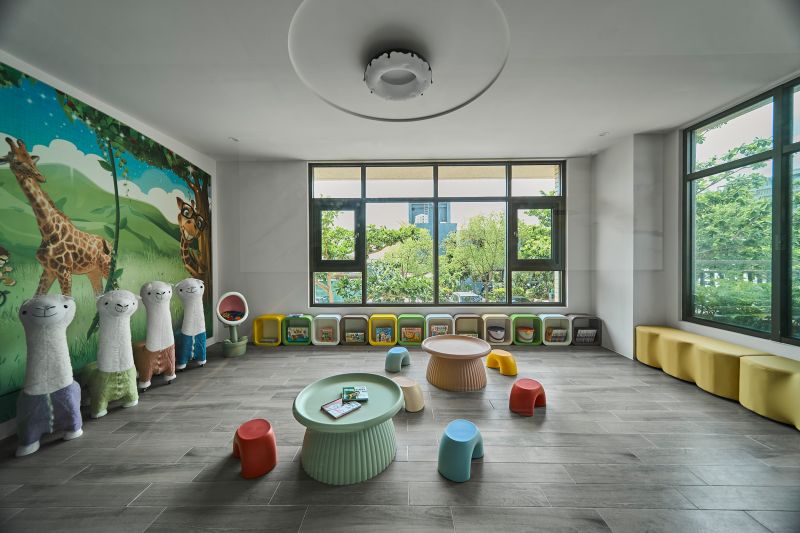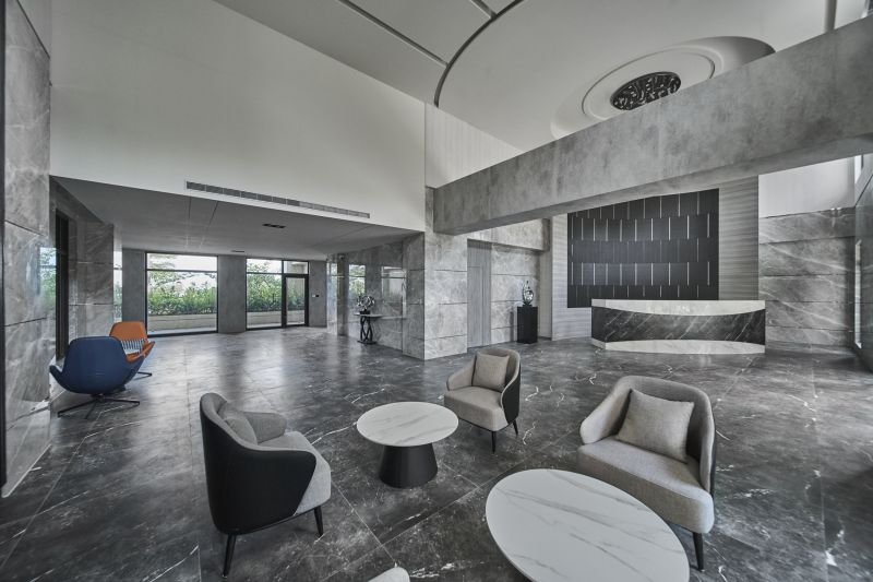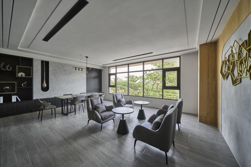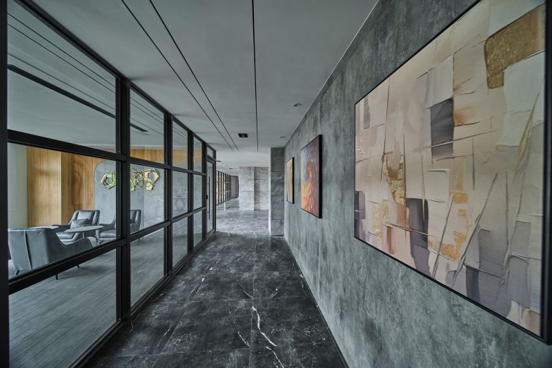 The designer used a calm gray tone as the base. The inclusive nature of gray enhances the display of the artwork and creates an intellectual and elegant atmosphere. The gallery-like design showcases several large-scale artworks, bringing a visual and spiritual feast to the residents. In this space, the art element is not only limited to the gallery but also to the whole shared space. The designer skillfully installed decorations and sculptures that resemble eyes, feathers, and teardrops in each area, and these thematic artistic expressions are scattered throughout the space.