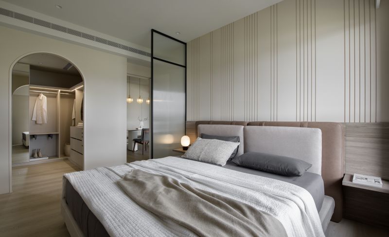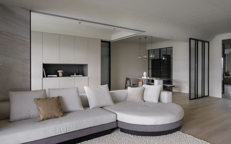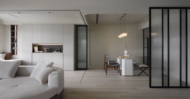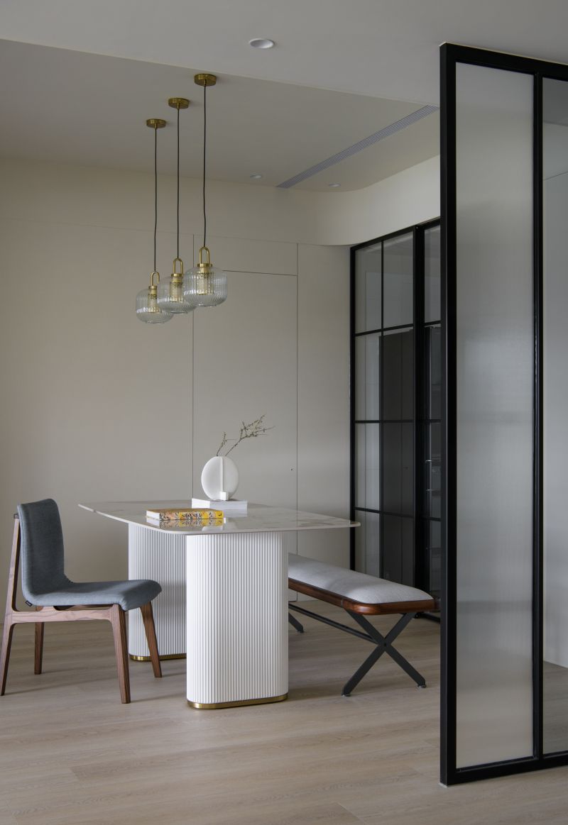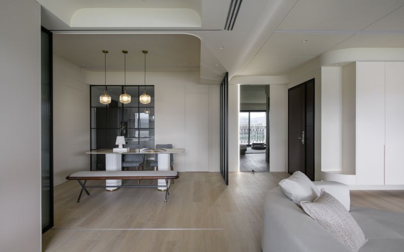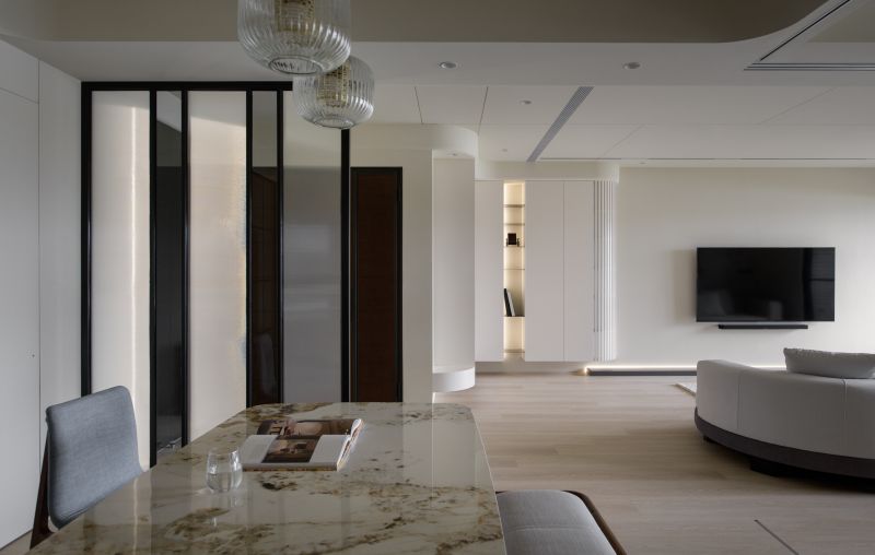In response to the homeowner's desire for an expansive living environment and a dedicated walk-in closet, we artfully removed the partition between the study and kitchen, replacing them with folding and sliding doors crafted from a blend of ironwork and reeded glass.