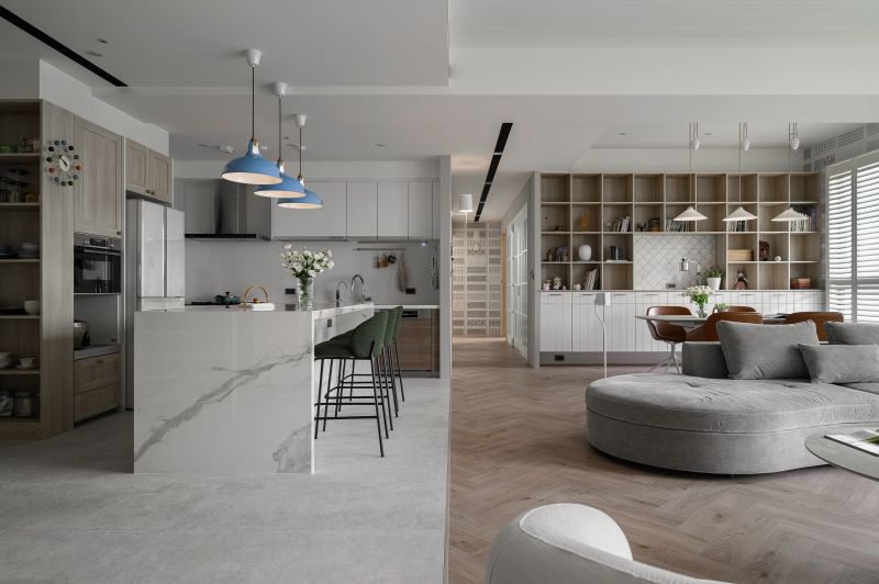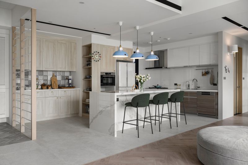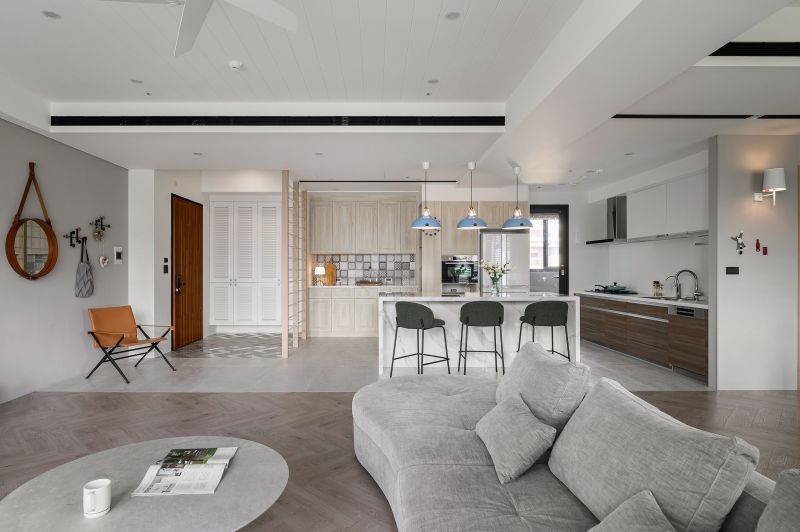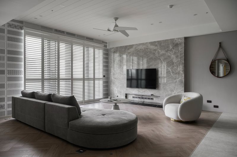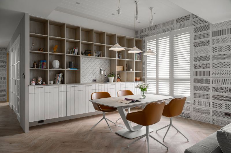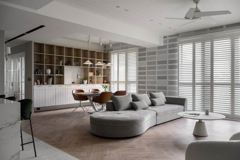 The adopted gray and white color palettes, adding wood grains, sleek lines, and geometric patterns to accommodate the homeowner’s preferences for European style. The trendy fixtures, such as a ceiling fan and white wooden Venetian blinds, shape a clean and airy living space. A pristine backdrop complements the homeowner’s overseas collections and highlights every exquisite detail in the aesthetic residence. The entire project provides the residents with a healthy and non-toxic living environment by adopting green building materials, low-formaldehyde construction frames, and latex paint.