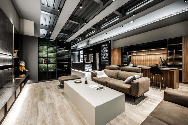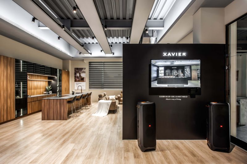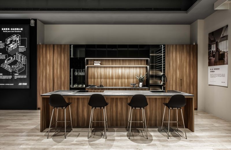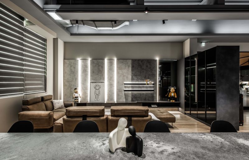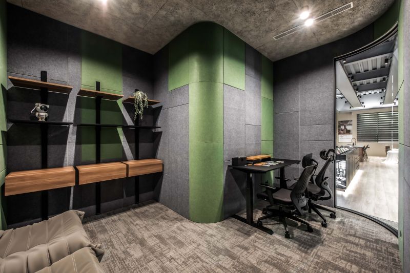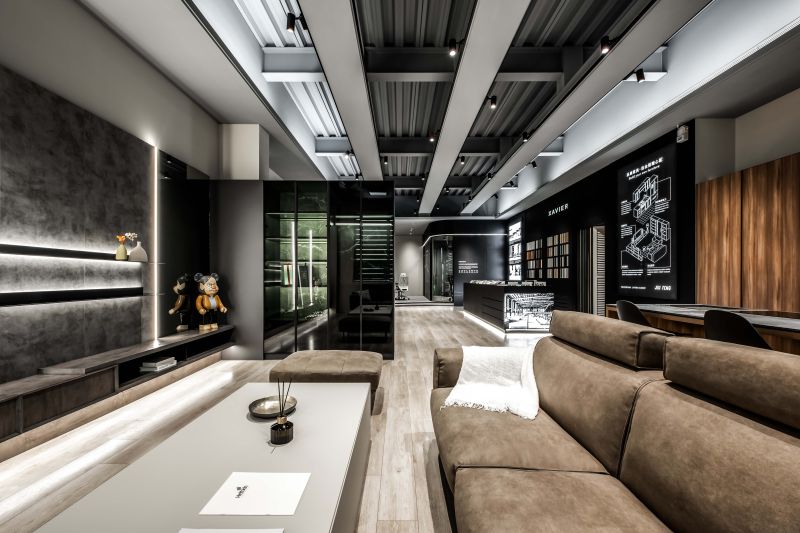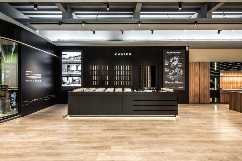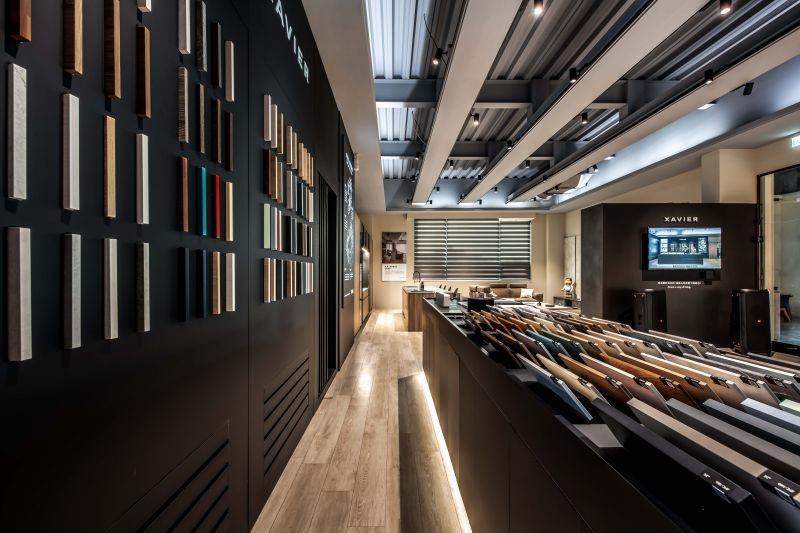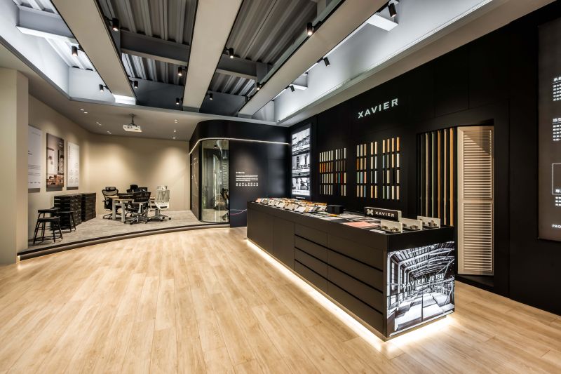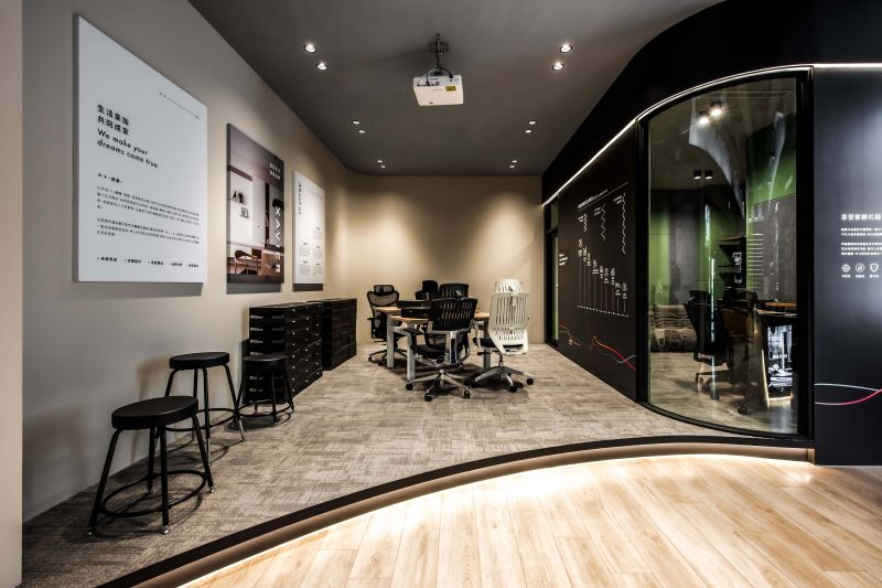At first sight of the showroom, an exquisite sample material display set off by a murky façade renders a reposeful and noble style. Supported by the recessed linear lighting beneath the cabinet, the space looks bright and rich-layered. Besides, natural wood tone flooring reveals a modern appeal with the mild light. Organized wall display presents various colors and textures of the building boards.