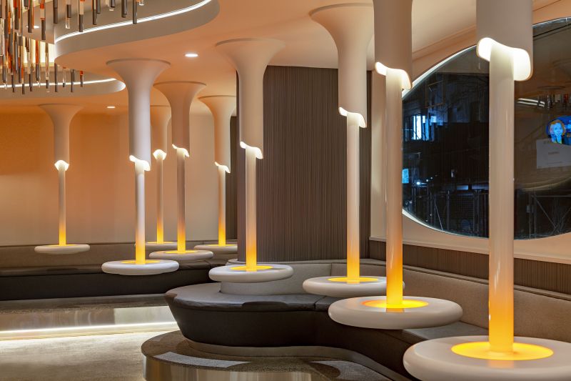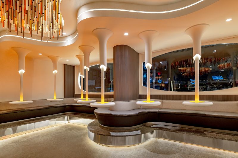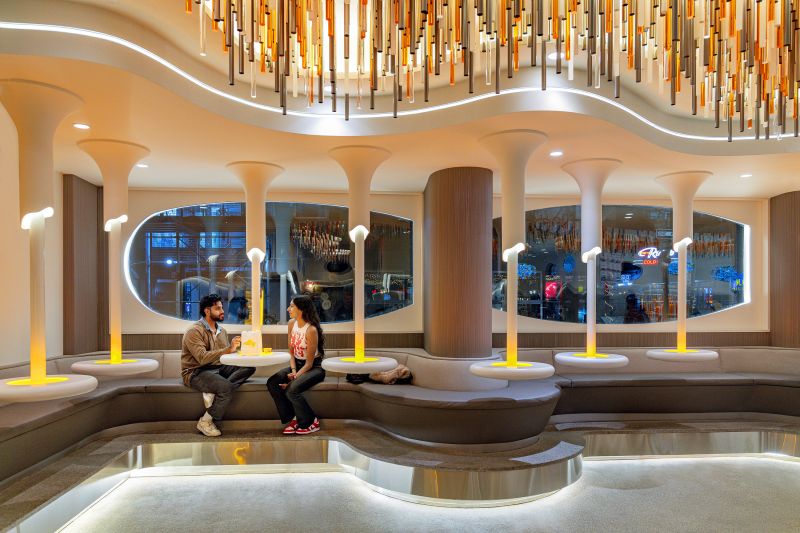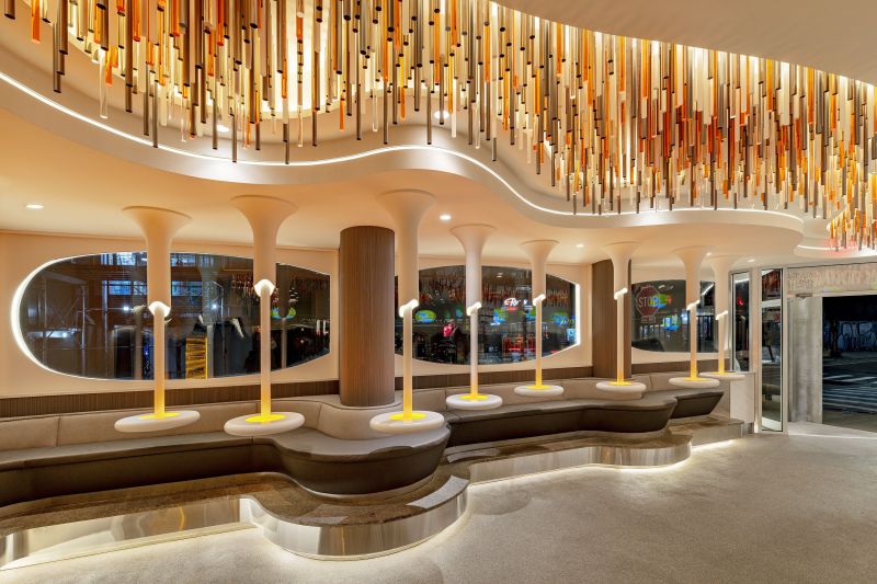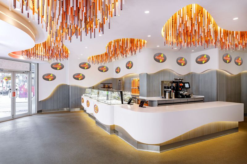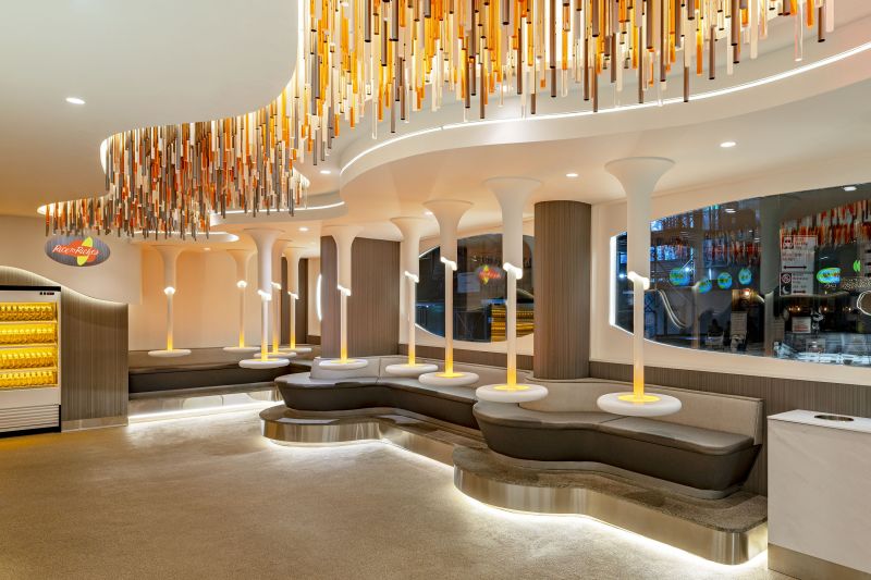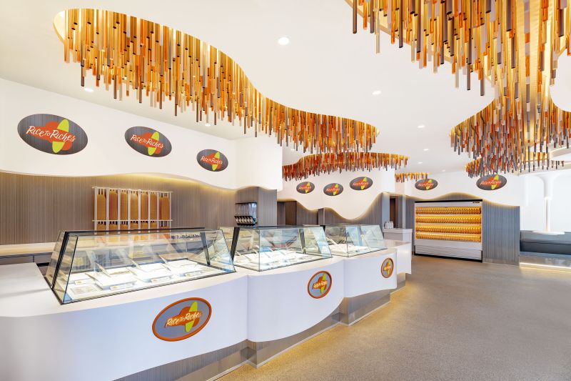 Inspired by the shape of rice grains, as well as the consistency of creamy pudding, the firm created a curvaceous retail and eating environment. Walls are layered with a continuous form that undulates up and down around the space. The pudding retail display case has a similar vocabulary, as do the ceilings with their irregular-shaped lighting recesses.A playful, wavy banquette wraps the entire storefront wall with oval windows above.