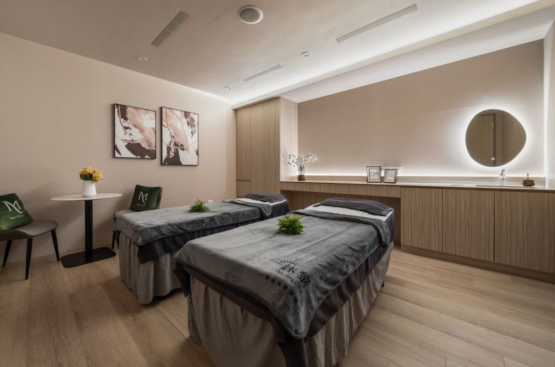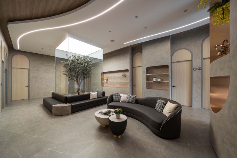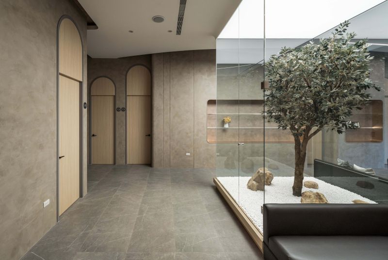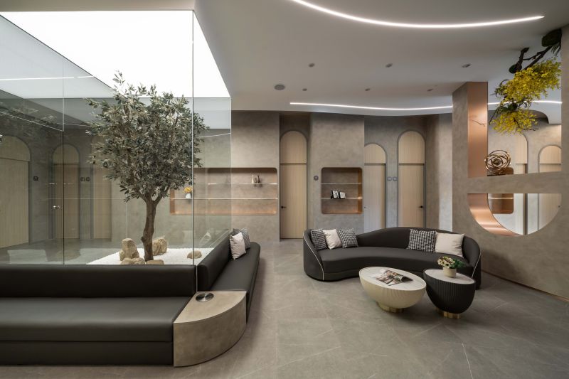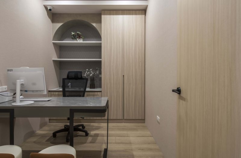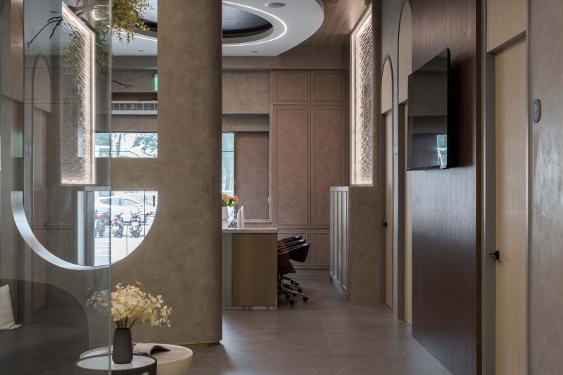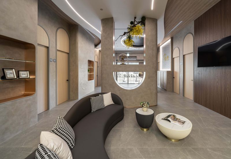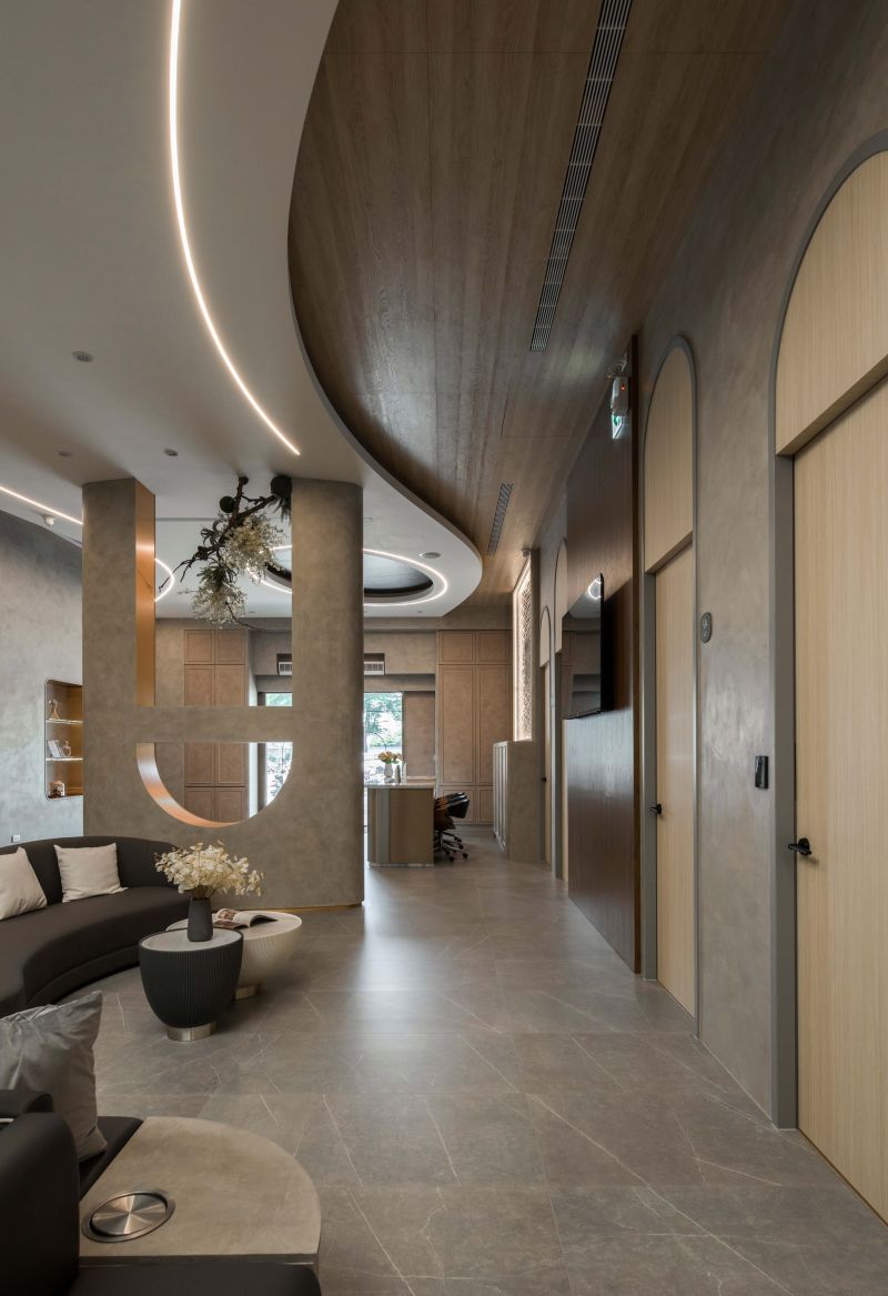 Embracing the ethos of “Creating Comfortable Spaces for Clients,” the design meticulously blended warm gray tones with rich, soothing wood elements.