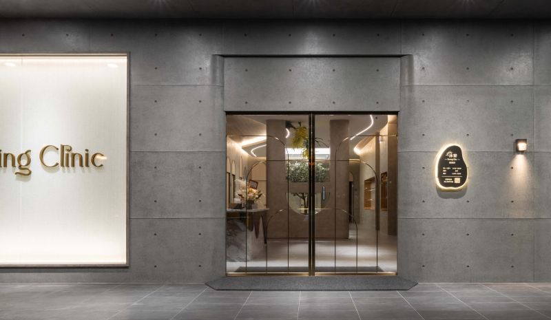 The exterior of the building features fair-faced concrete walls, complemented by a serene color palette that accentuates the pure white logo window on the left, creating a conspicuous and vibrant appearance.