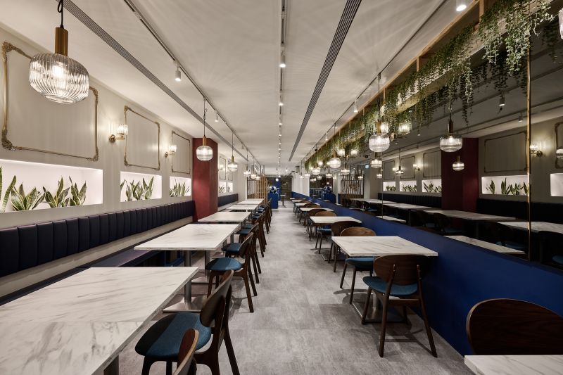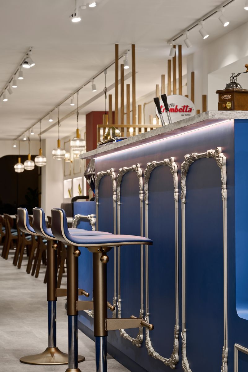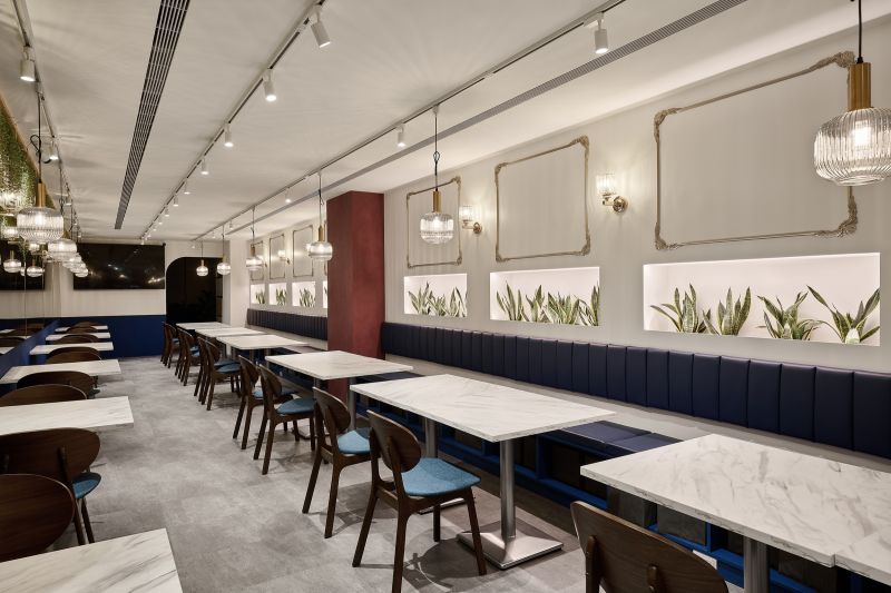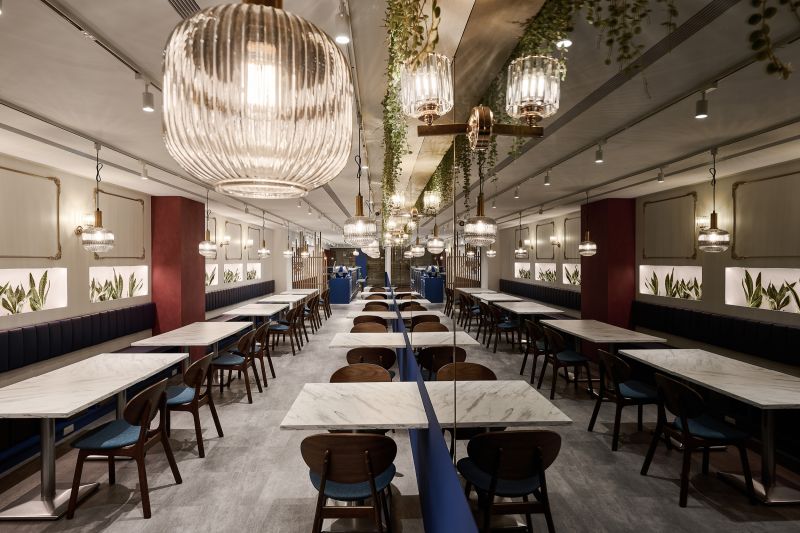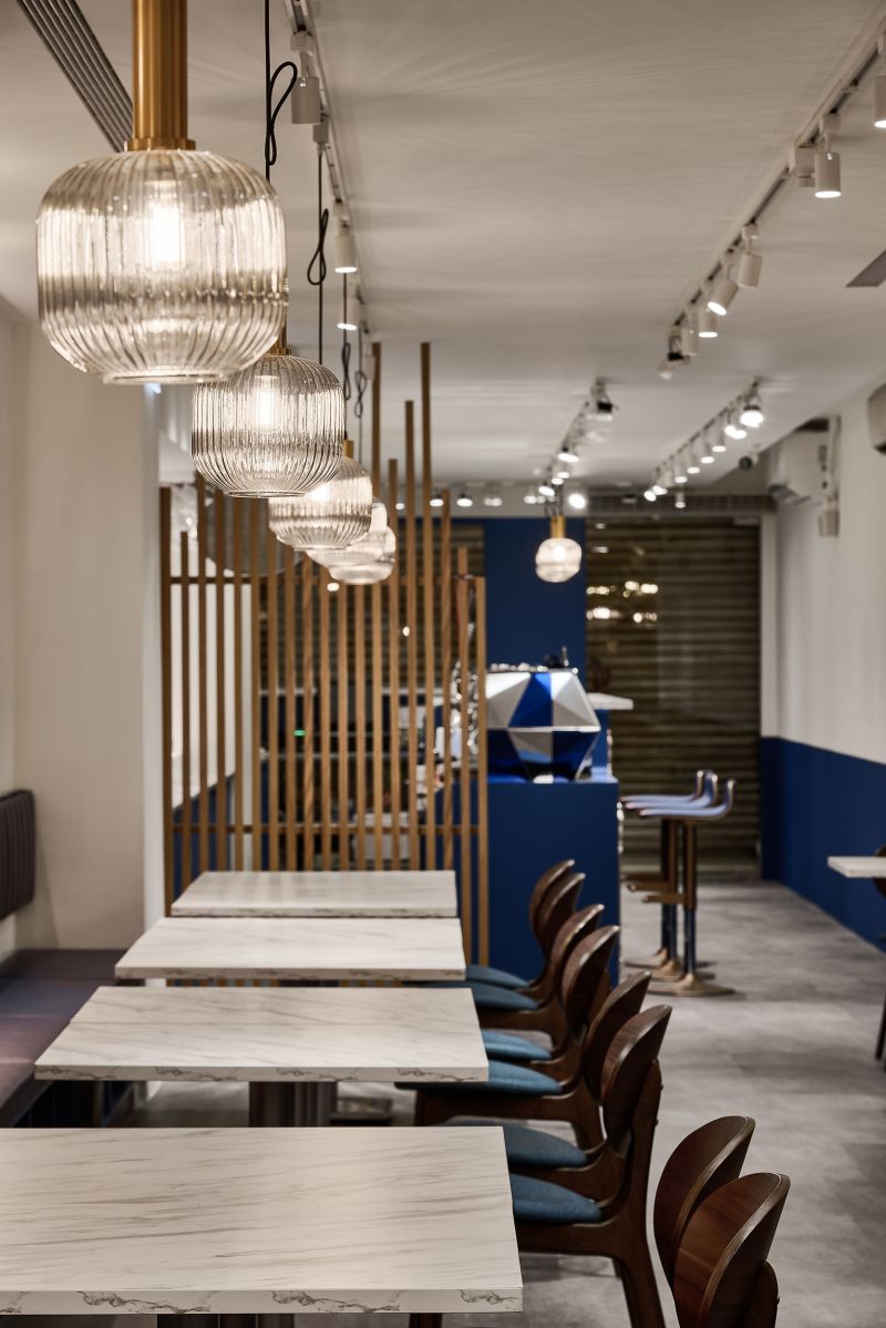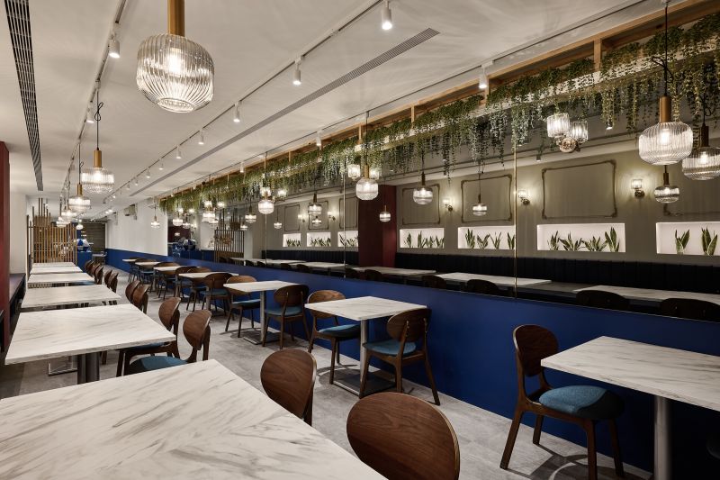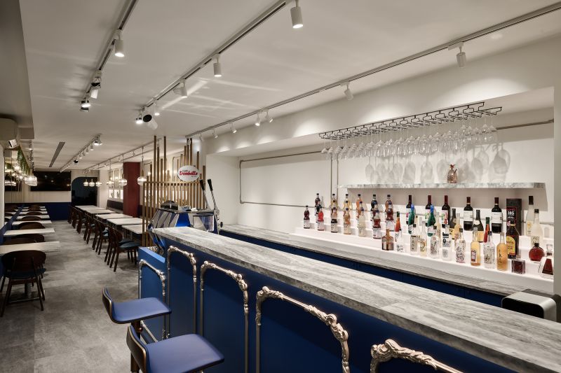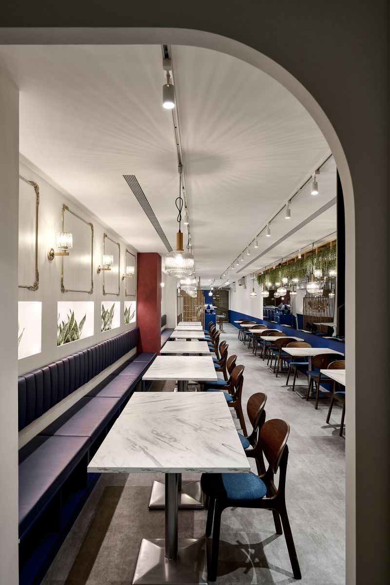 The restaurant is located in the center of the city, and the overall space is a mixture of old-world style and European luxury, with a lot of white space on the walls, vintage red paint on the columns, and wooden screens and chairs, as well as indigo blue with gold stitching, and even the toilet floor is made of contemporary tiles, which satisfies the different style preferences of the restaurant operator and the chef.