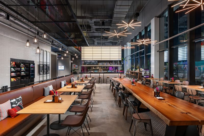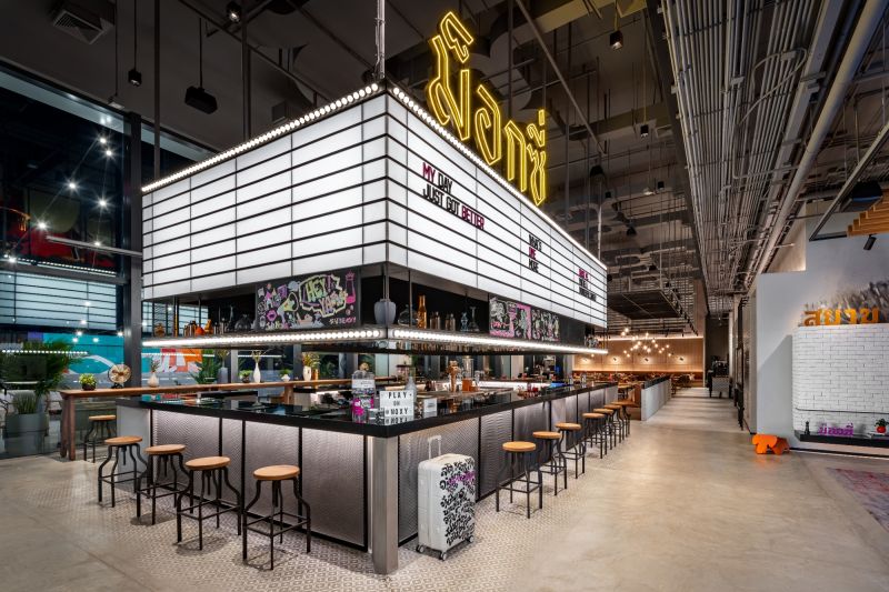 The Moxy Hotel on Ratchadamri Road, Bangkok, spans approximately 1,625 sqm. The design team from Lifestyle crafted an interior that blends urban sophistication with local cultural elements. Inspired by Bangkok's vibrant streets, the design features a dynamic and immersive environment. Key elements include an exposed concrete aesthetic, warm wood textures, and vibrant accents that enhance the hotel's youthful and energetic vibe. The multifunctional bar area serves as a central hub, offering both a check-in space and a lively social spot, ensuring a memorable guest experience.