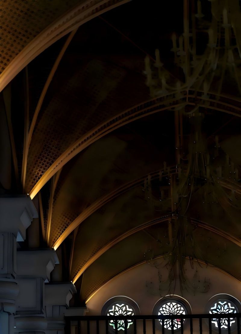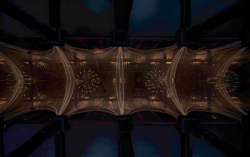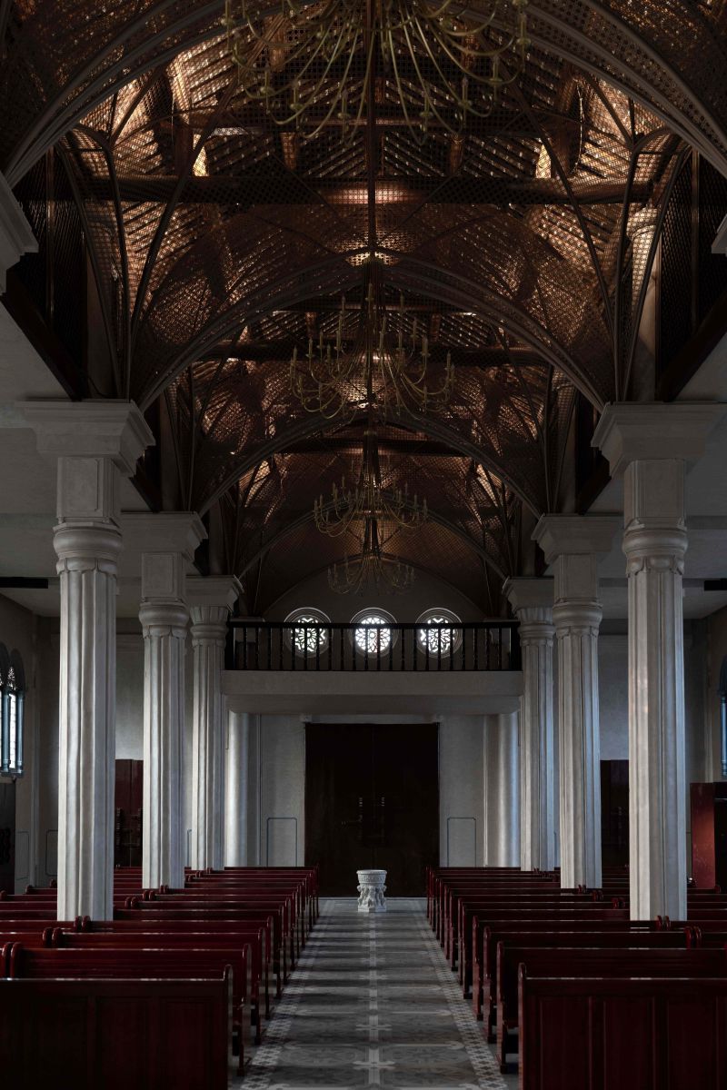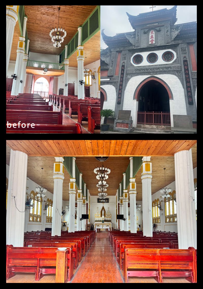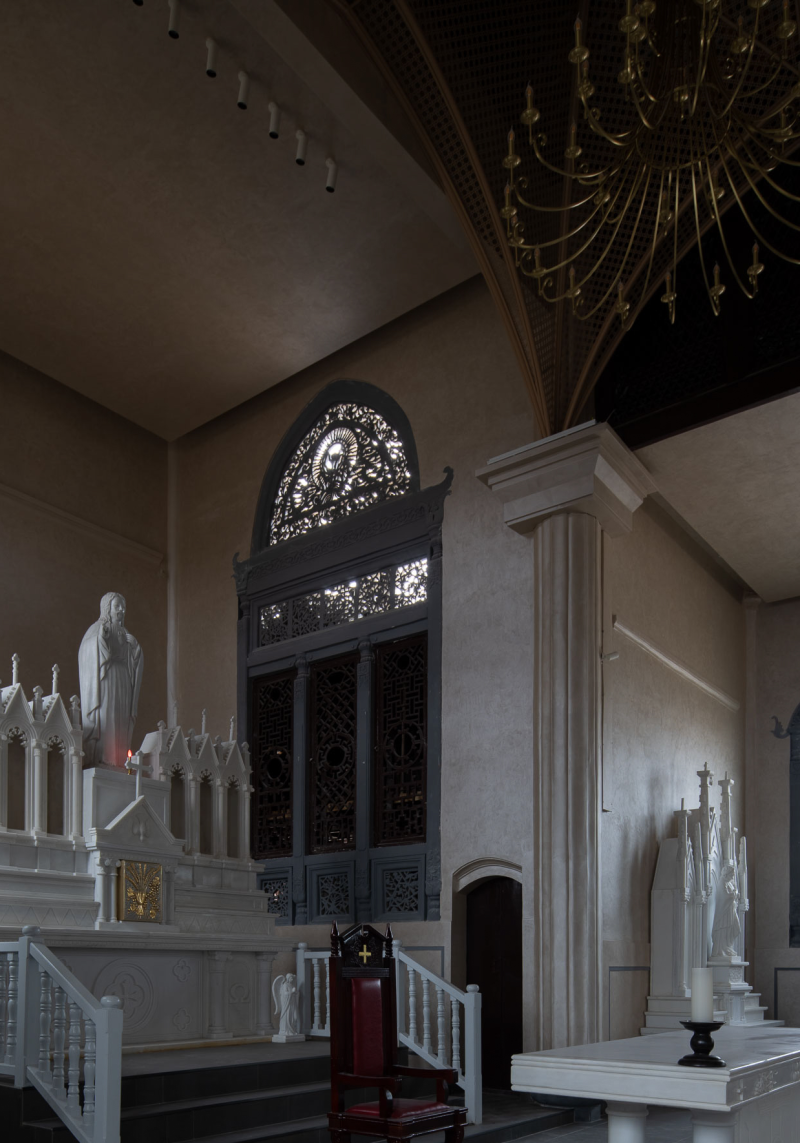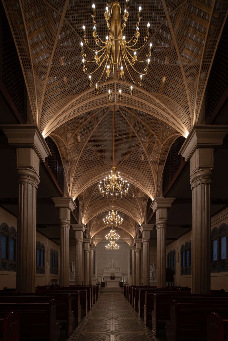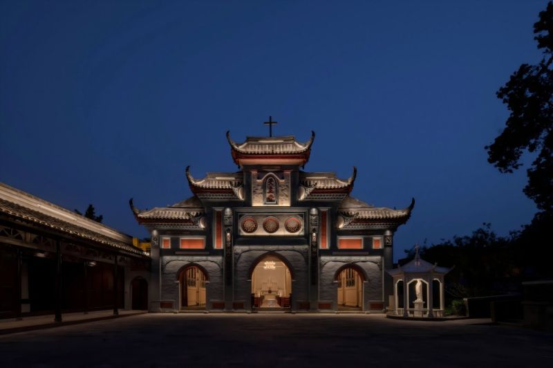 The Catholic church in Chengdu was originally built in 1802. Through cleaning and structural restoration, layers of gold were removed to reveal the original brick carvings and restore the natural color of the bricks as much as possible. The design incorporates bamboo weaving patterns into the Gothic-style mesh vaulting, with stainless steel material used for the weaving. 成都的天主教堂,最初建于 1802 年,通过清洗和修复结构以去除层层黄金,尽可能地恢复原来的砖雕,露出原有的砖石色彩。该设计将竹编的纹理融入到网状哥特式拱顶中。不锈钢材料用于编织。中央过道地板以马赛克图案为特色,瓷砖设计源自原始窗户图案。照明设计包括六层