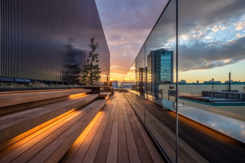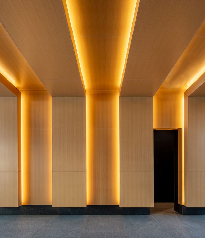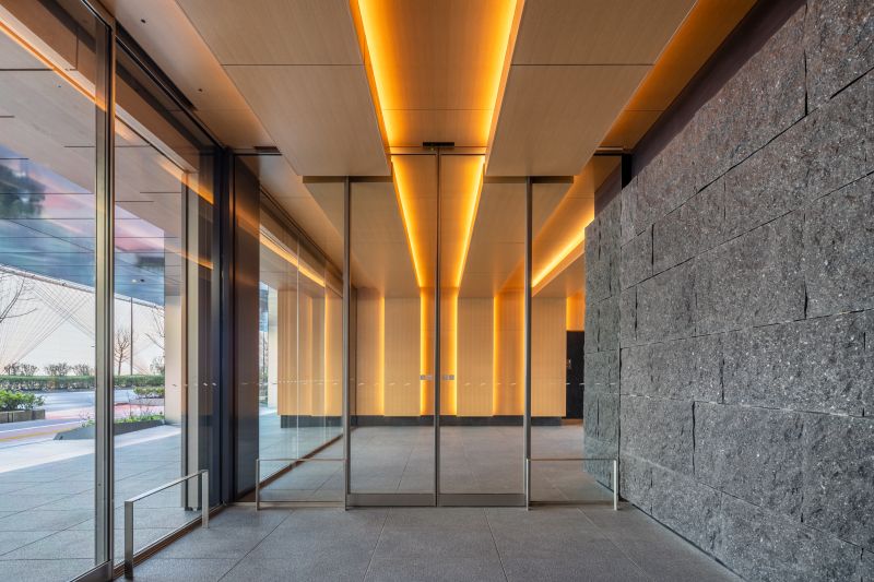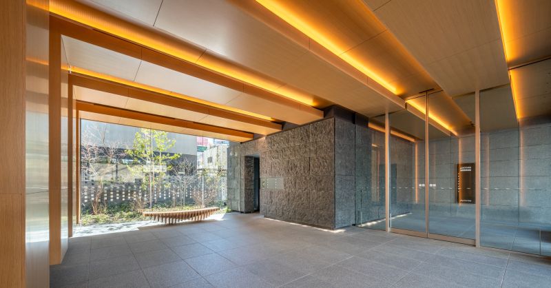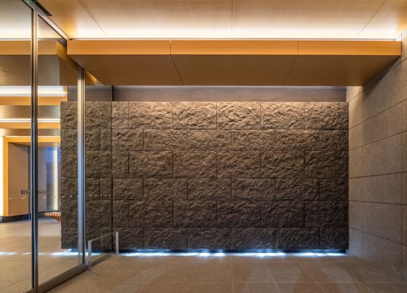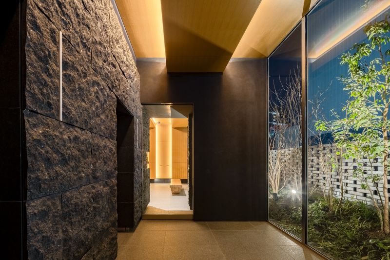 This is an office entrance project located in Suidobashi, Tokyo. The name ‘Suidobashi’ derives from a bridge built for water infrastructure four centuries ago. Referring to the historical elements of Suidobashi such as the bridge, revetment, boats and ripple, this entrance gives the feeling of passing under the bridge. Wood, stone, soil, and plants presents a warm and luxurious experience. The space creates connection to the surrounding city and history, which allows workers to switch off from work and relax.