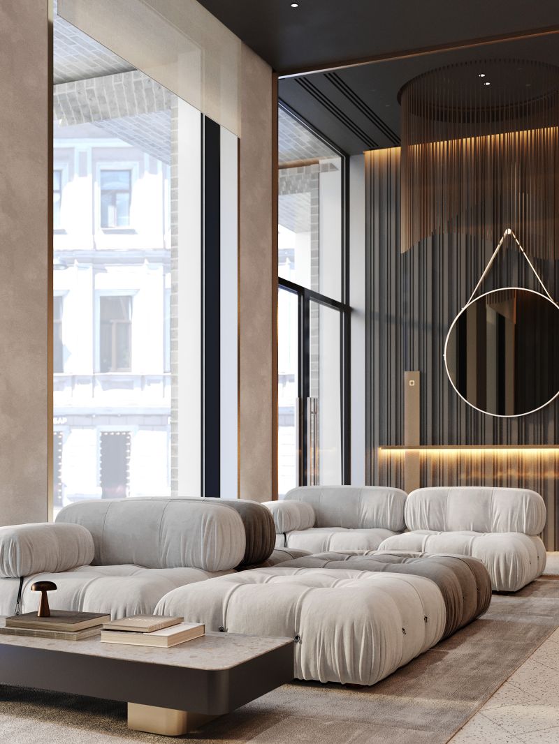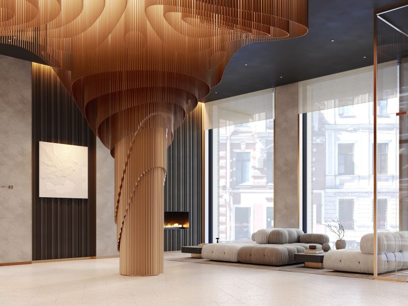 IDEOLOGIST created a unique lobby design for a boutique residence in Moscow, combining modernity and the district's weaving history. By reimagining space as a fabric woven from historical and modern threads, the design features architectural elements that mimic weaving techniques. Intricate texture play and layered lighting evoke the tactile sensation of textiles, with standout elements like a column resembling a scroll of fabric and a reception backdrop that hints at loom-stretched threads.