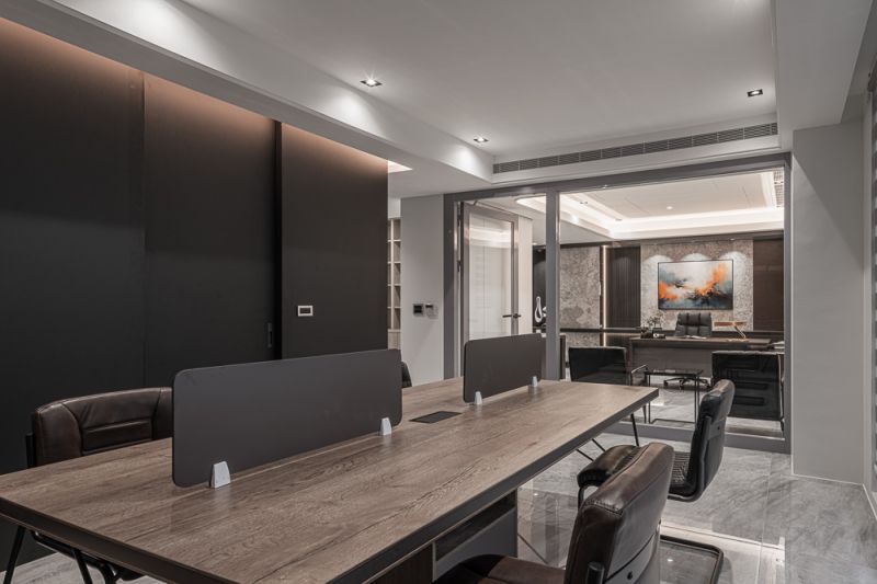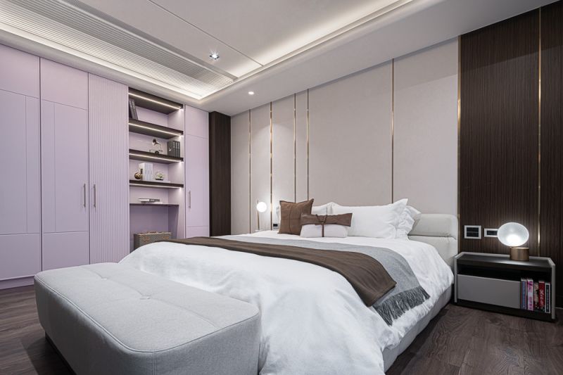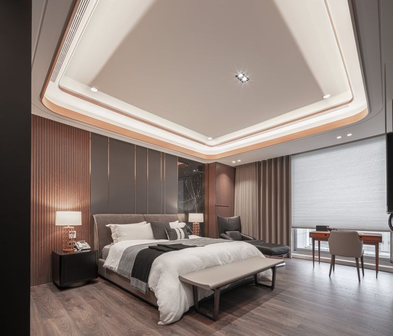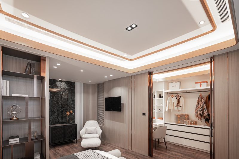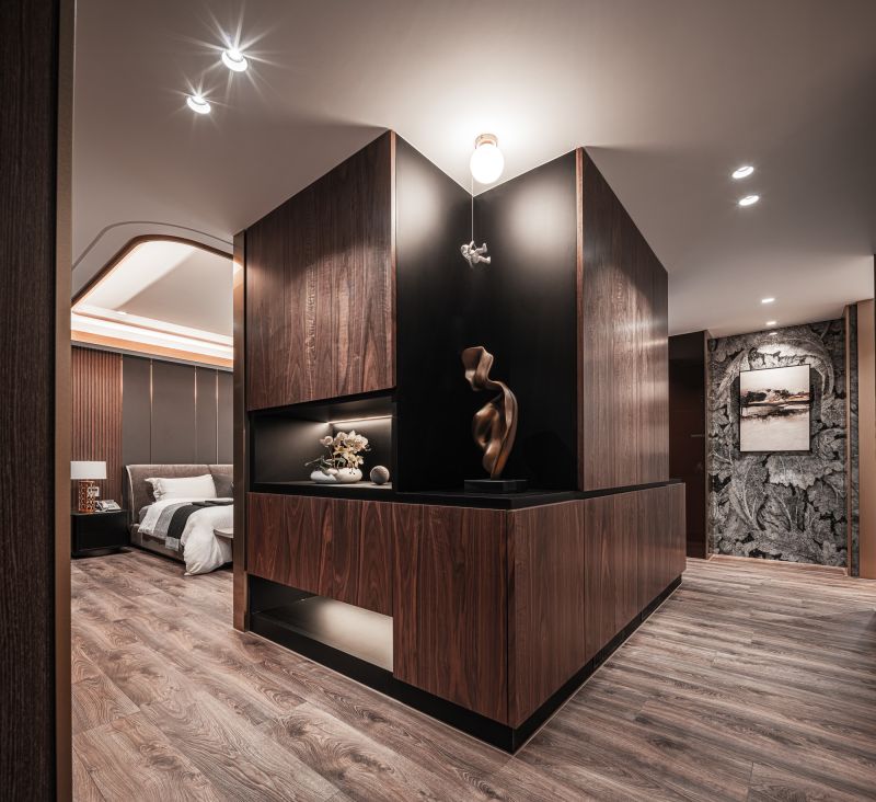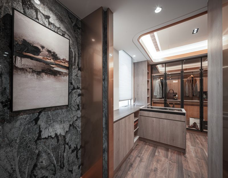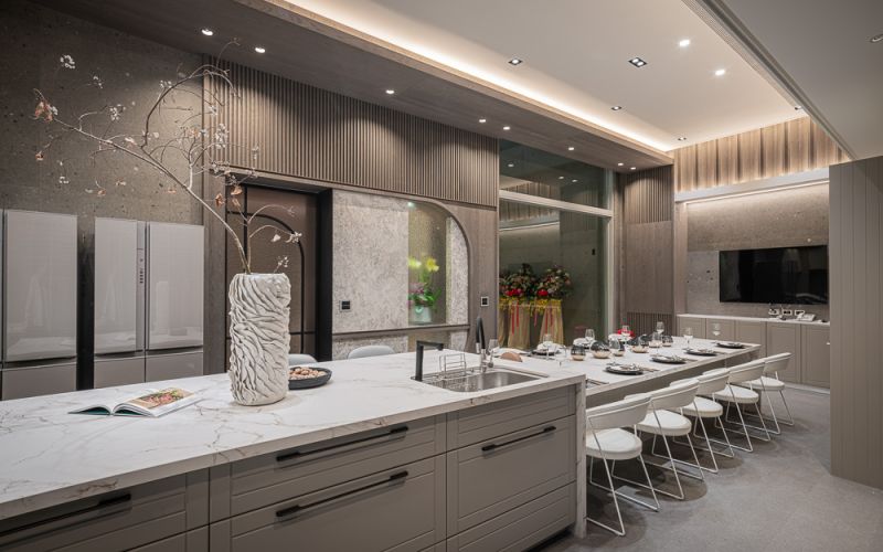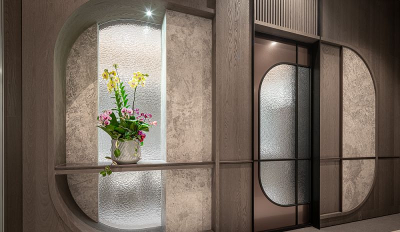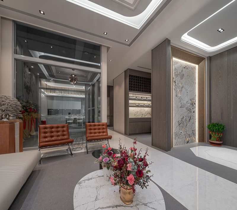 The owner, leading a large family business, envisioned a building that blended the ambiance of luxury hotels with the functionality of a home and office. The residence has been designed to captivate guests, serve as a tranquil and efficient workspace, and provide a comfortable and serene environment to live in for the residents. A profusion of layered ceilings diffuses soft lighting, enveloping the space in a soothing atmosphere. The overall design uses a lot of textured materials to achieve an opulent and sophisticated atmosphere.