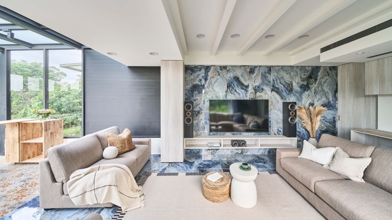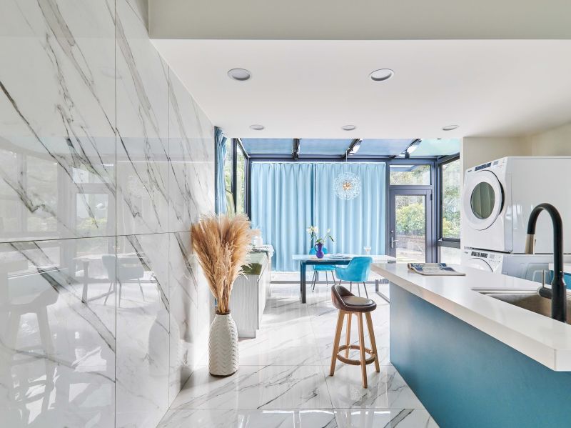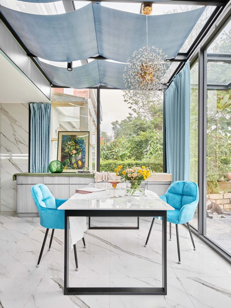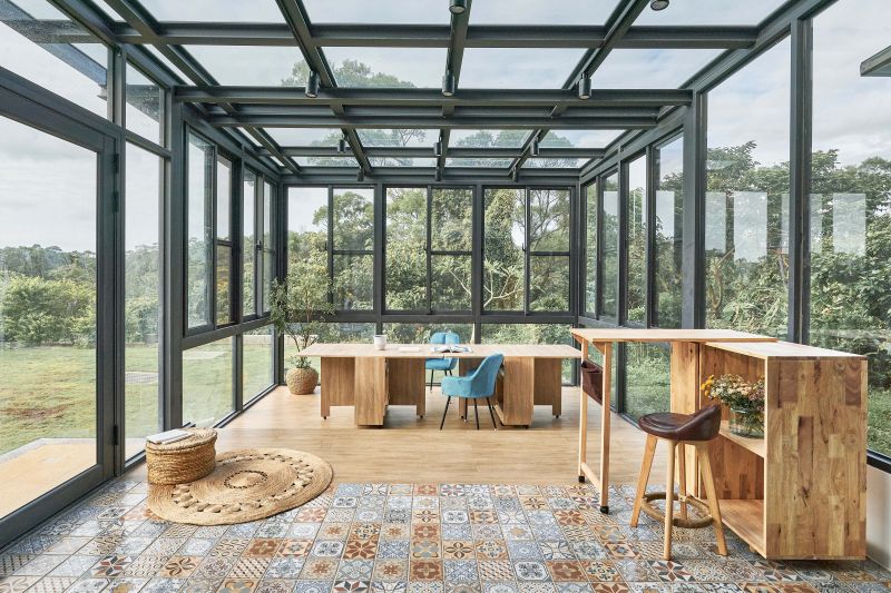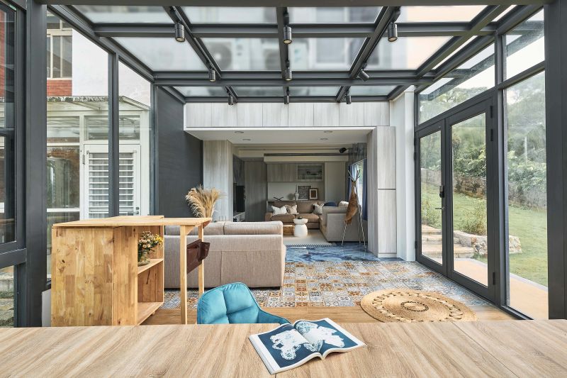 Considering the high humidity of the site, the design team adopted wood-look tiles against hardwood flooring, which is hard to care for. In addition, the clear glass lined with UV film provides maintenance and heatproof solutions