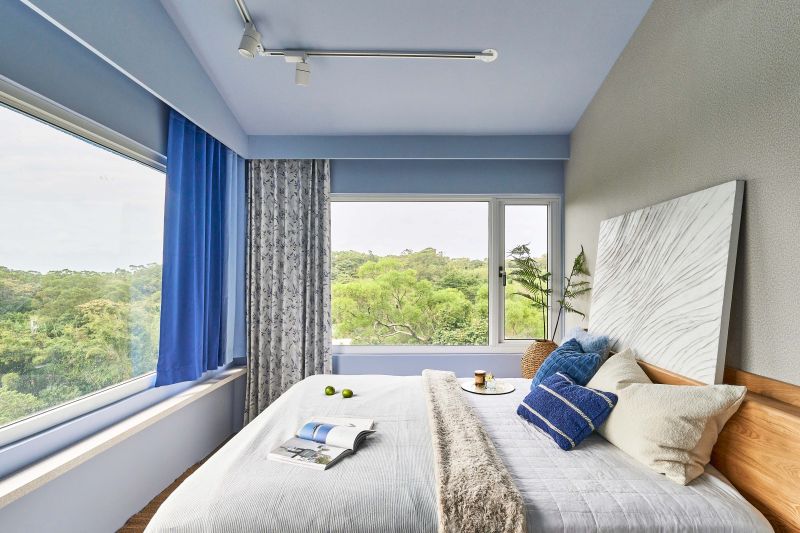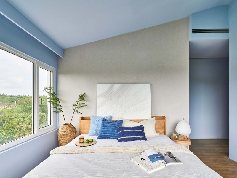 The interior brimmed with azure sky blue setting off wood textured headboards and floors invites a natural accent from the window as the sea melts into the sky
