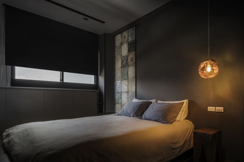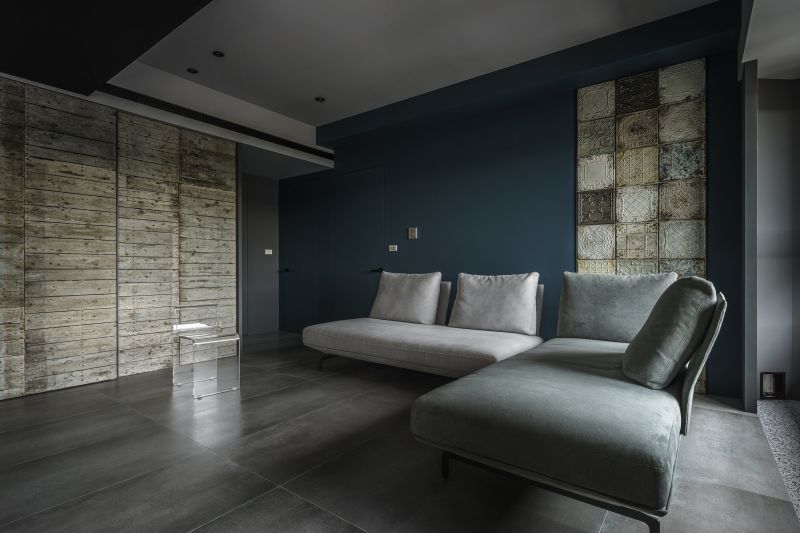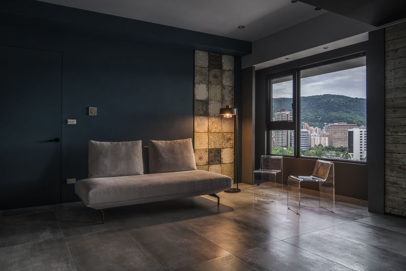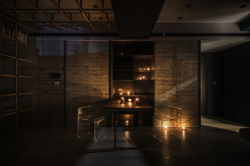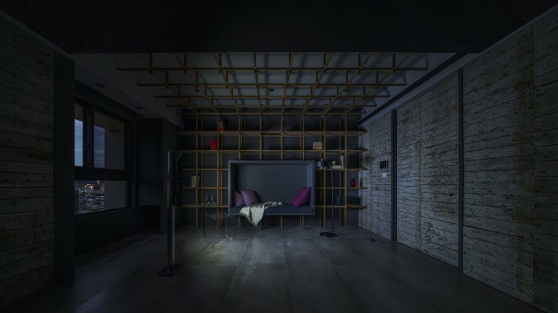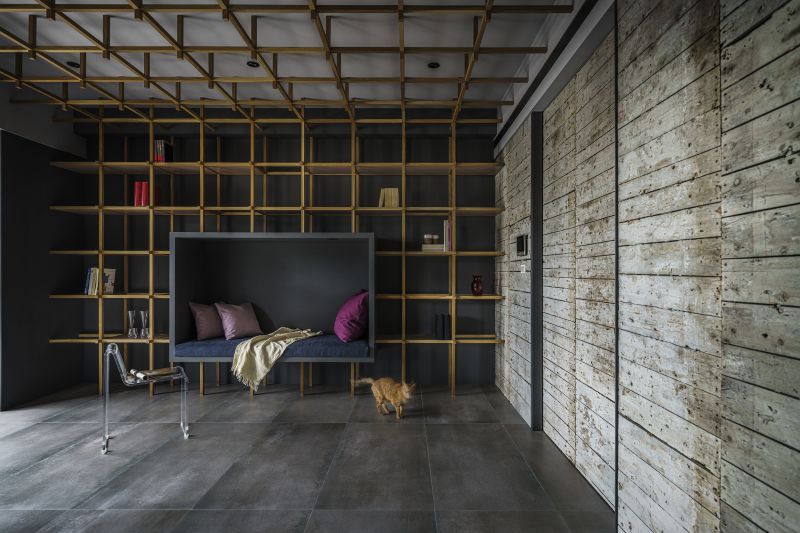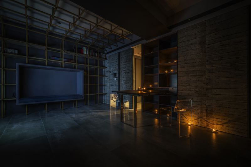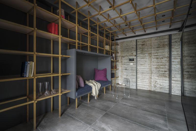 With cement formwork as its backdrop, the open bookshelves covering the whole wall display the owner’s collecting habits. The wooden materials extend to the ceiling, and in the reclining reading space, the reader can roam the ocean of books and language. The grey flooring and window wall yearn for the sunrays to splash over them.