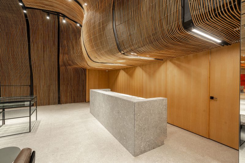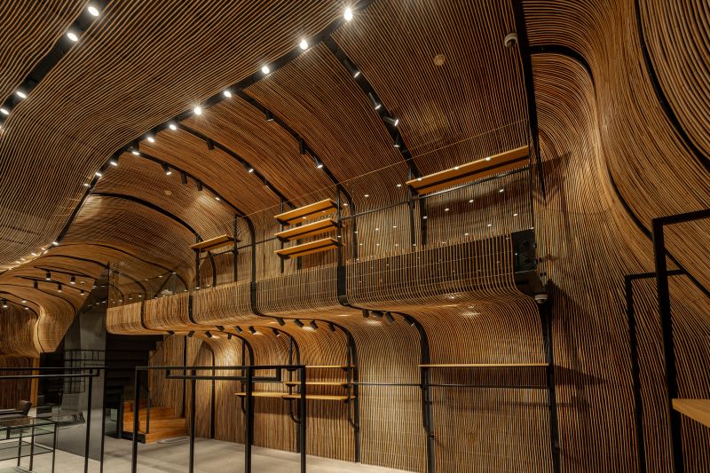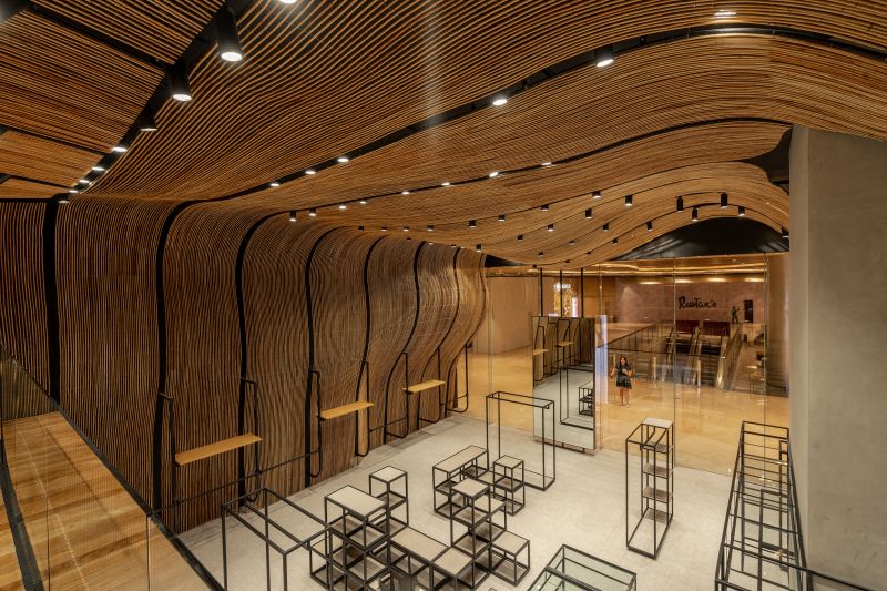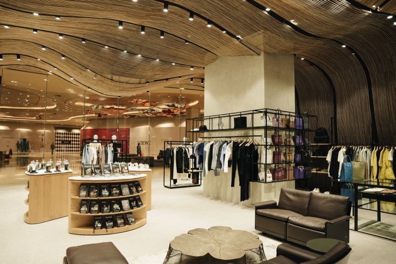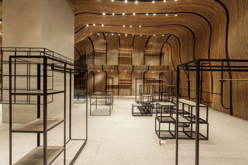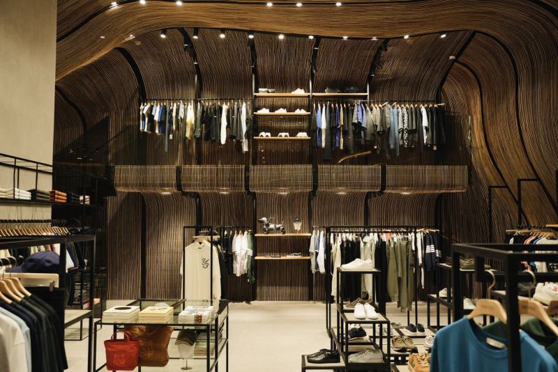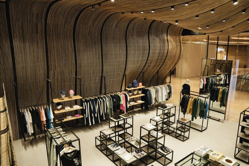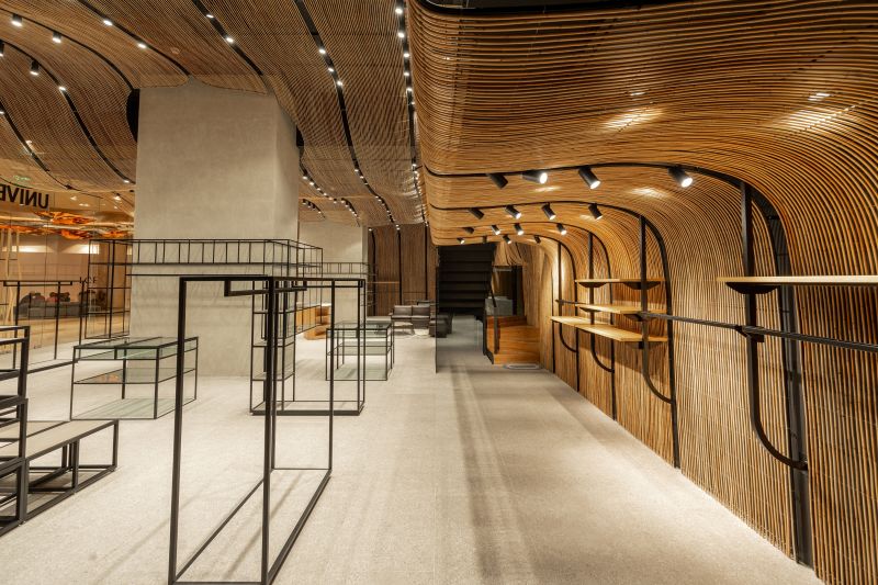 UNIVERS NUSTAR merges luxury fashion with local craftsmanship, featuring an undulating rattan installation on the walls and ceilings. This design softens modern architecture, blending contemporary and traditional elements. The rattan also acts as a space divider, providing intimacy without solid partitions. Transparent glass barriers highlight the rattan and contrast with the natural material. By combining local wicker with international brands, UNIVERS NUSTAR celebrates sustainability, craftsmanship, and cultural authenticity in a unique shopping experience.
